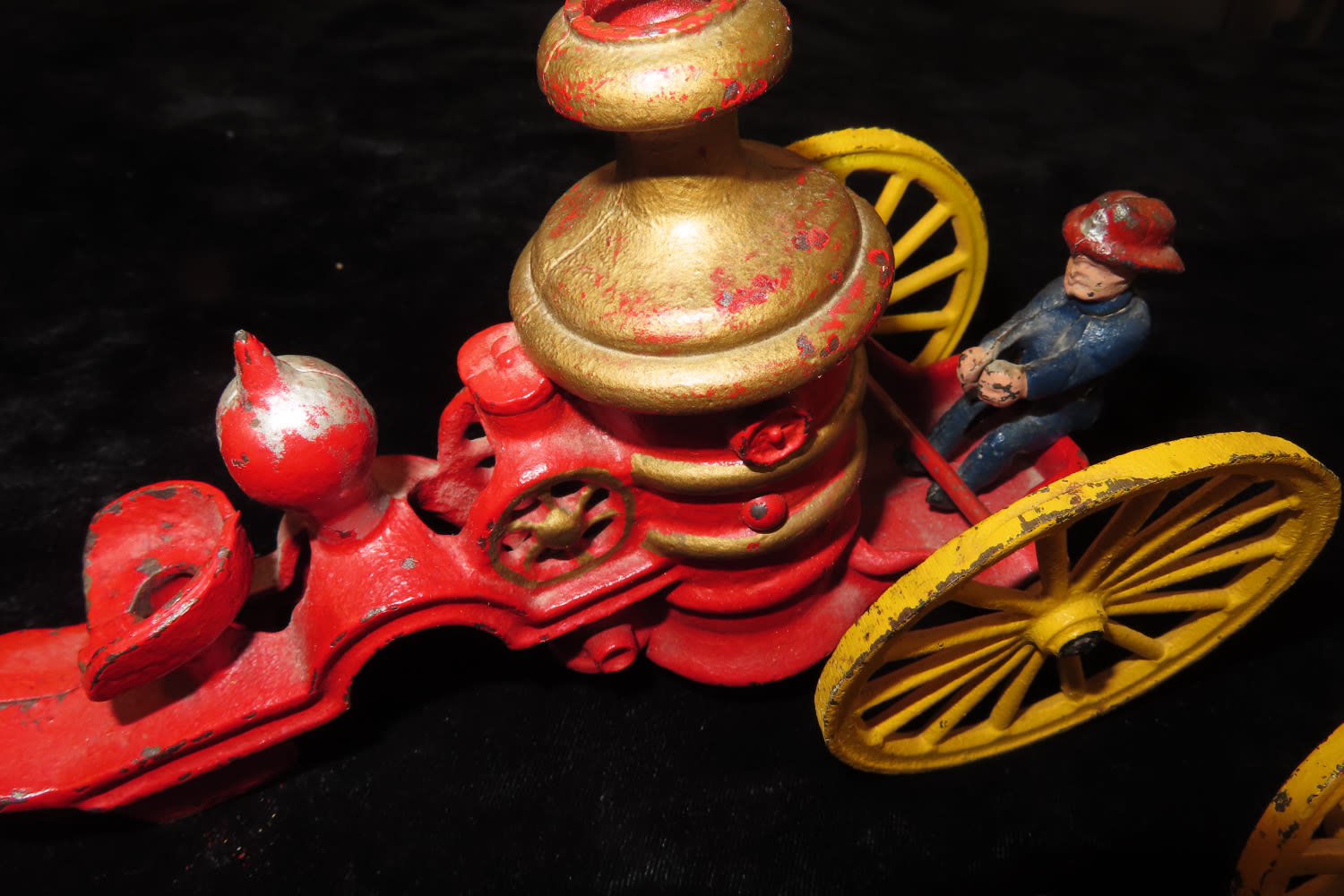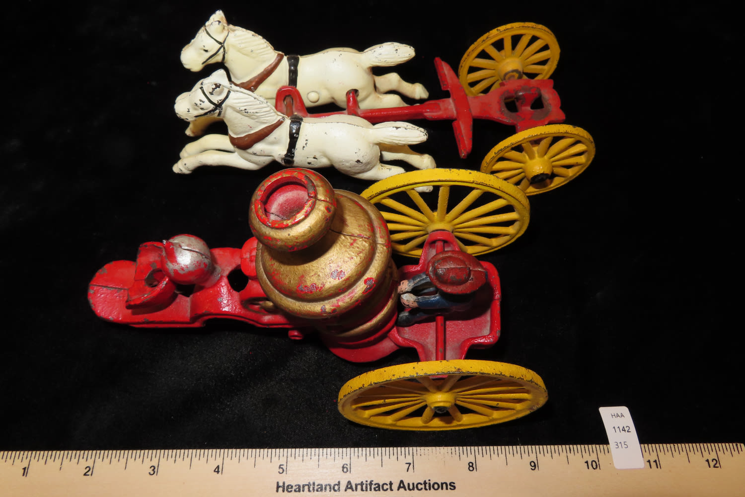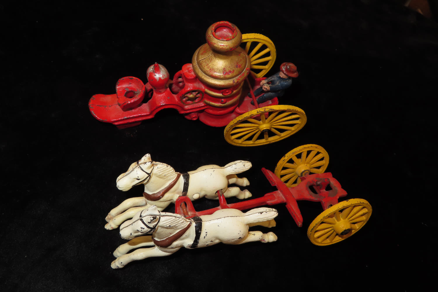 13″ LONG VINTAGE CAST IRON HORSE DRAWN FIRE TRUCK / WAGON WITH ORIGINAL FIREMAN