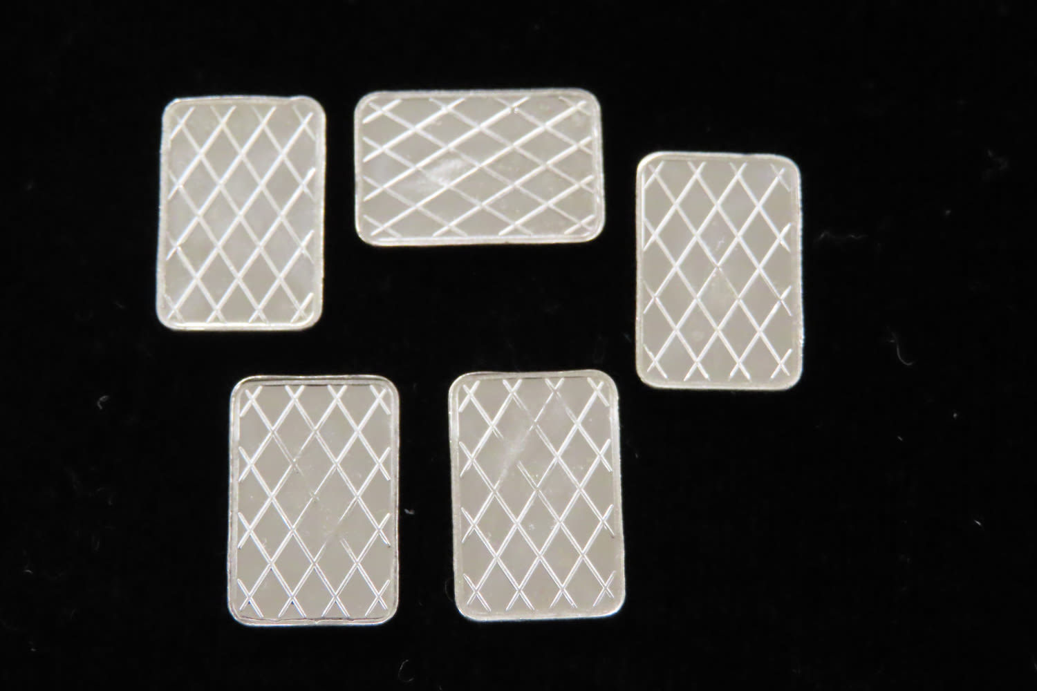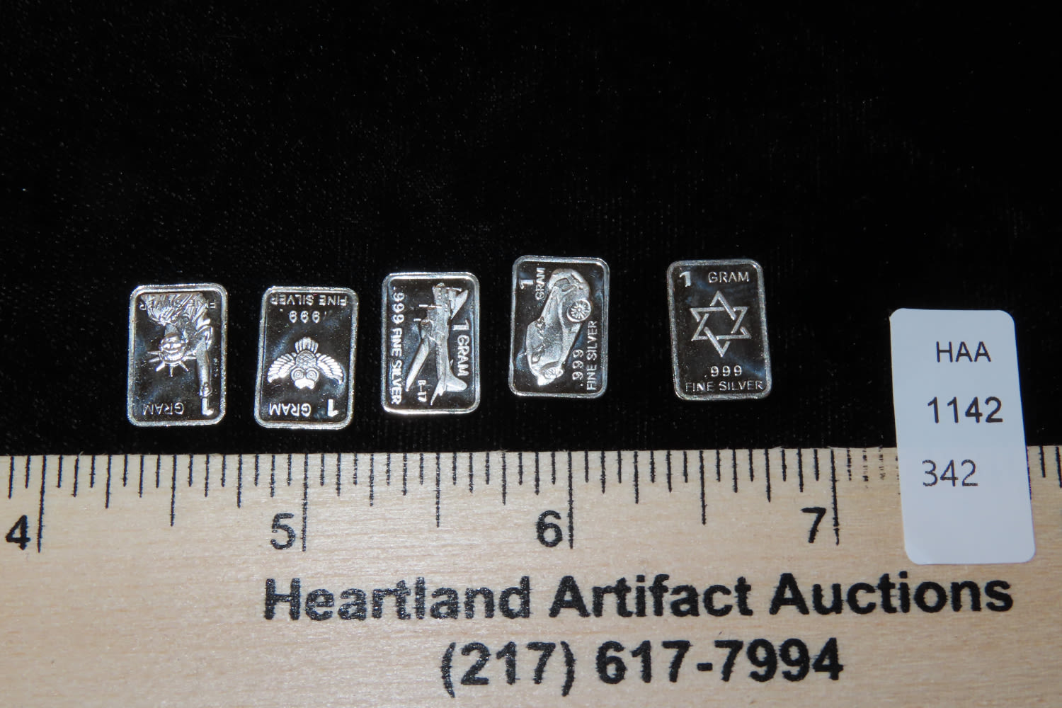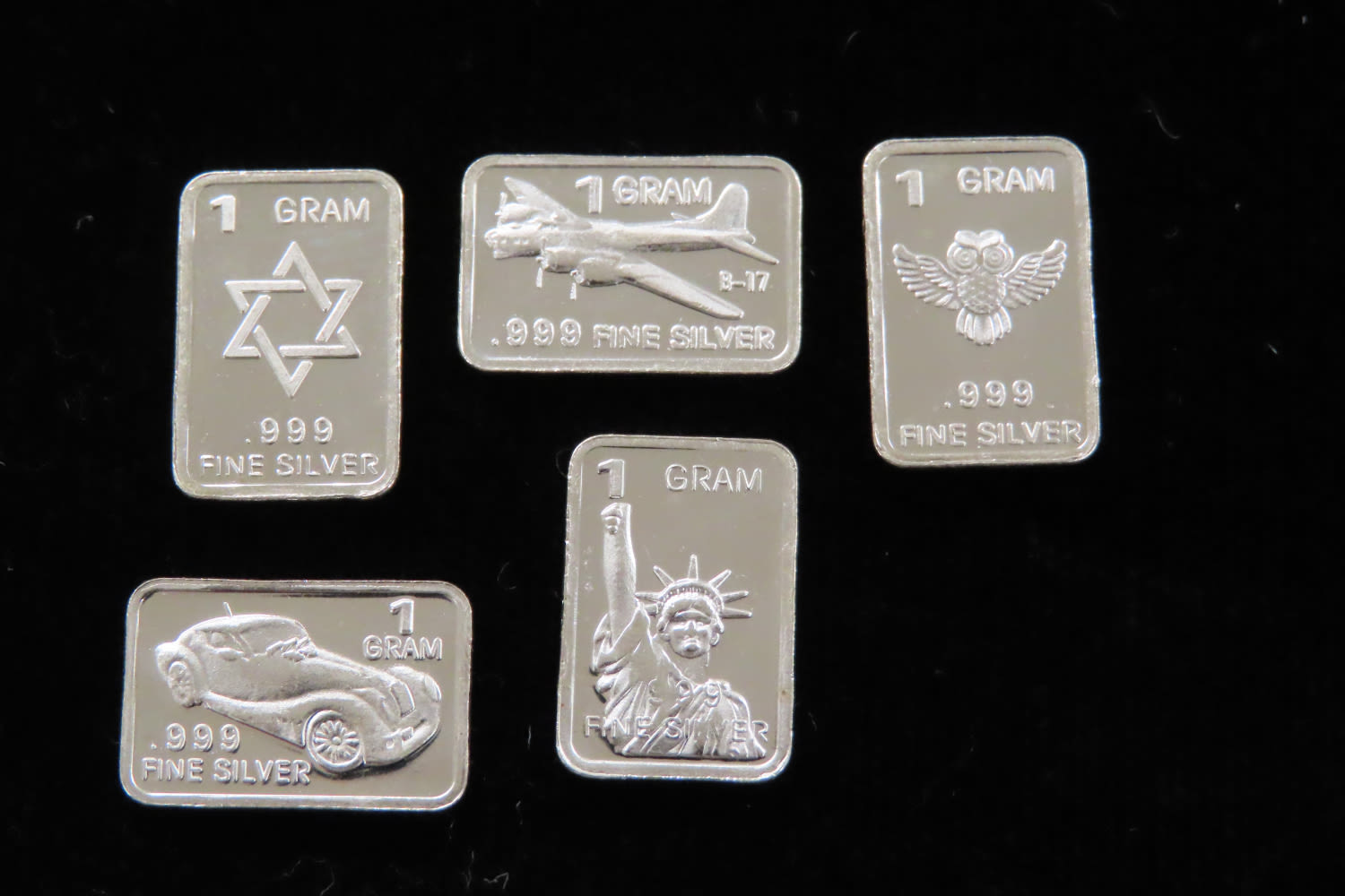 LOT OF 5 MINI SILVER BARS, 1 GRAM EACH, .999 PURE SILVER BULLION