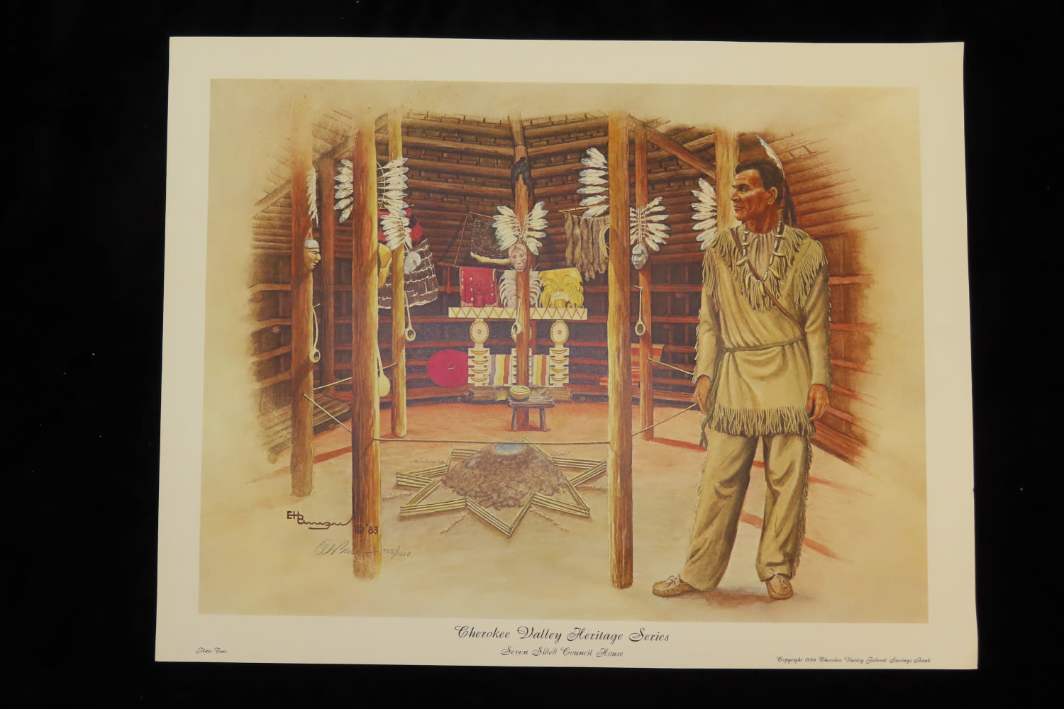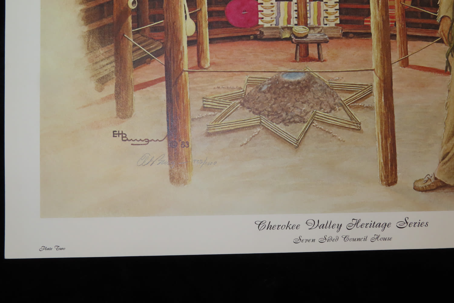 RARE CHEROKEE VALLEY INDIAN PRINT #723 OF 1000, 18″ X 24″ PLATE TWO “7 SIDED COUNCIL HOUSE,” SIGNED