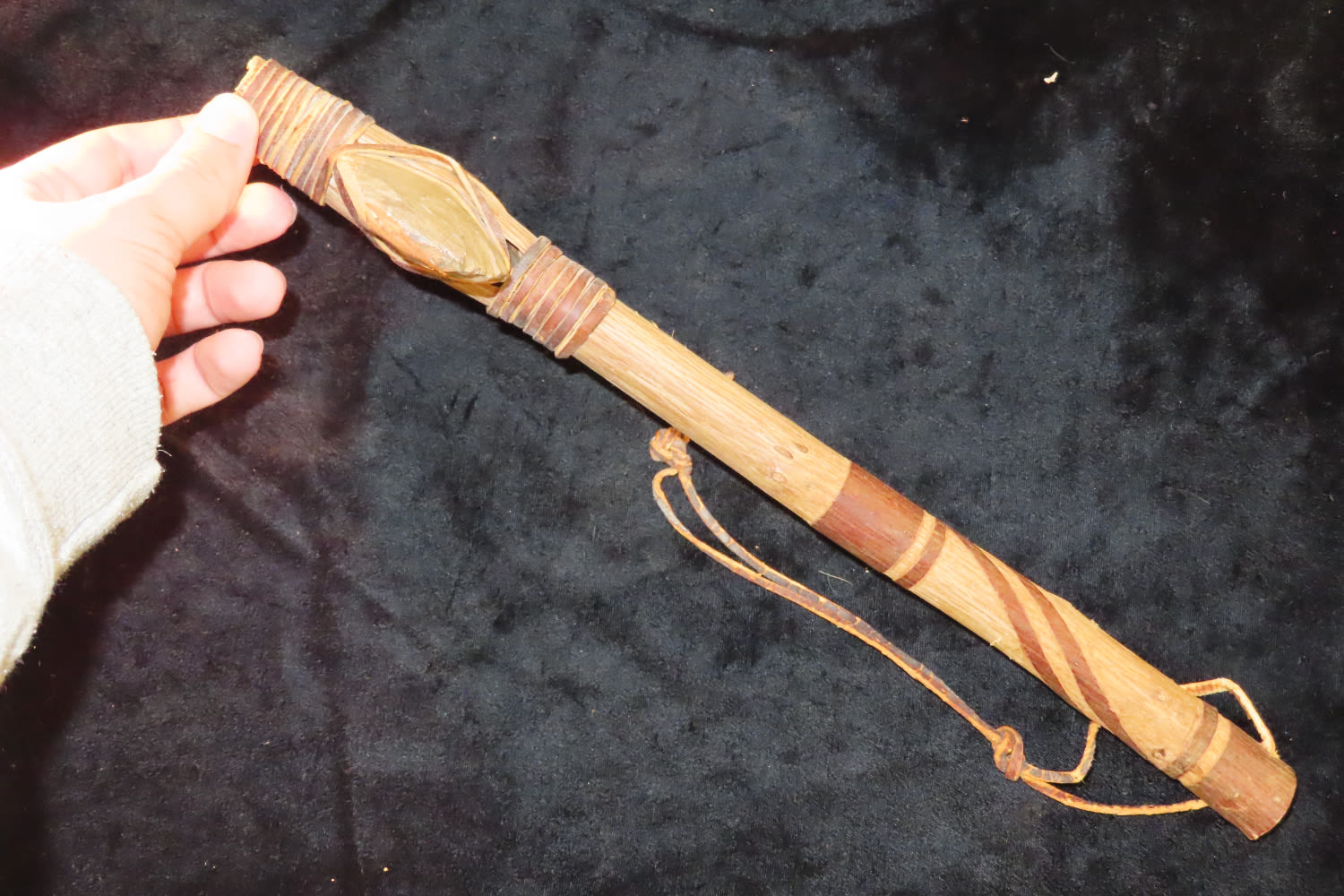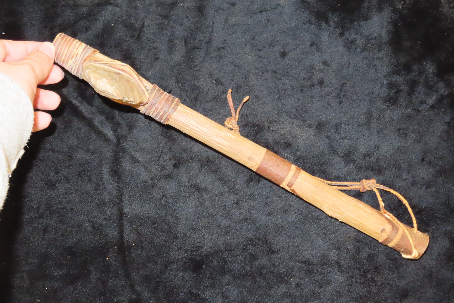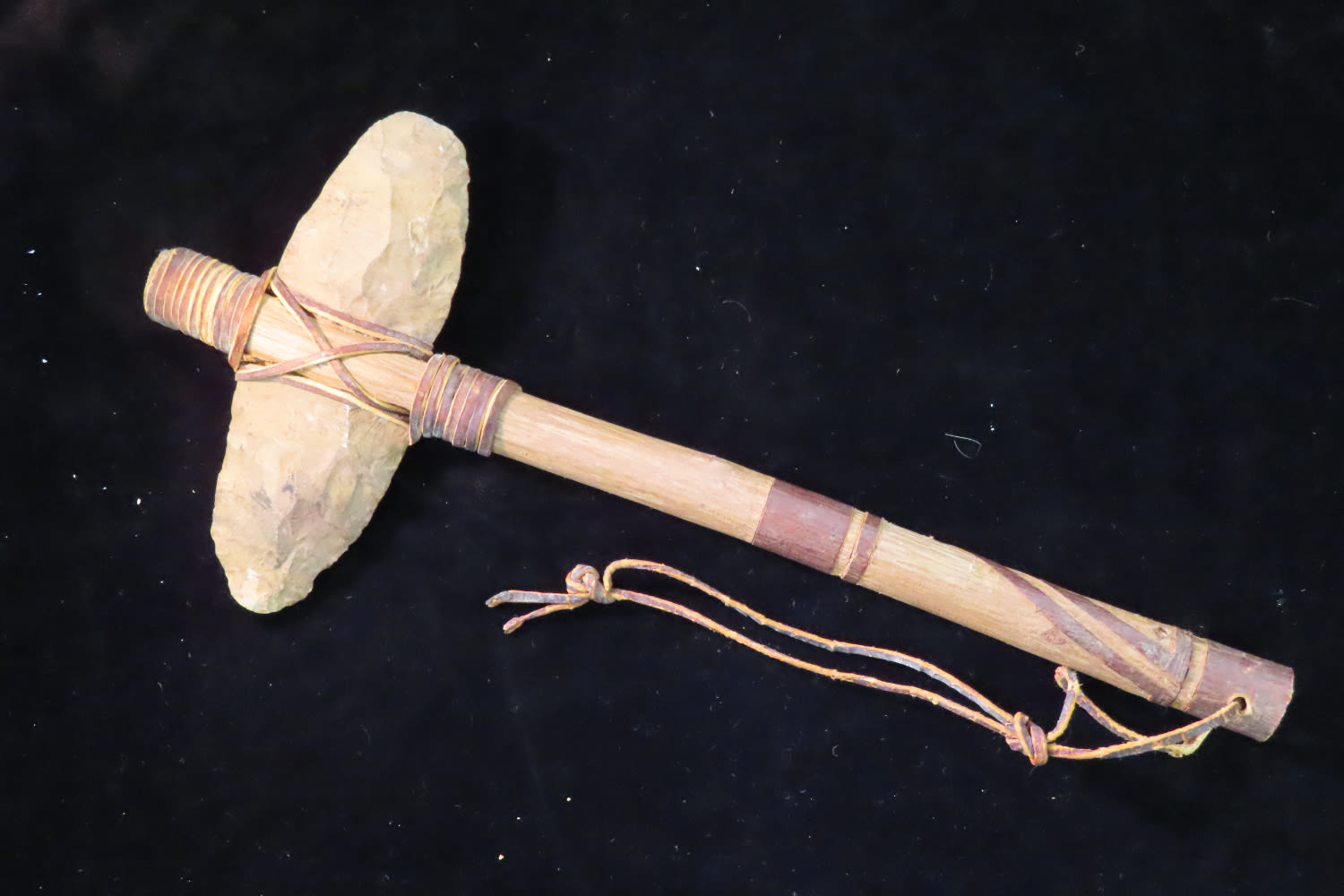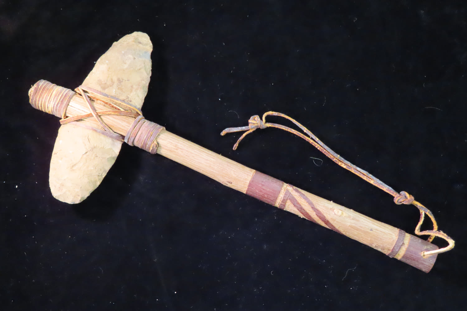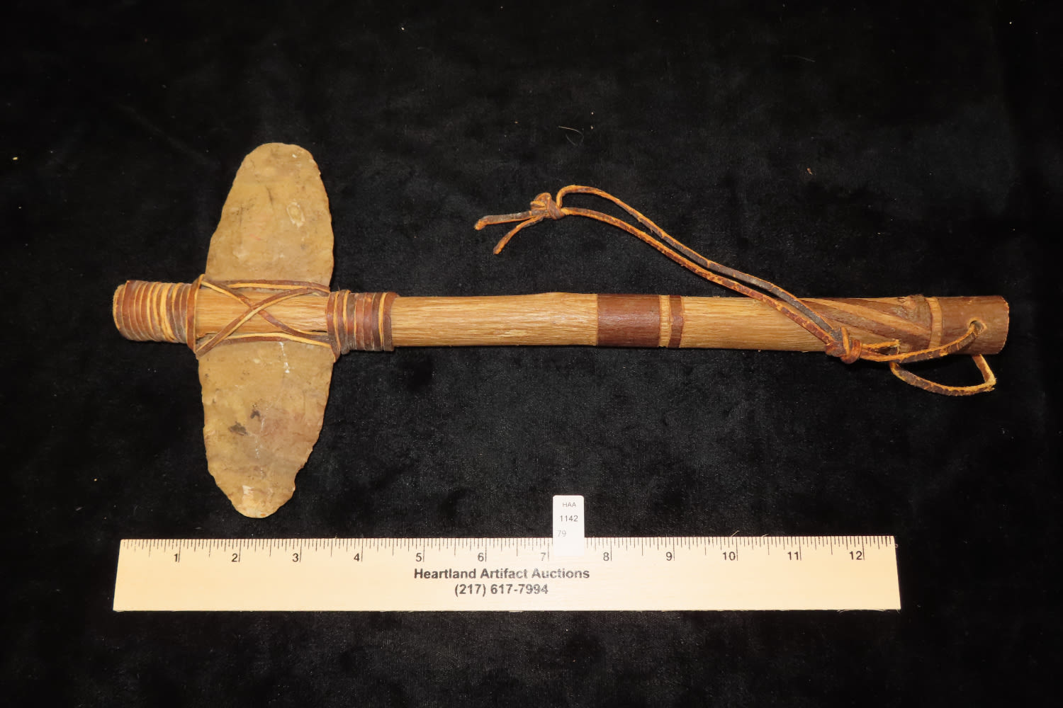 AUTHENTIC 6 3/4″ FLINT CELT FROM JEFFERSON CO KENTUCKY MOUNTED IN A 14 3/4″ LONG MODERN HANDLE, GREAT CONVERSATION PIECE