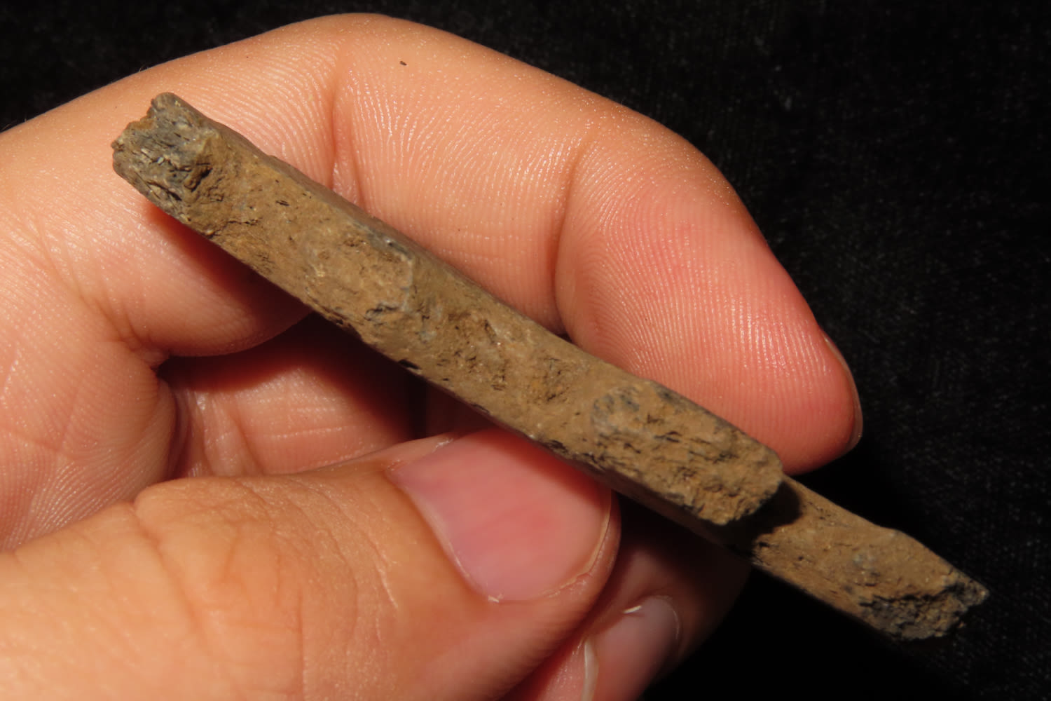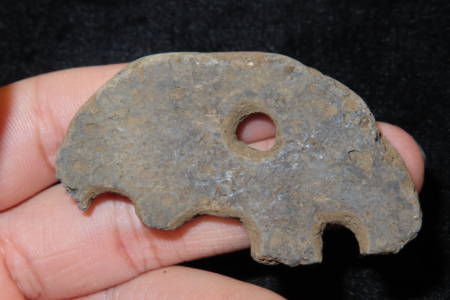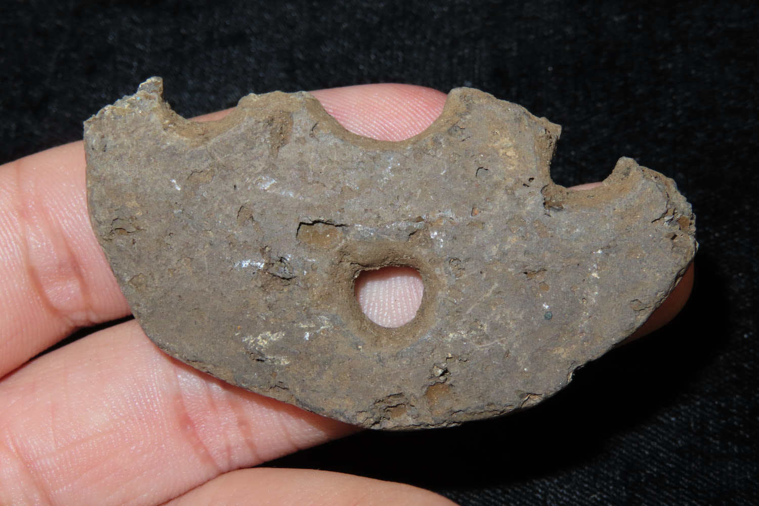 2 3/8″ POTTERY GORGET FOUND IN GALLATIN COUNTY ILLINOIS BY TOM HAGGERMAN AT THE DUFFY SITE