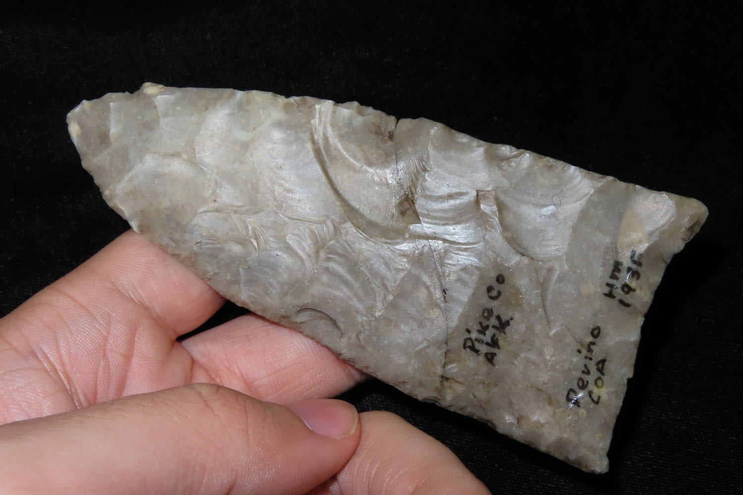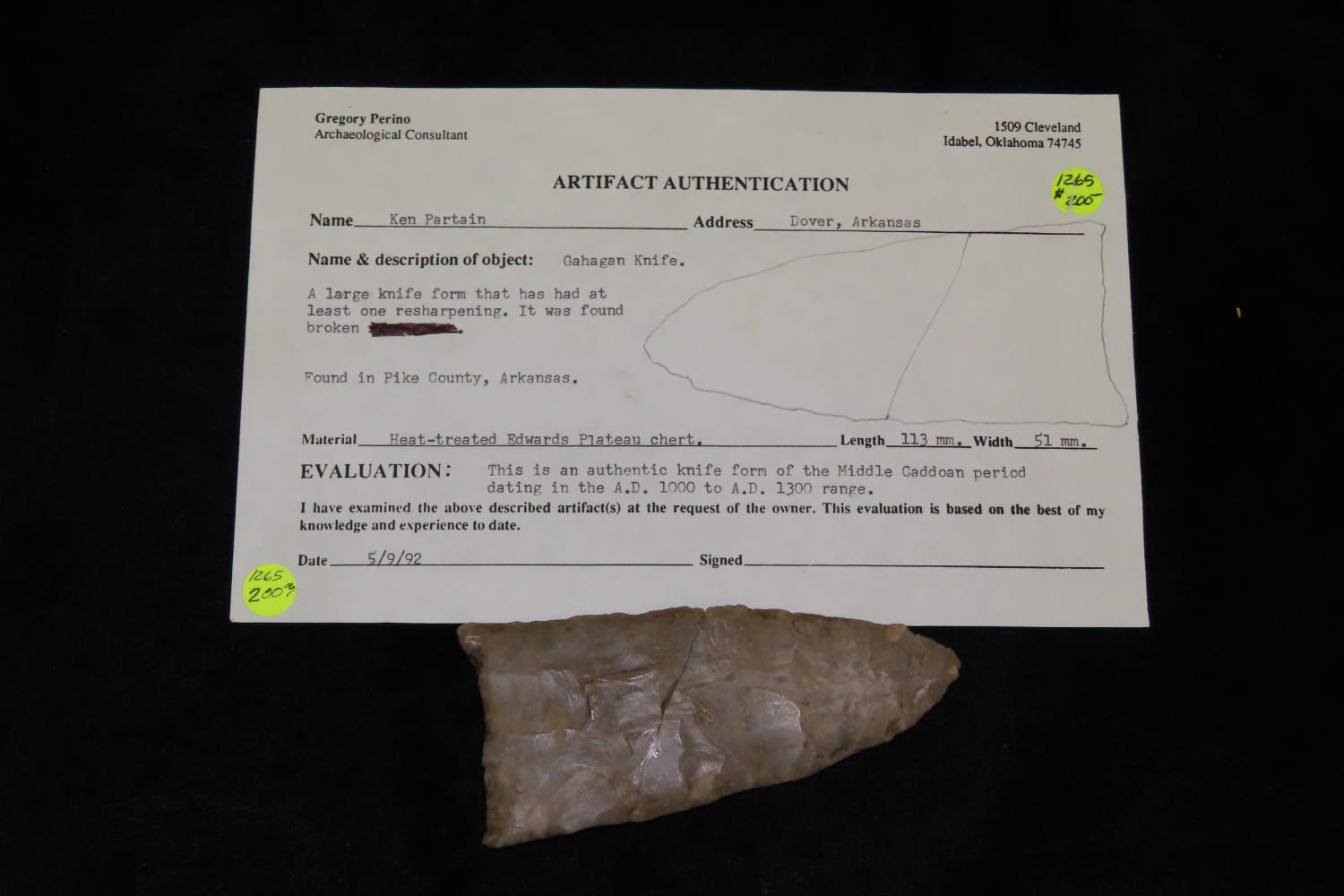 4 1/2″ Gahagan Knife Perino COA found in Pike County Arkansas Broken and glued Ex Herb Mangold Collection