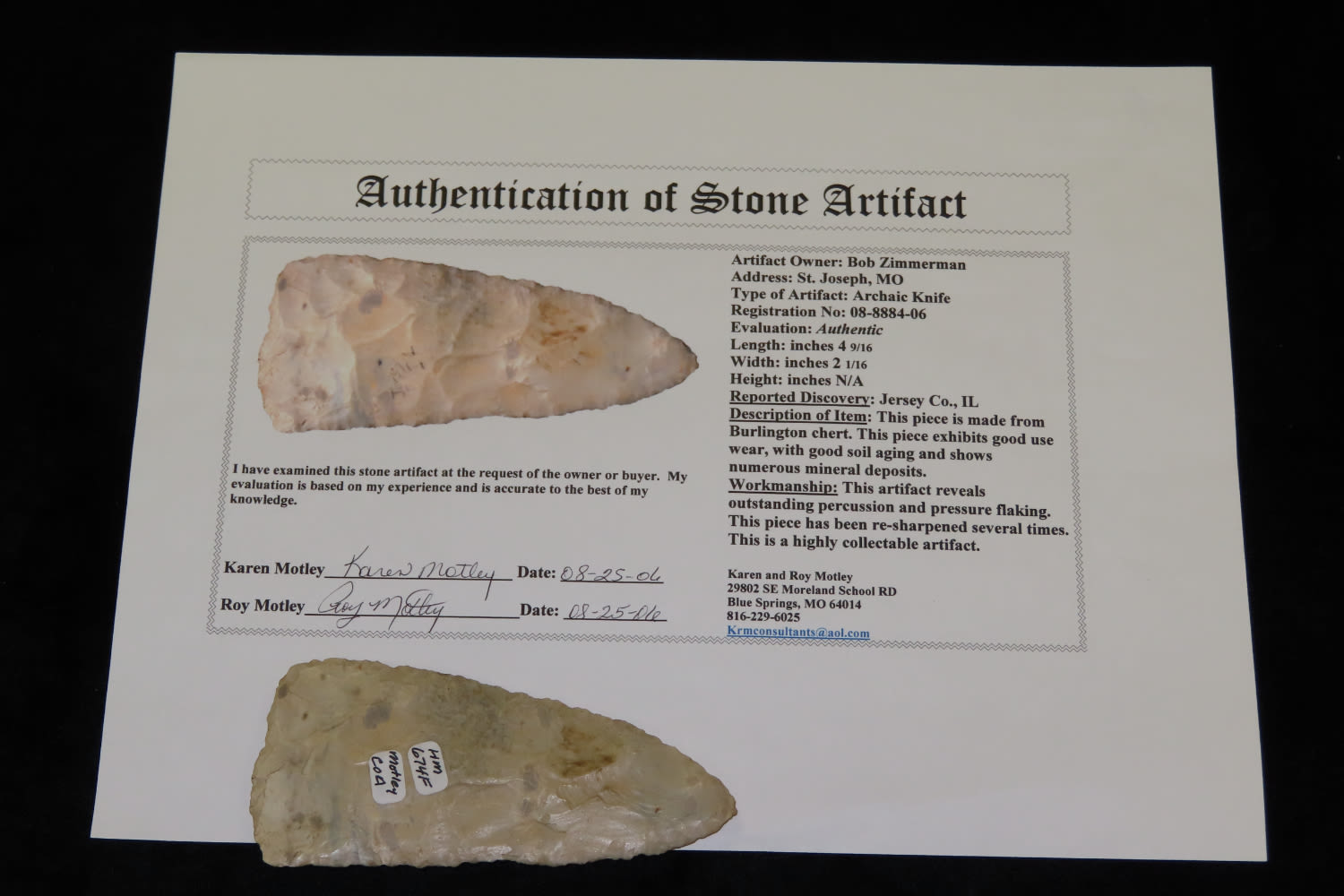 4 1/2″ Archaic Knife Motley COA found in Jersey County Illinois Ex Herb Mangold Collection
