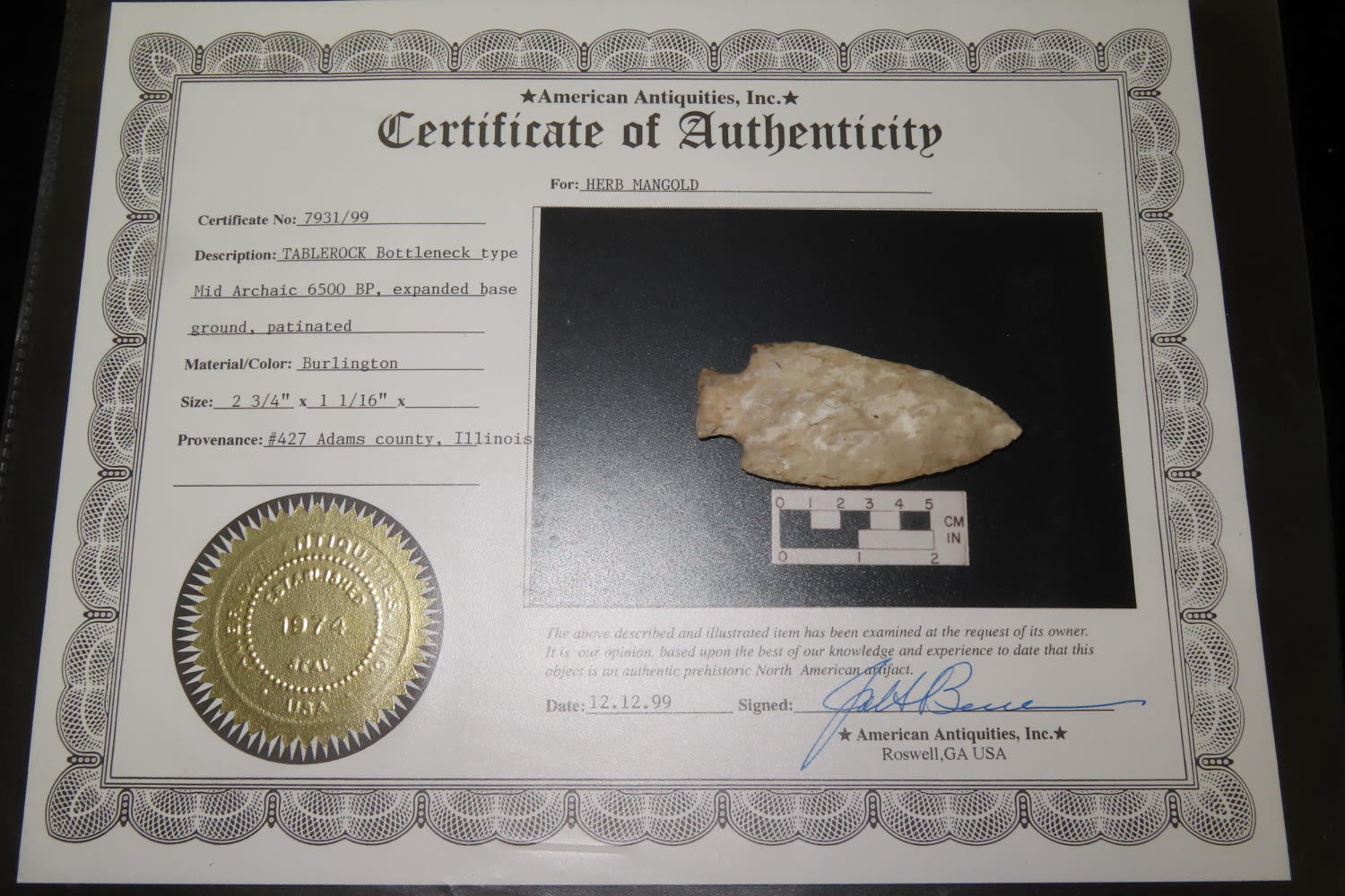2 3/4″ Table Rock Berner COA found in Adams County Illinois Ex Herb Mangold Collection