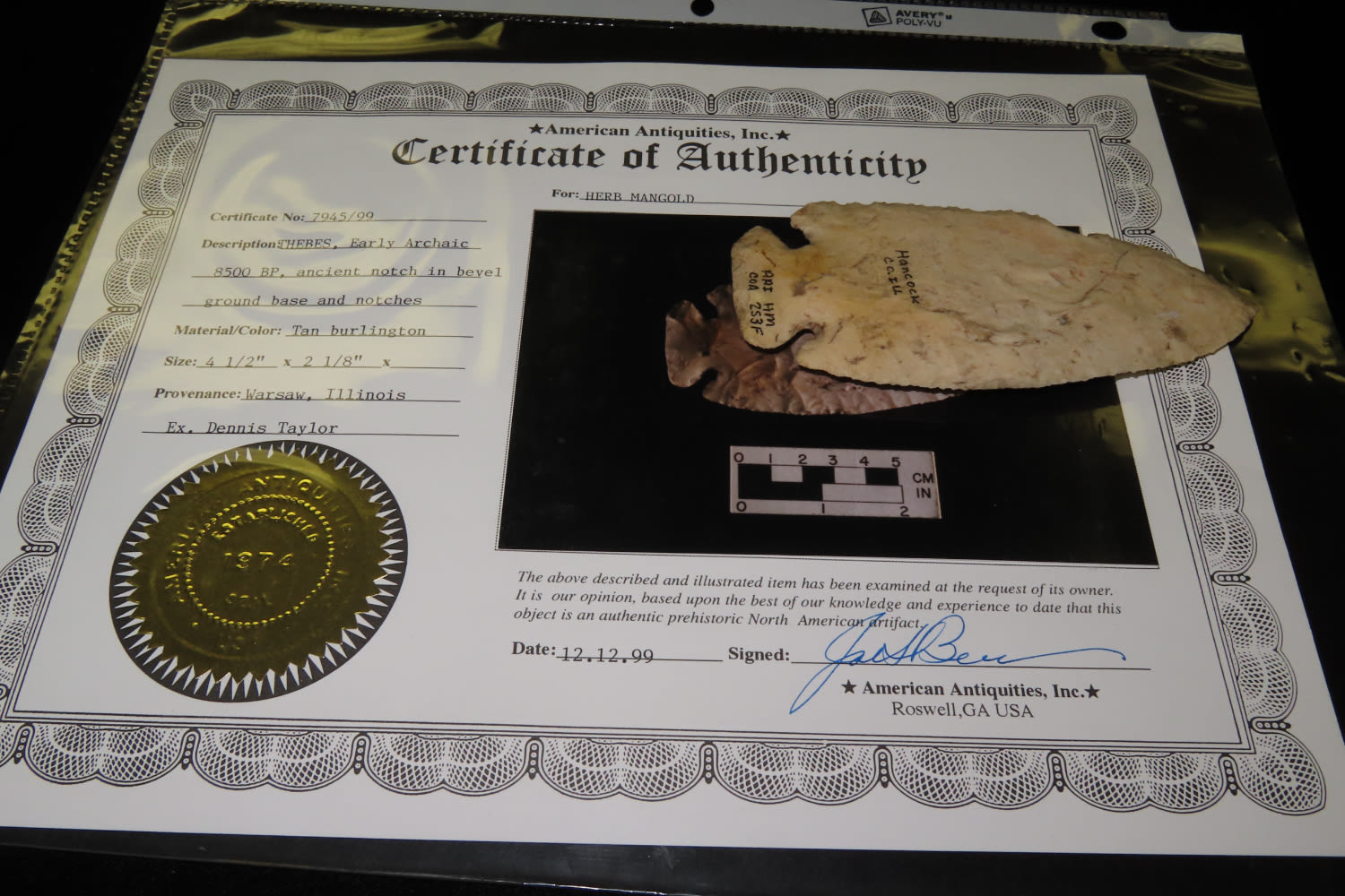 4 1/2″ Thebes Berner COA found in Hancock County Illinois Ex Herb Mangold Collection