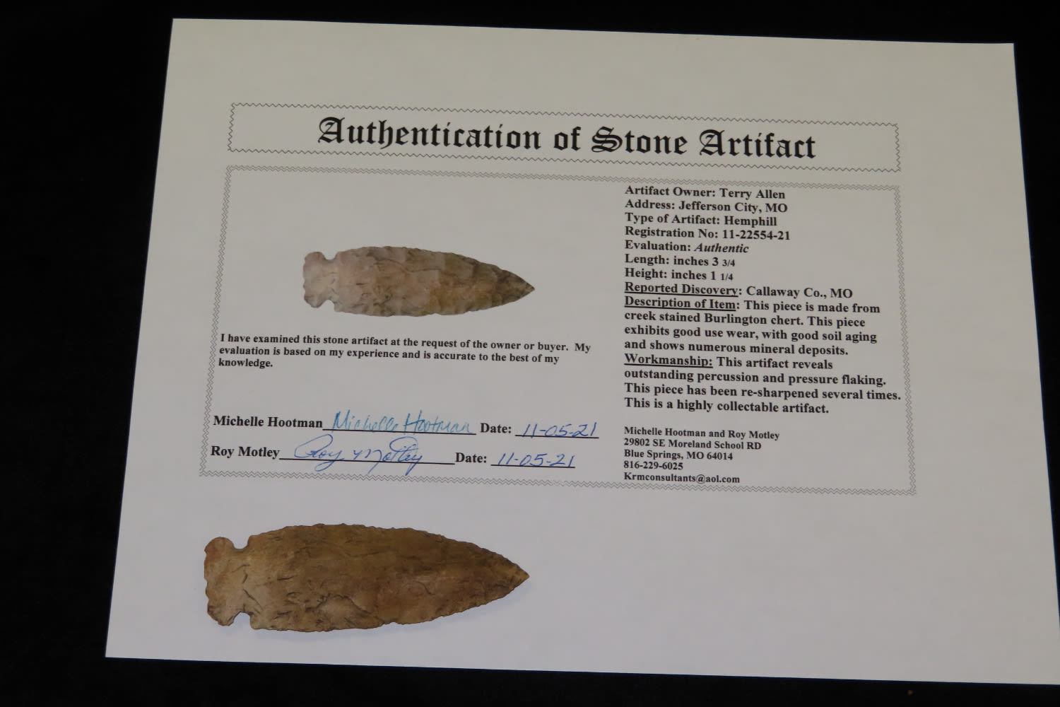 3 3/4″ Hemphill Motley COA found in Callaway County Missouri