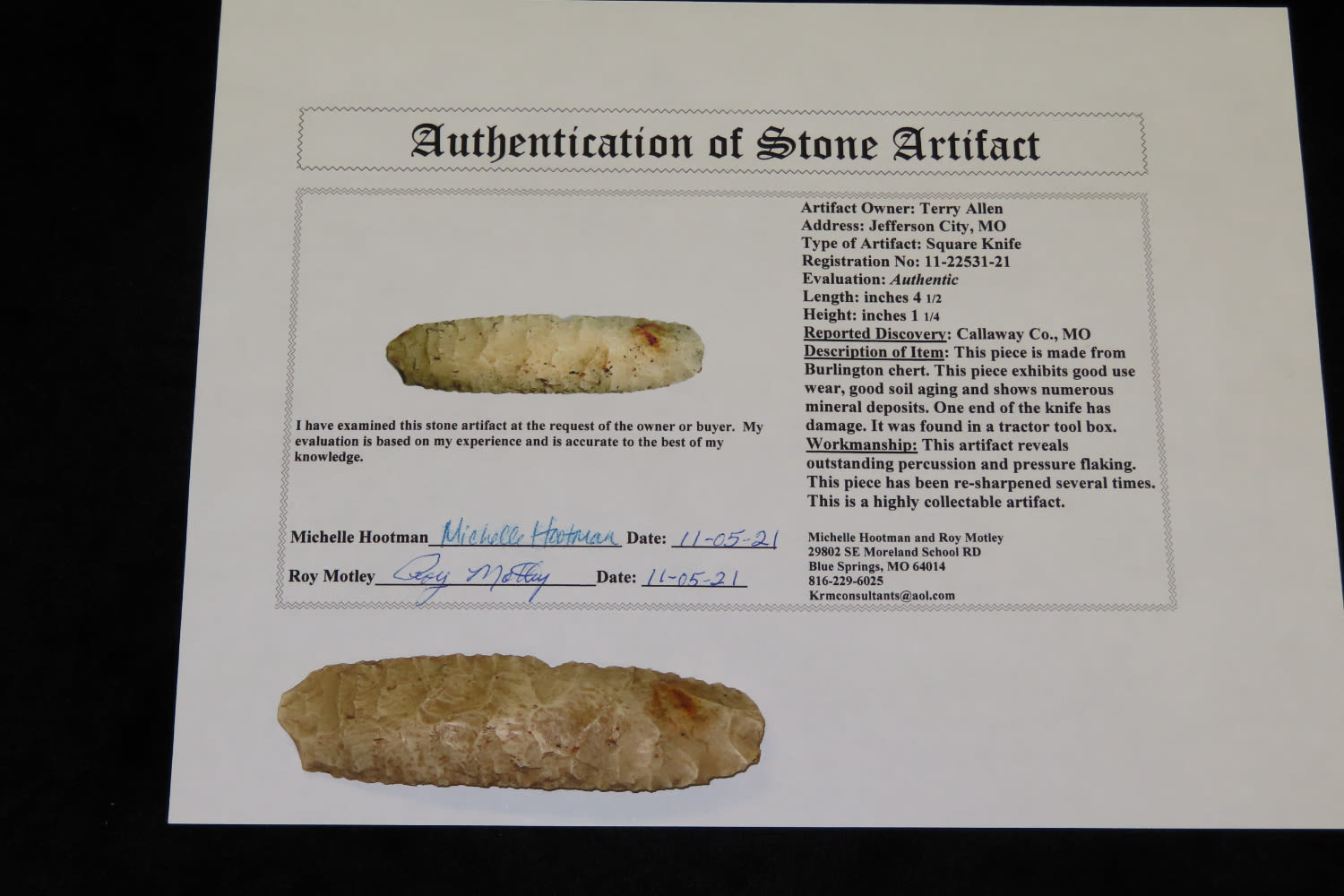 4 1/2″ Square knife Motley COA found in Callaway County Missouri