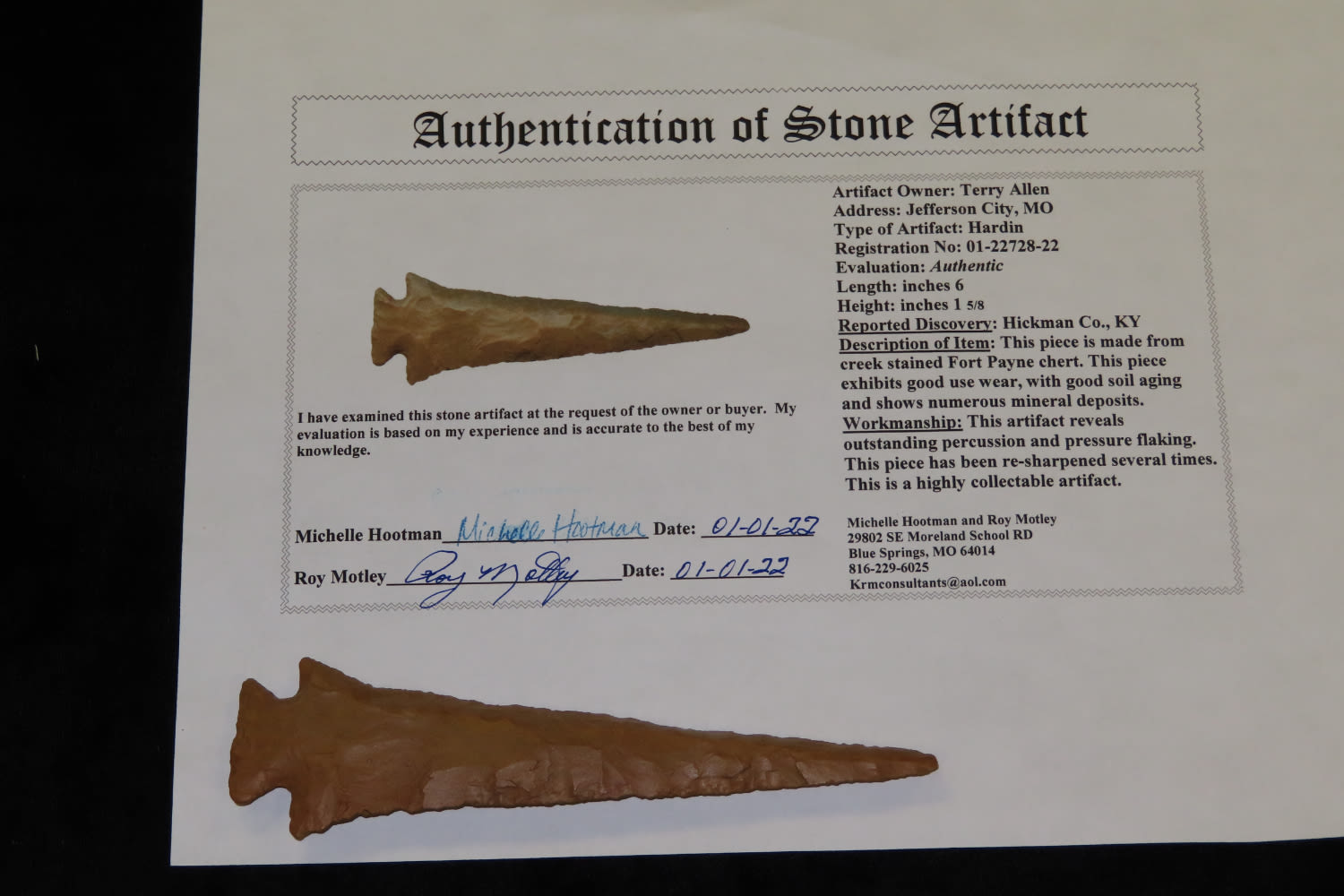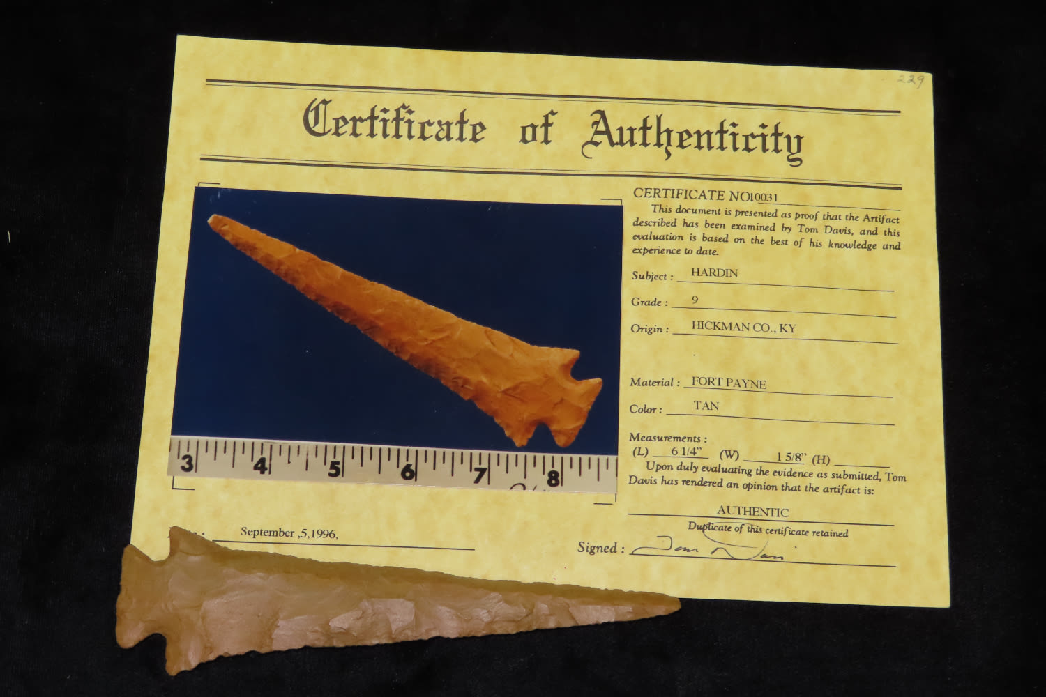 6 1/4″ Hardin Motley/Davis COA found in Hickman County Kentucky made of Ft Payne Chert