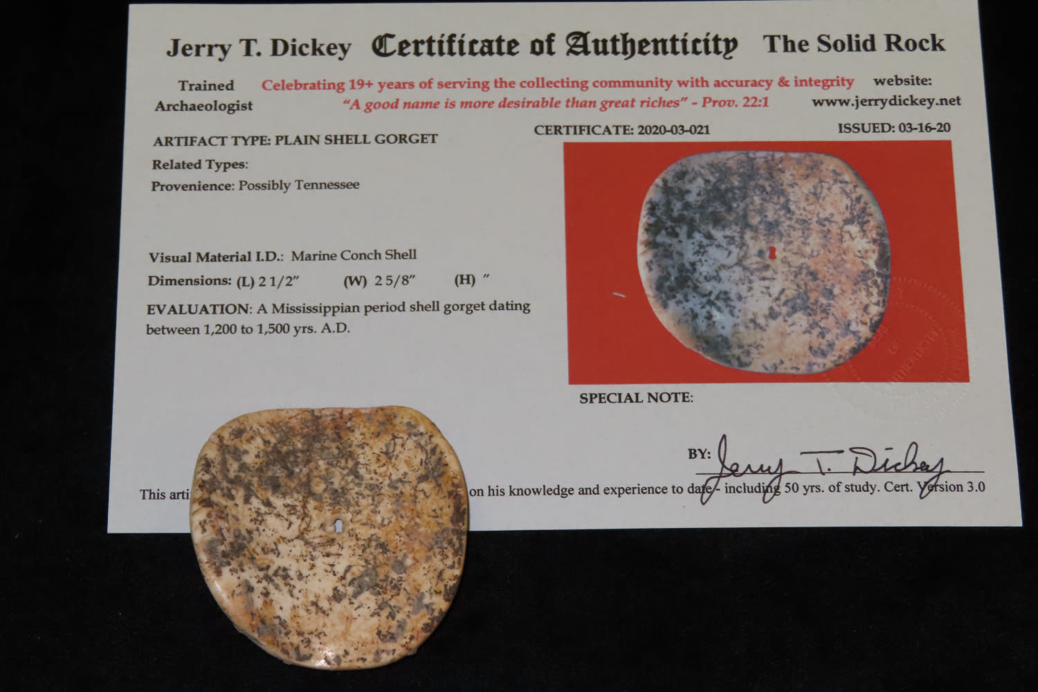 2 1/2″ Shell Gorget found in Tennessee Dickey COA