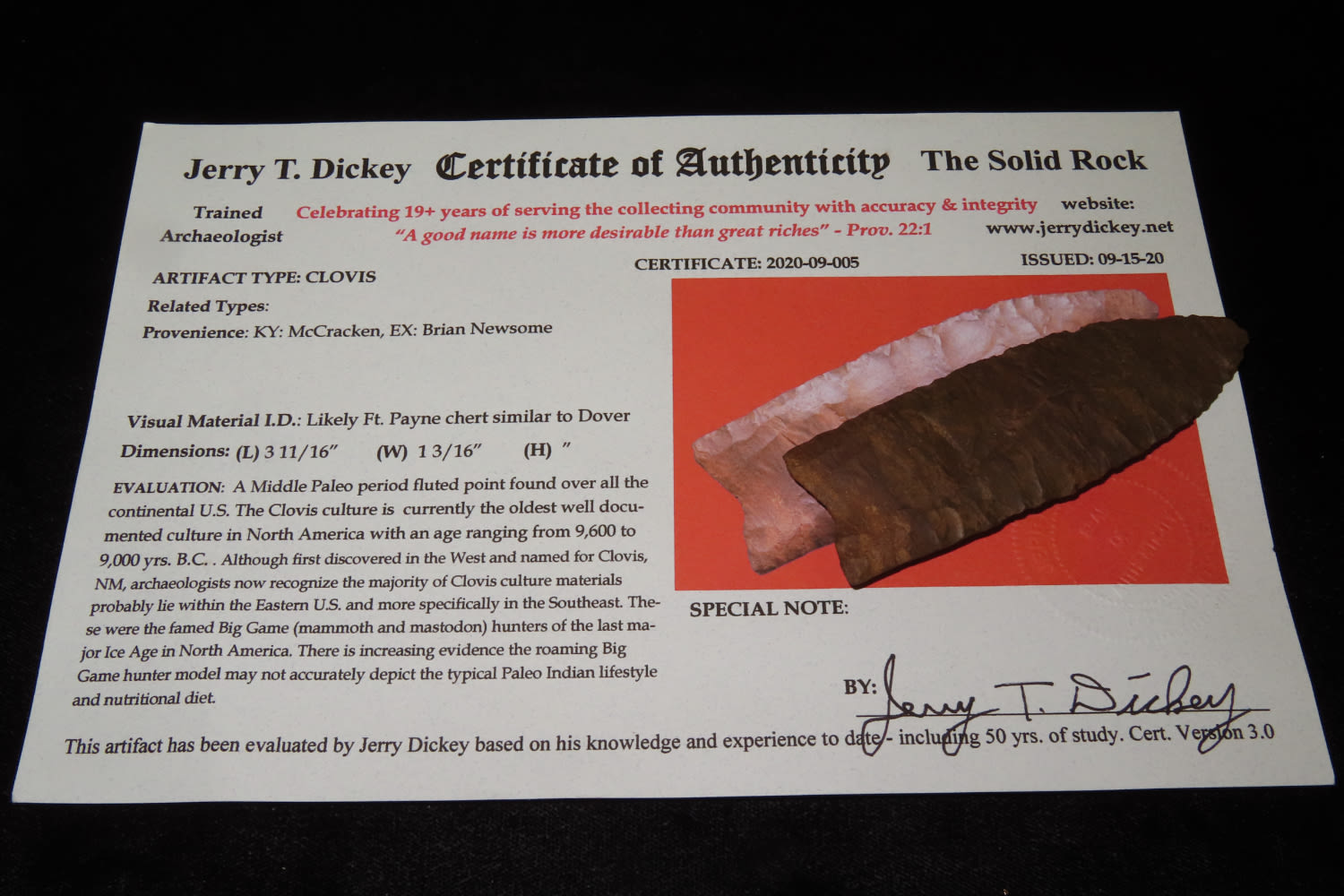 3 5/8″ Fluted Clovis Dickey COA McCracken County Kentucky Ft Payne Chert