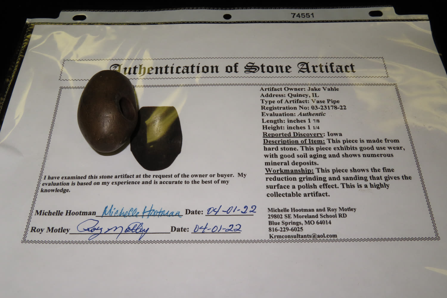 1 7/8″ Face Pipe Motley COA Inscribed and designed made from hardstone Nice Relic