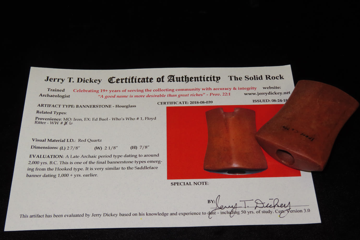 2 7/8″ Red Quartz Hourglass Bannerstone Dickey COA Found in Iron County Missouri Ex Ed Buel Pictured in Who’s Who #1. Floyd Ritter WW #6