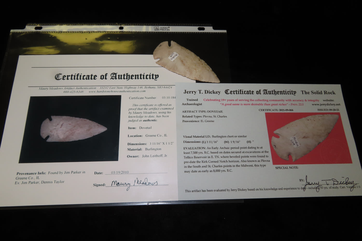 3 11/16″ Dovetail 2X COA Dickey/Meadows Found in Lee County Illinois