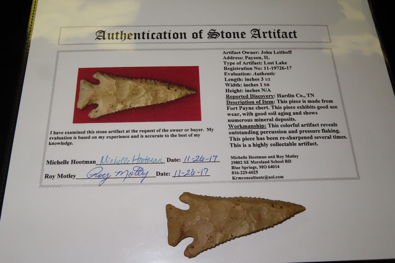3 1/2″ Lost Lake Motley COA found in Hardin County Tennessee