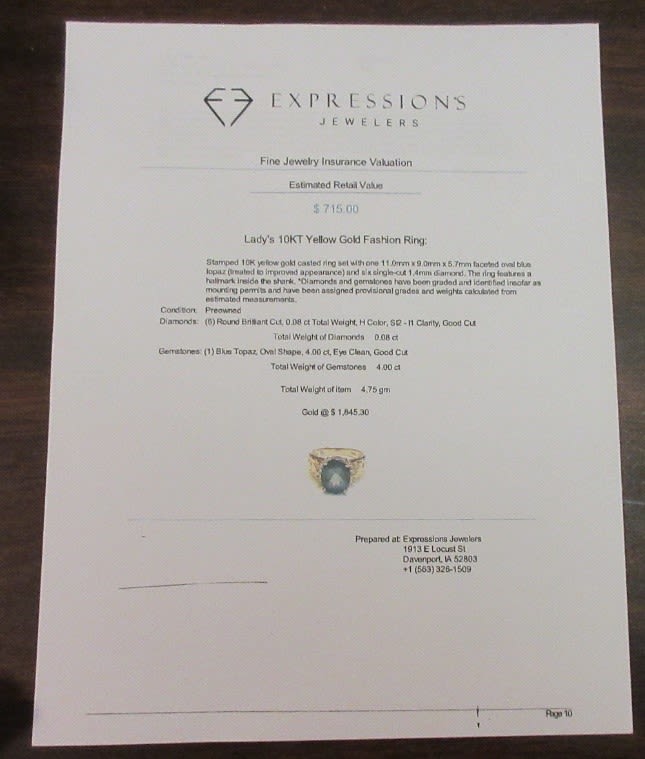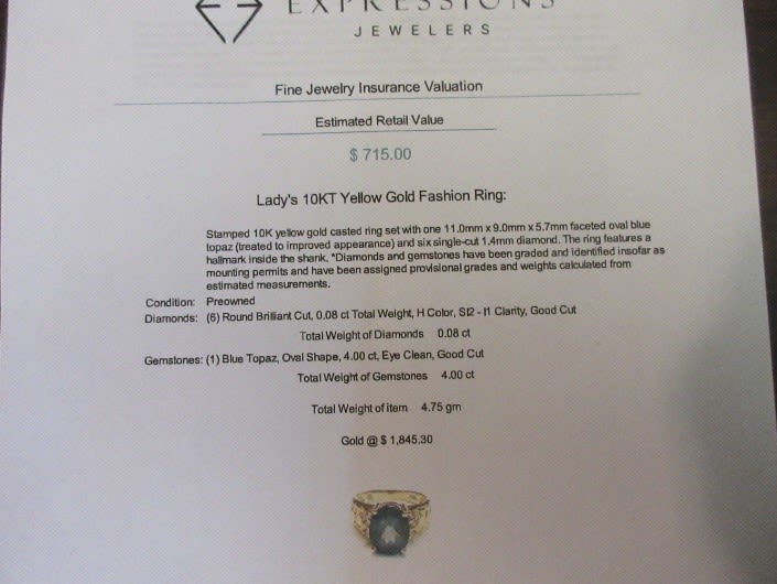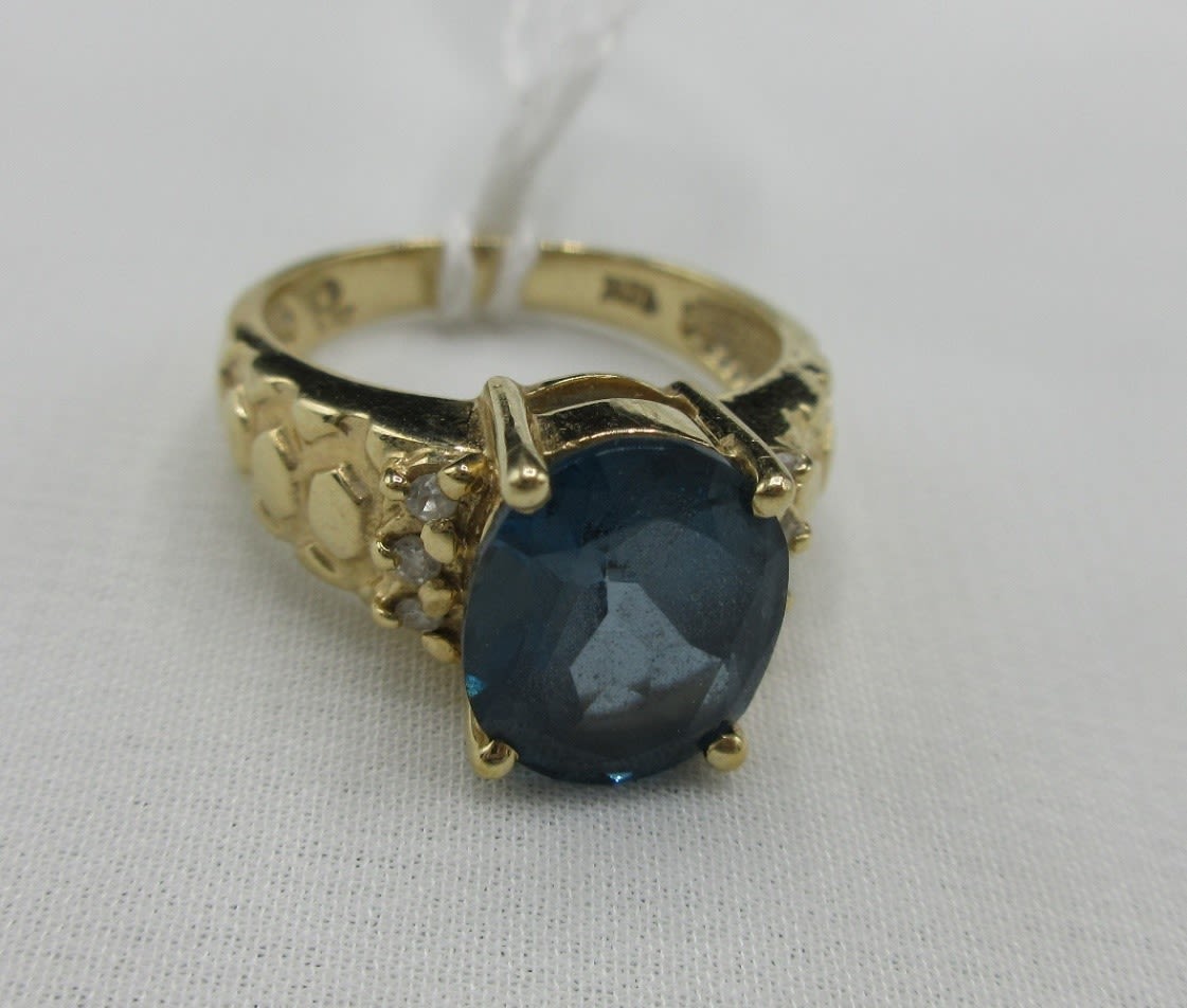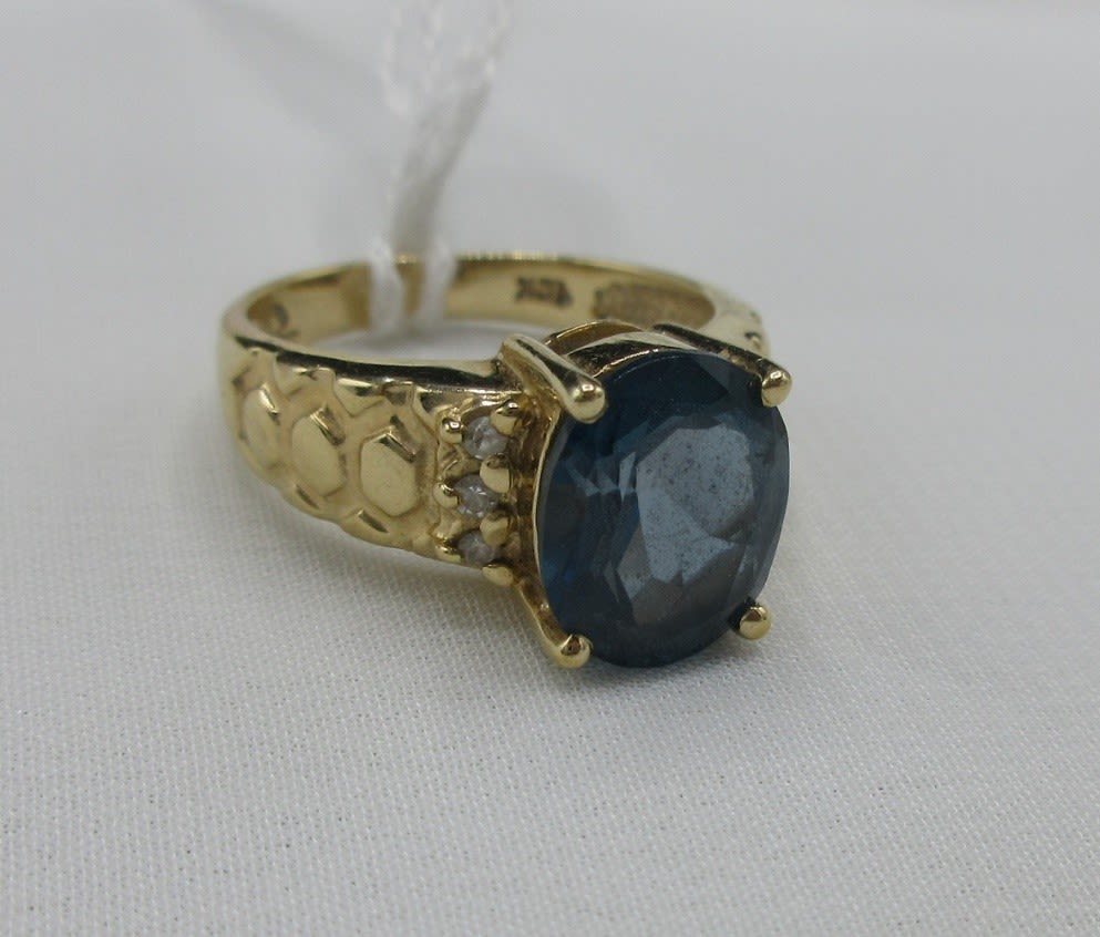 Beautiful 4 ct. Blue Topaz and diamond ring. 10 k gold with certified appraisal. Size 7
