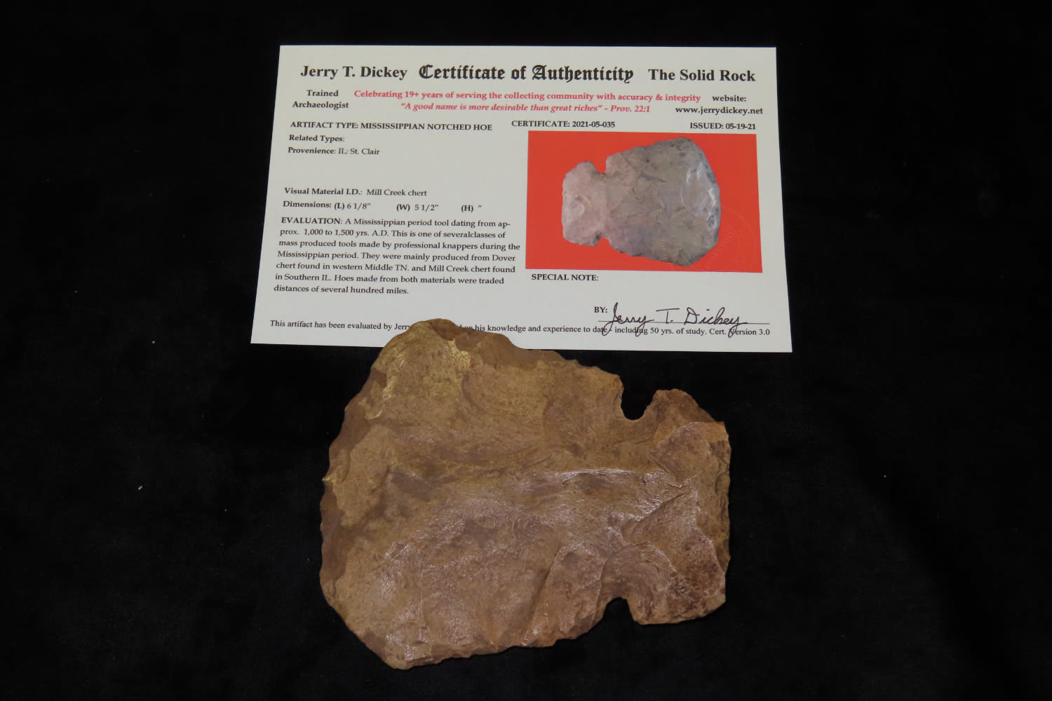 6 1/8″ Mississippi Notched Hoe found in St Clair County Illinois Dickey COA Mill Creek Chert