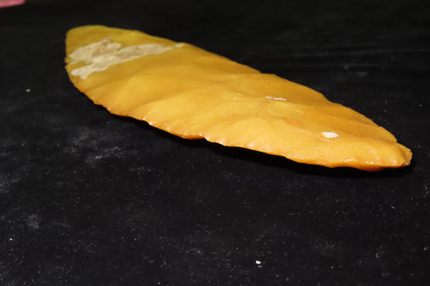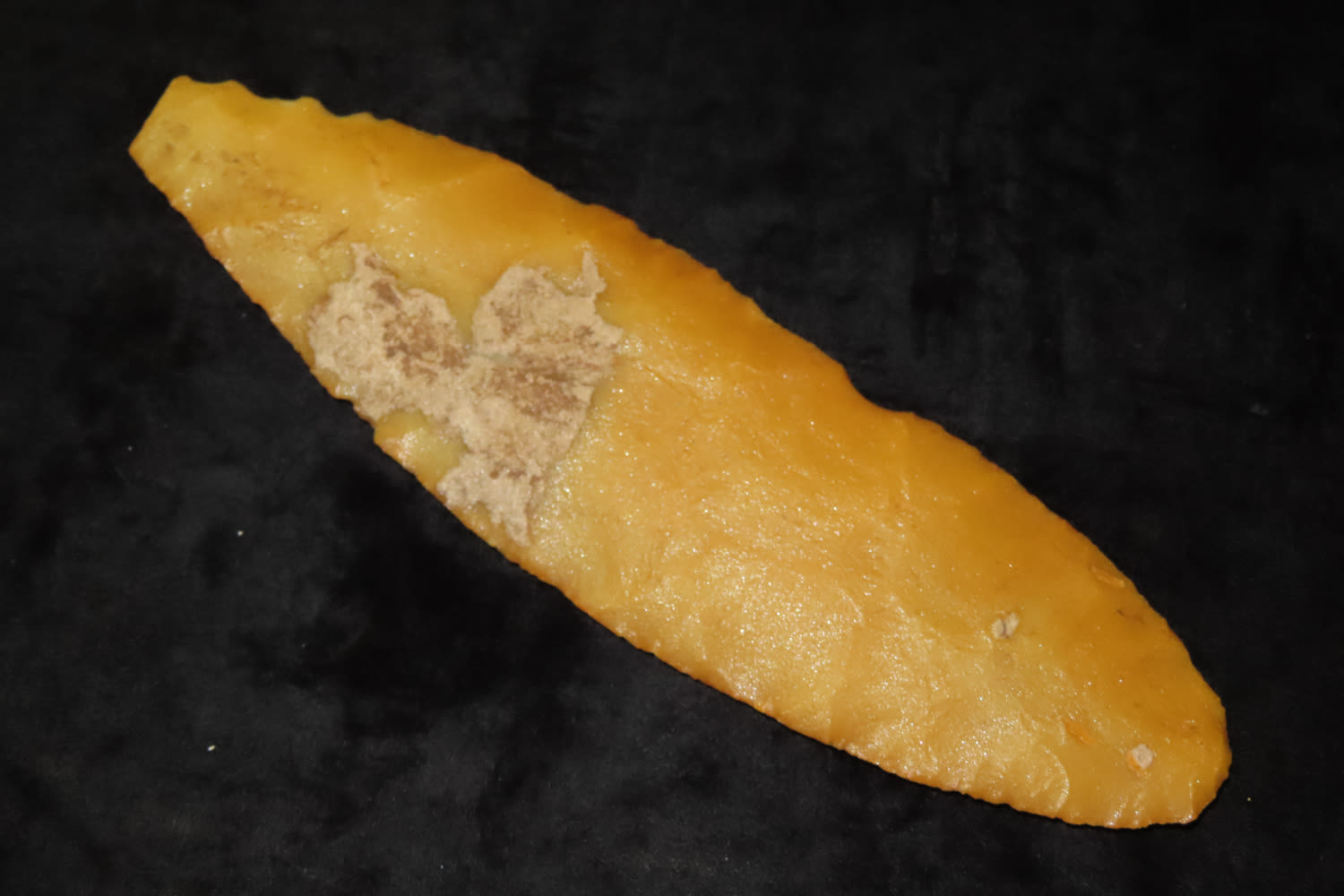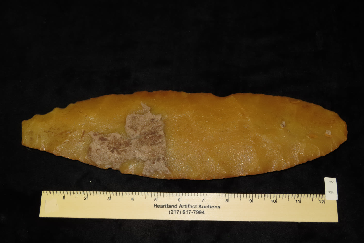 Found in Peshtigo, Wisconsin, this humongous blade traveled to Michigan before landing with Floyd Ritter for approximately 35-40 years before Gene acquired it. The break at the tip is ancient and shows wear-proving it was still used and valued by its original owner. It does nothing to deter from it’s glittering beauty or extreme high value!