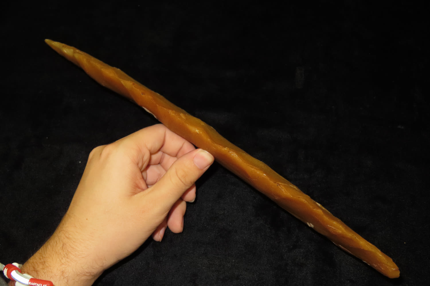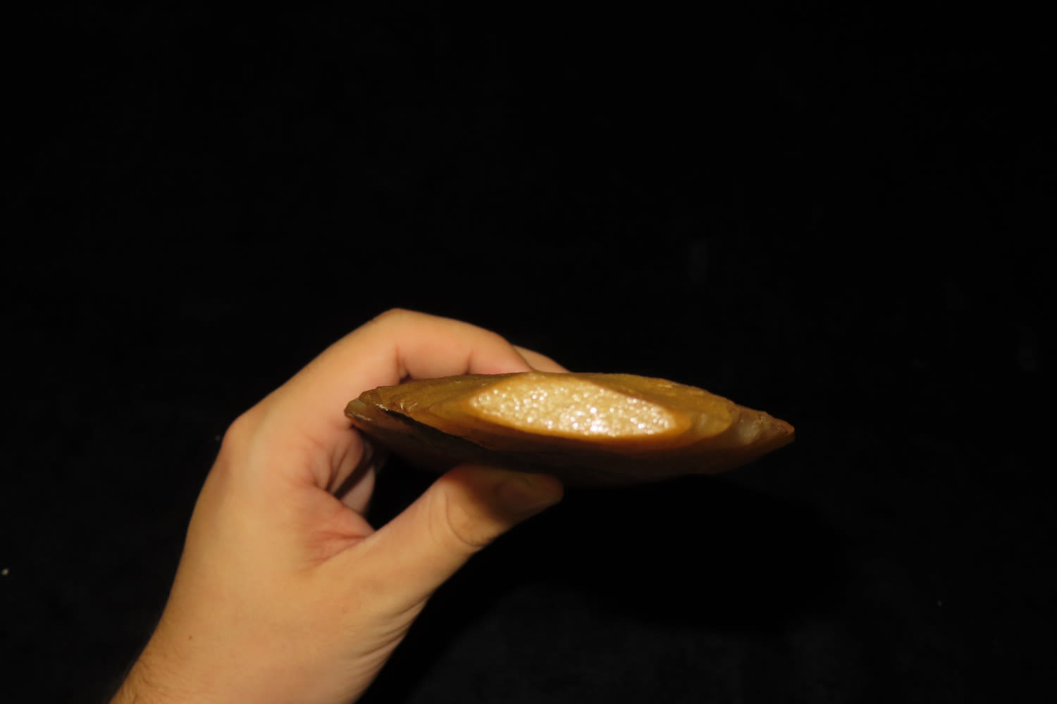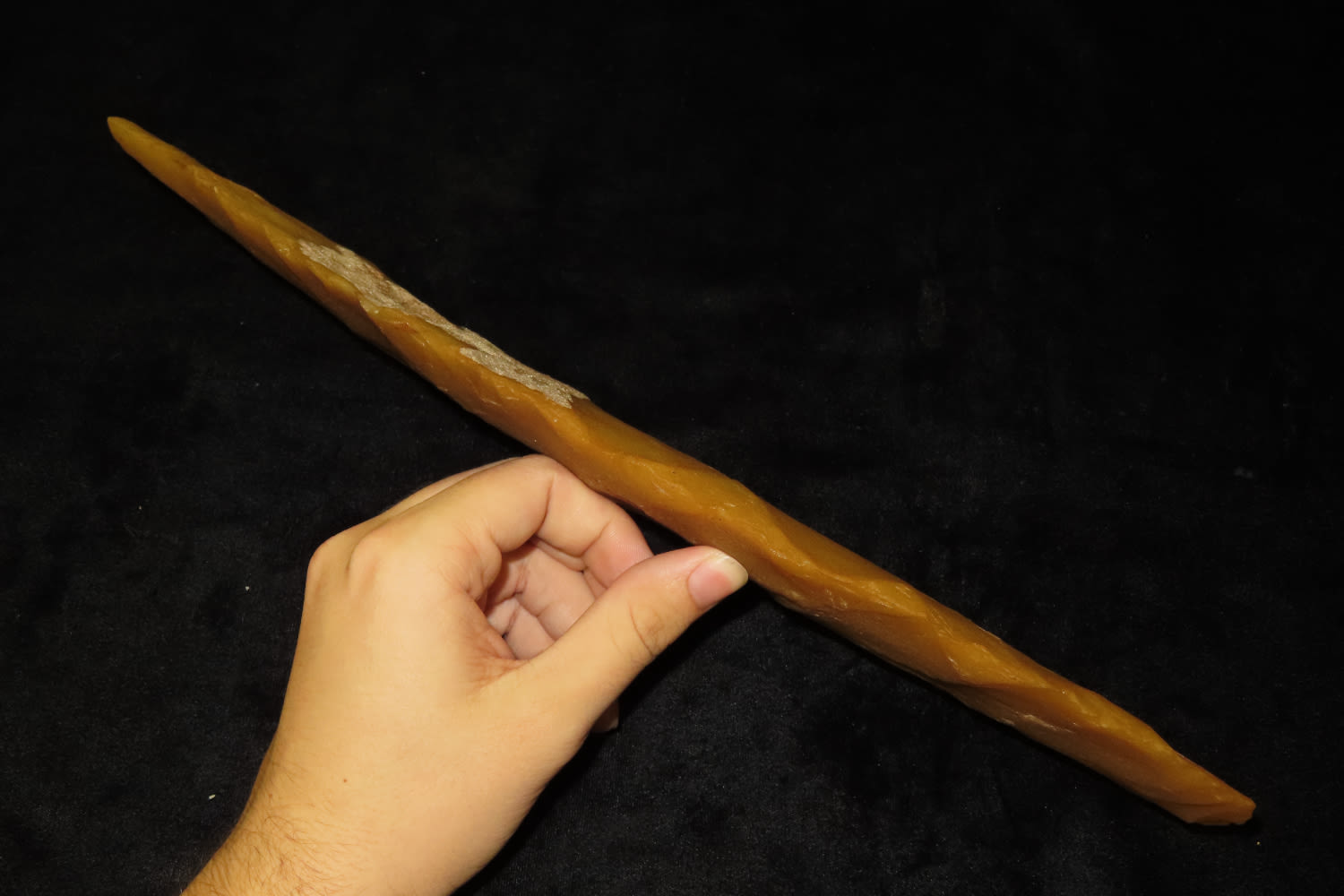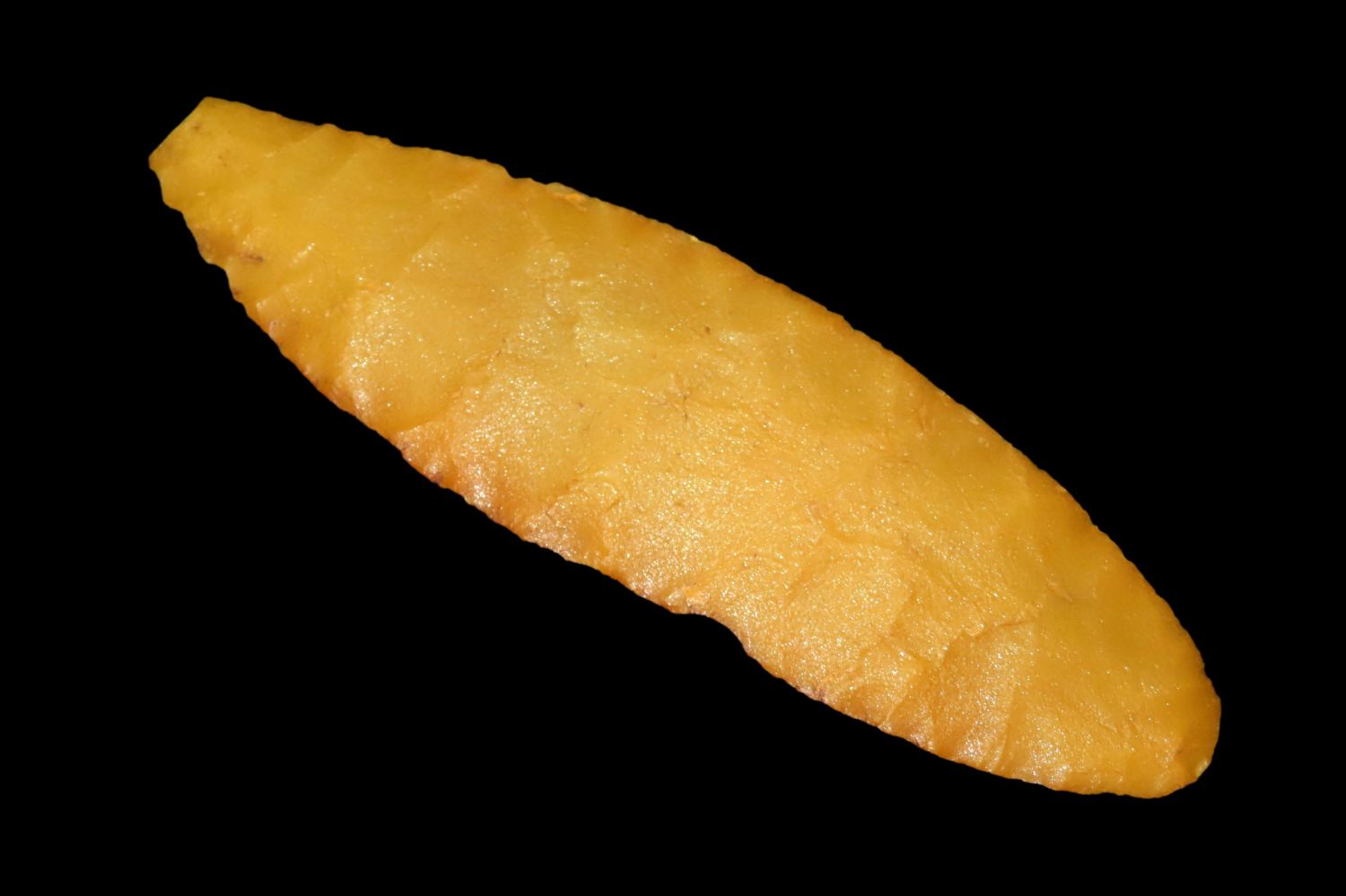 Found in Peshtigo, Wisconsin, this humongous blade traveled to Michigan before landing with Floyd Ritter for approximately 35-40 years before Gene acquired it. The break at the tip is ancient and shows wear-proving it was still used and valued by its original owner. It does nothing to deter from it’s glittering beauty or extreme high value!