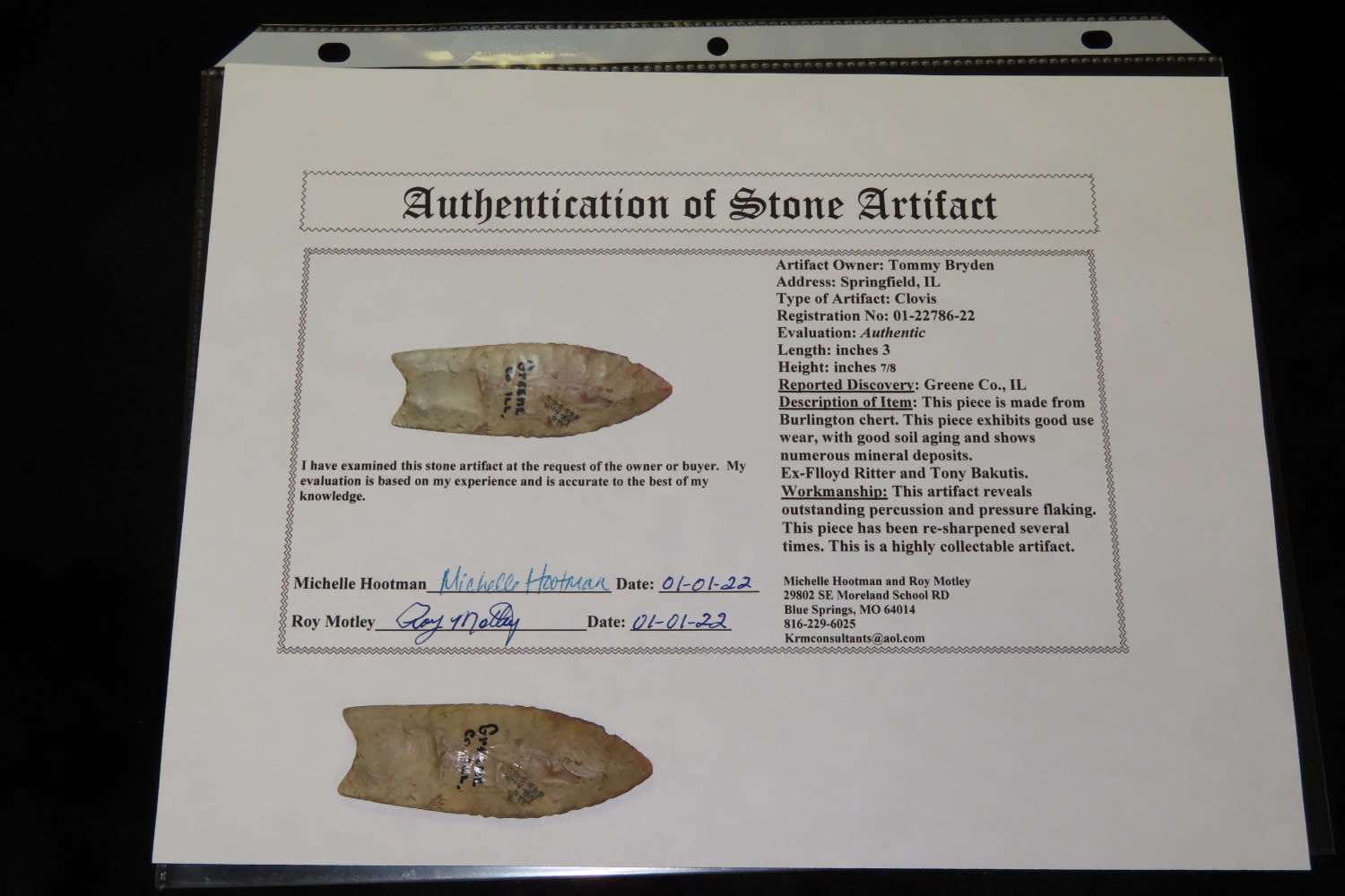 3″ Fluted Clovis found in Green County Illinois ex Floyd Ridder, Tony Bakutis Motley COA