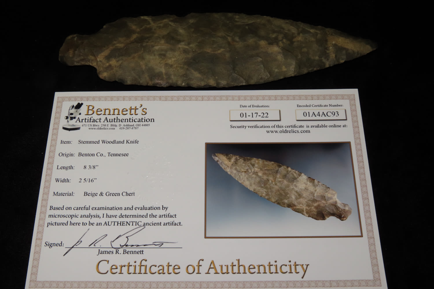 8 3/8″ stemmed woodland knife Bennet COA found in Benton County Tennessee