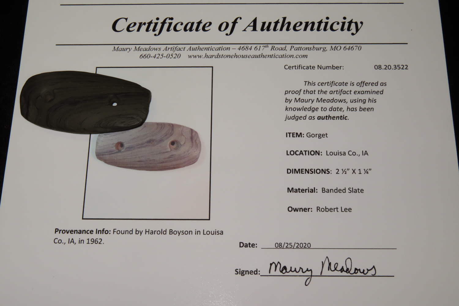 2 1/2″ Slate Gorget, Louisa CO IA, Meadows COA,