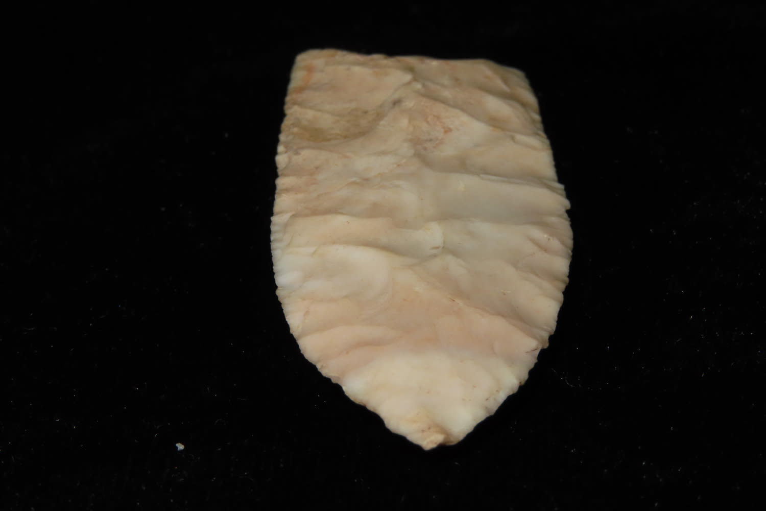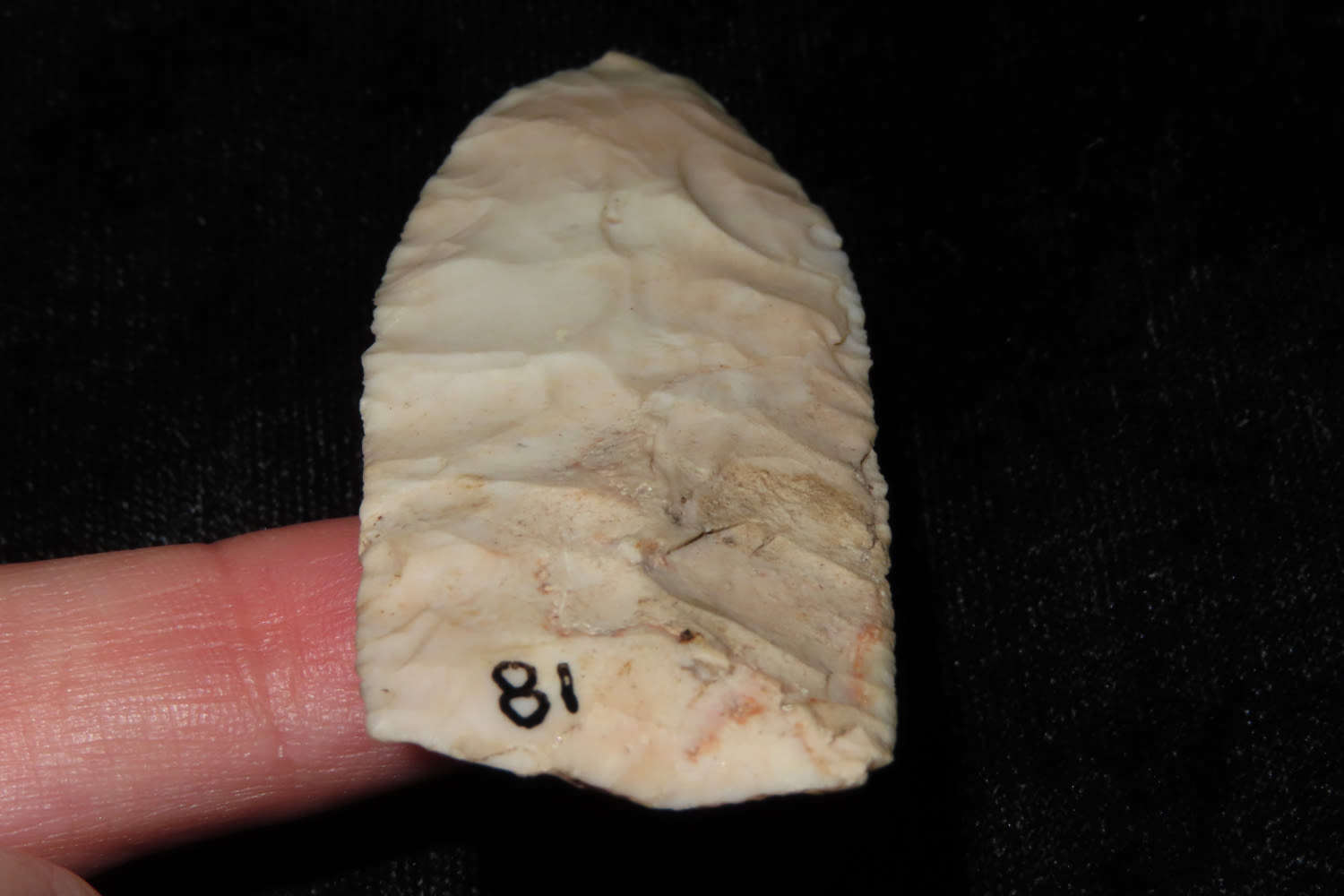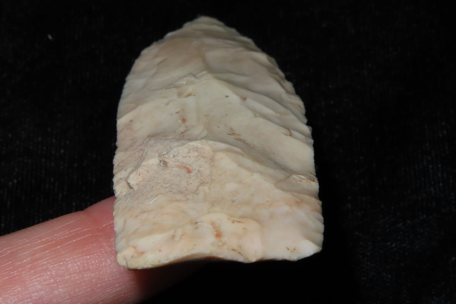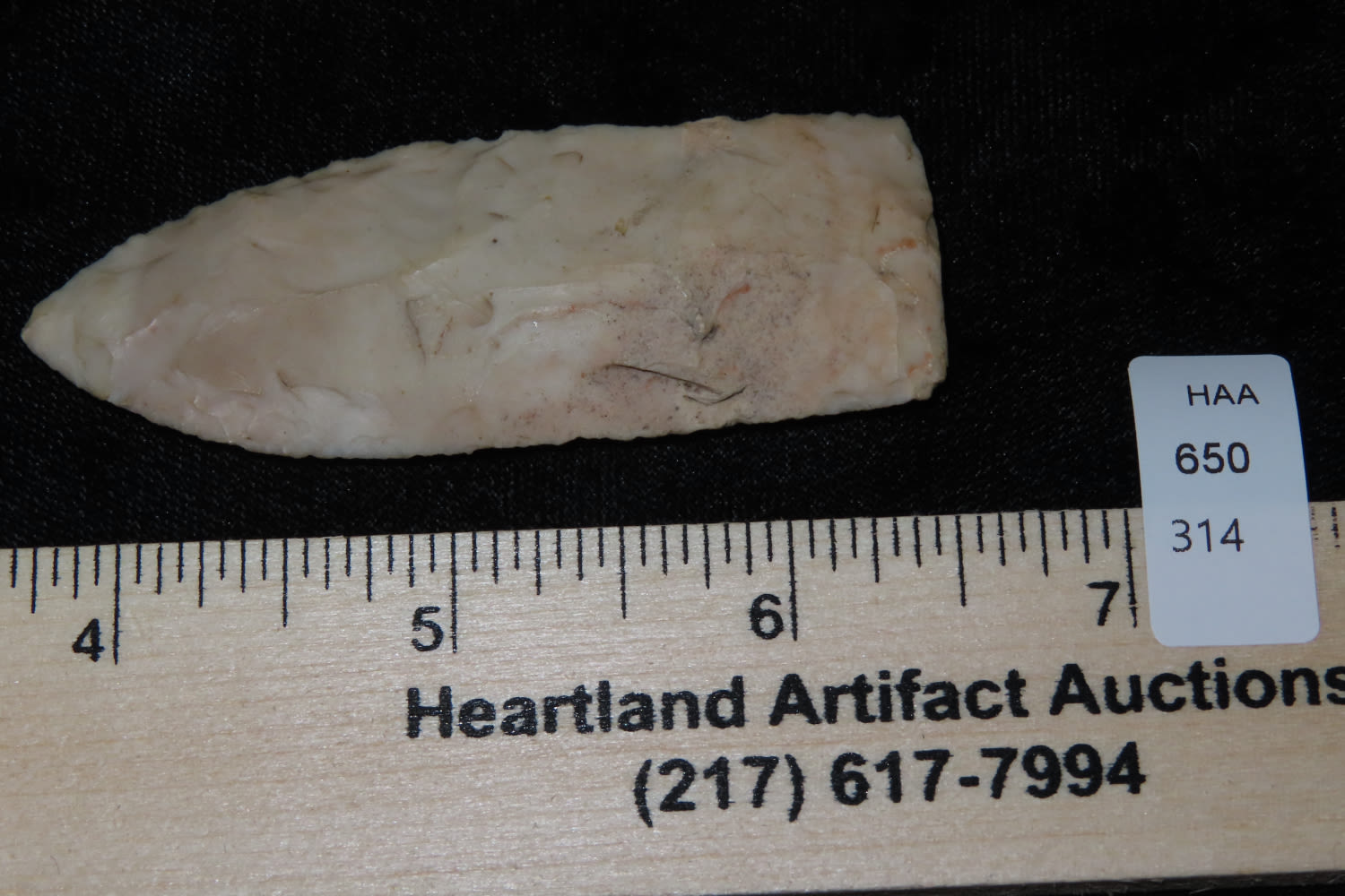2 3/4″ Agate Basin, heavily ground base, found in illinois EX. ., Sam Wasion