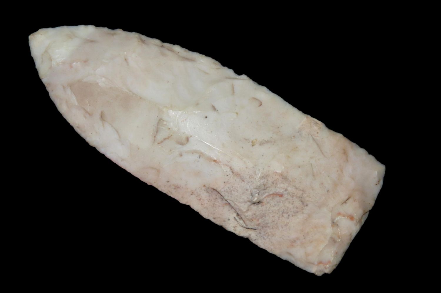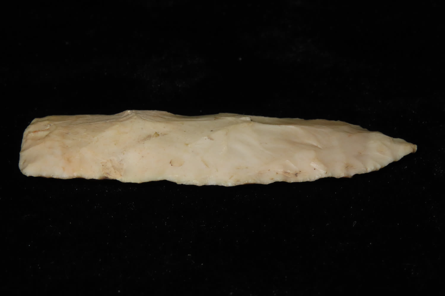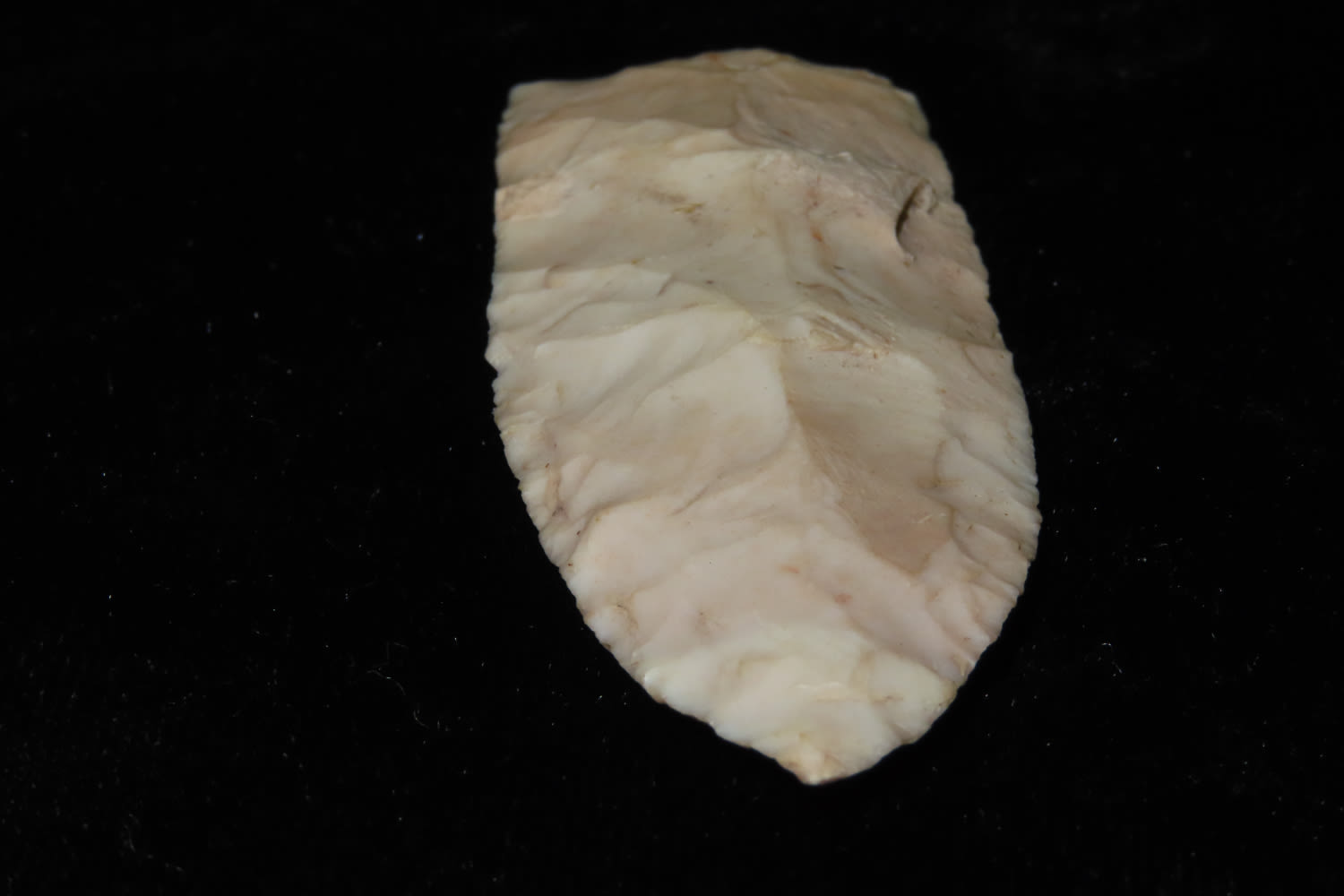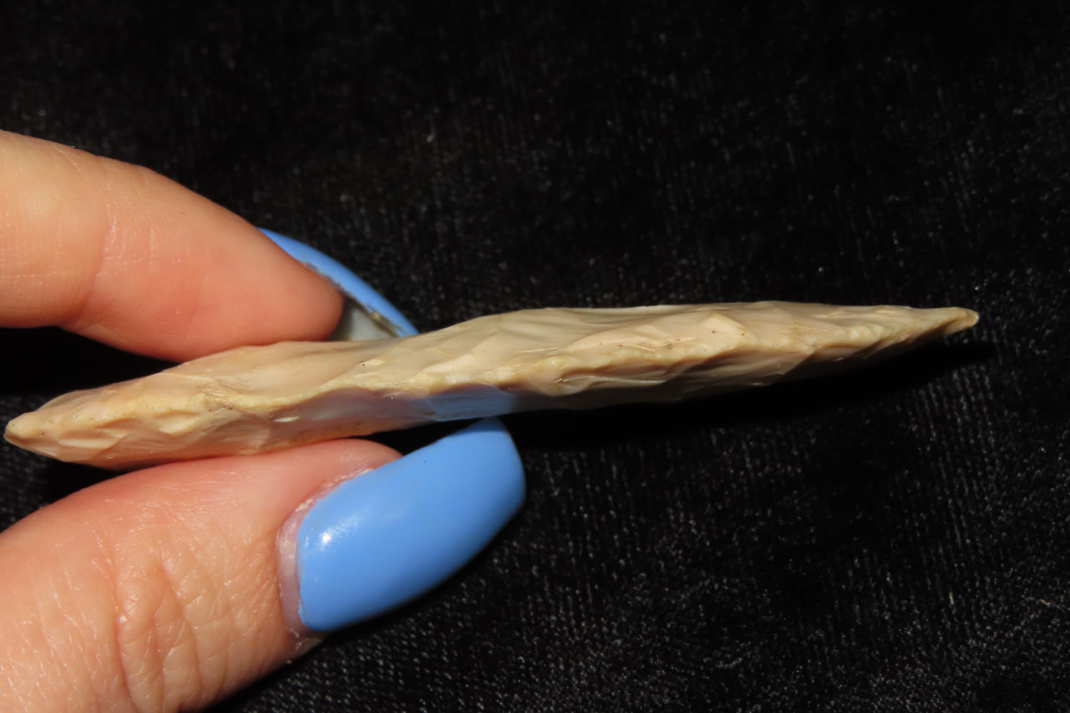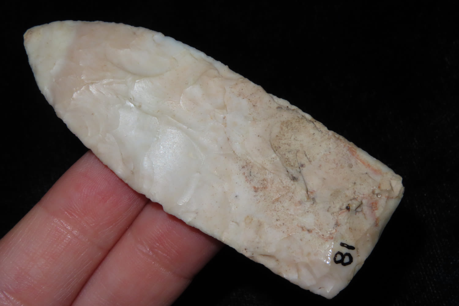 2 3/4″ Agate Basin, heavily ground base, found in illinois EX. ., Sam Wasion