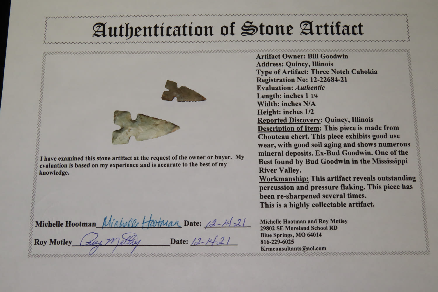 1 1/4″ Tri-notch Cahokia, Ex-Bud Goodwin, One of the best found by Bud Goodwin on the Mississippi River Valley