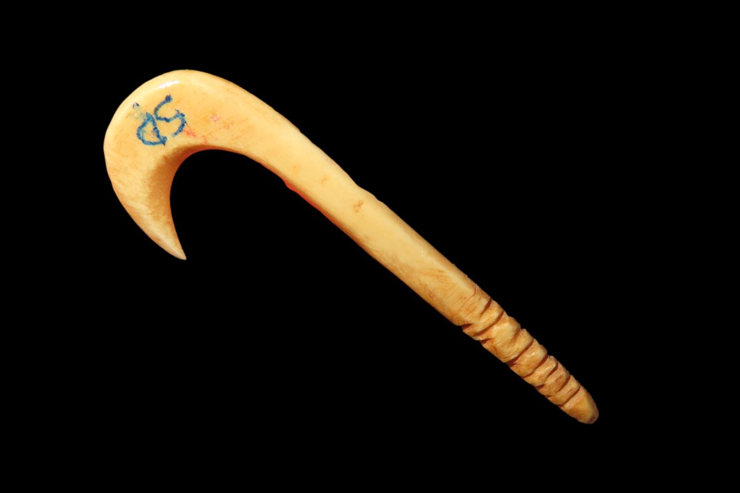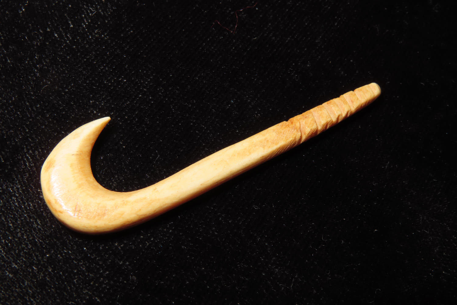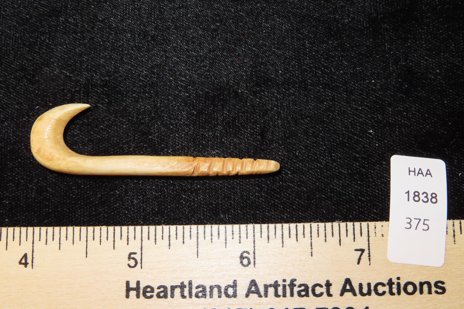 Bone Fish hook 2 3/8″ Mandan, Found in South Dakota EX. James Vroom Collection