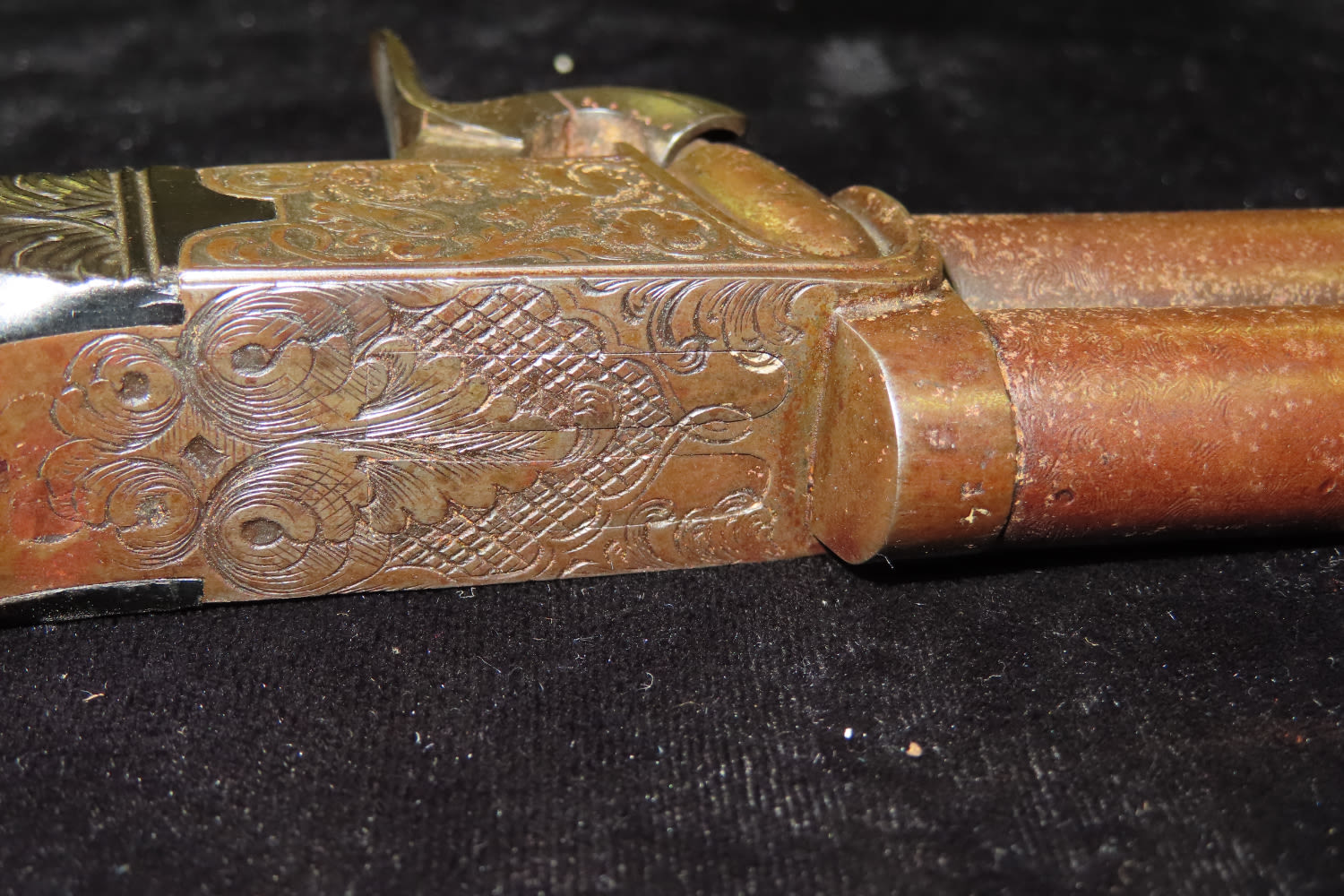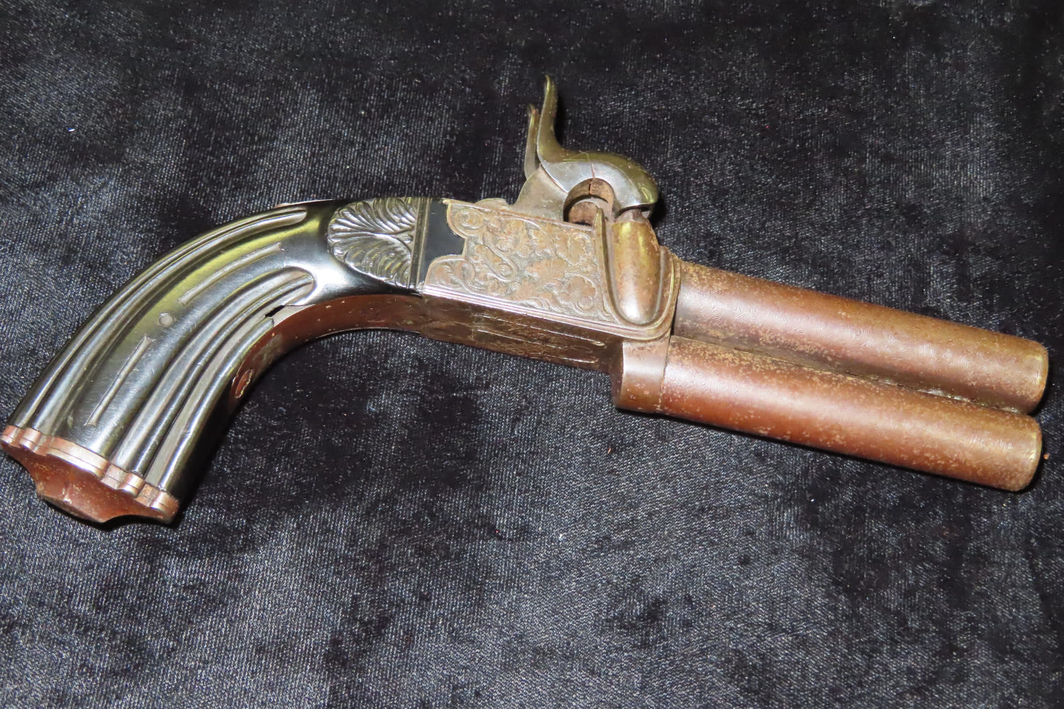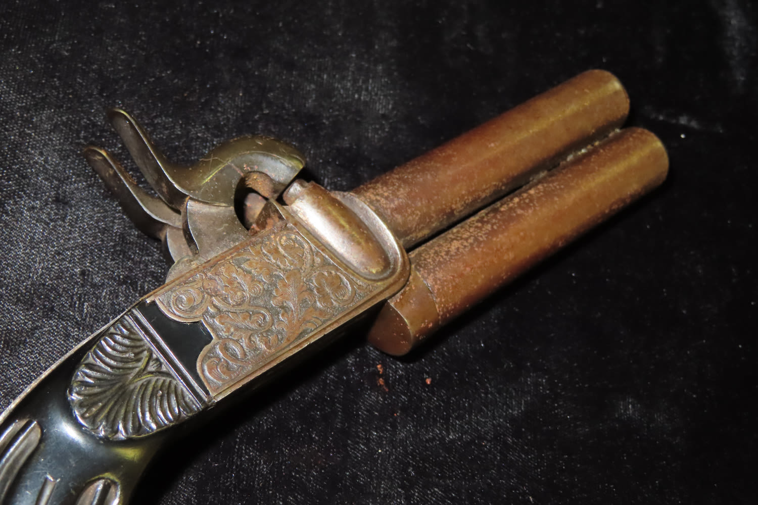 Engragved European, Double Barrel, Percussion Pistol. Functions (works)