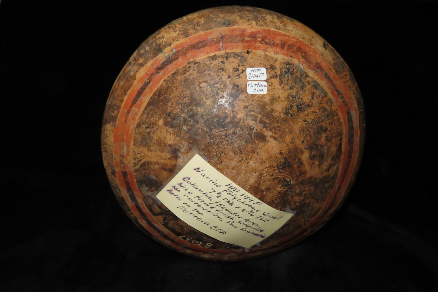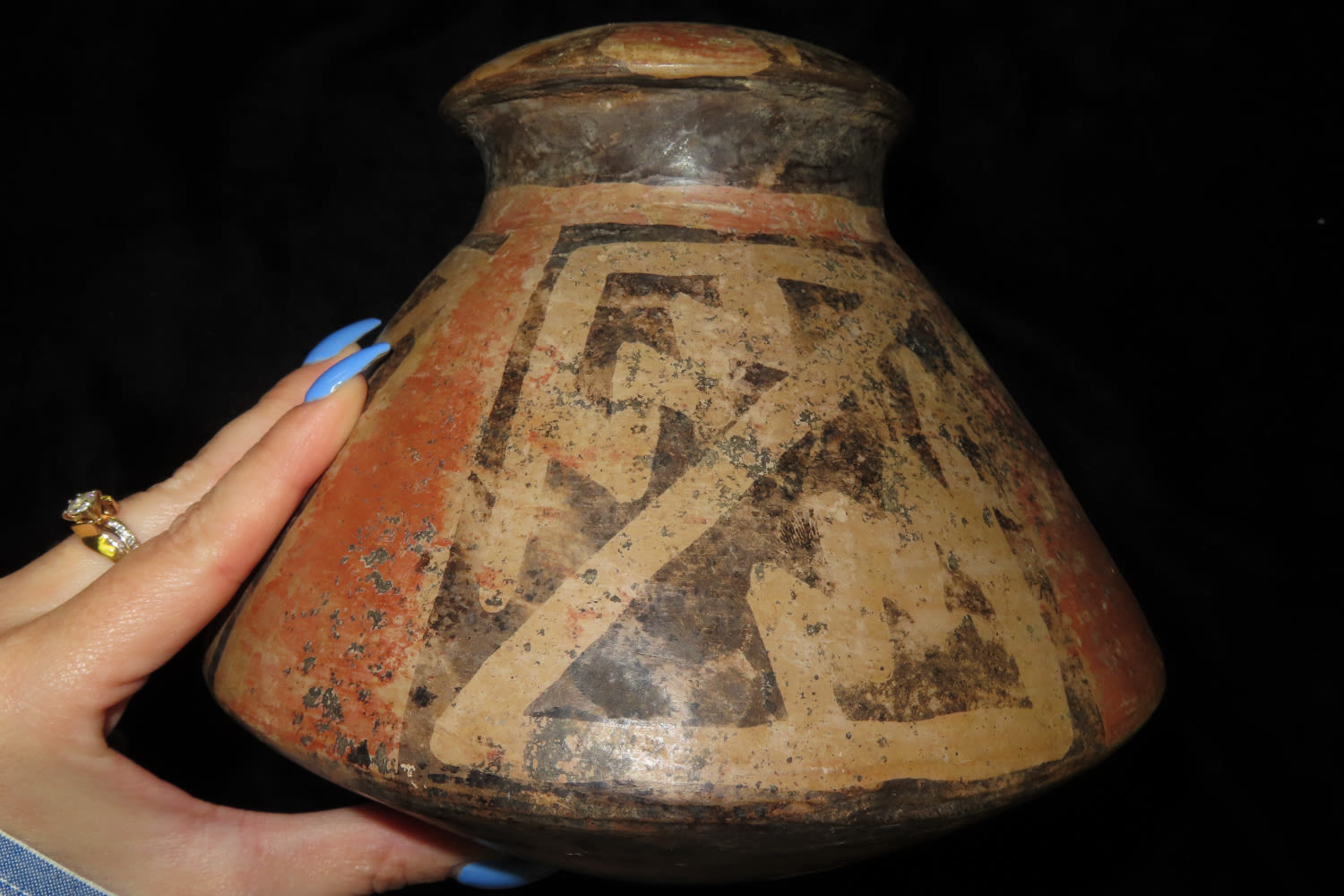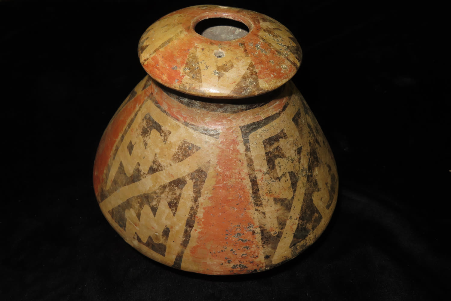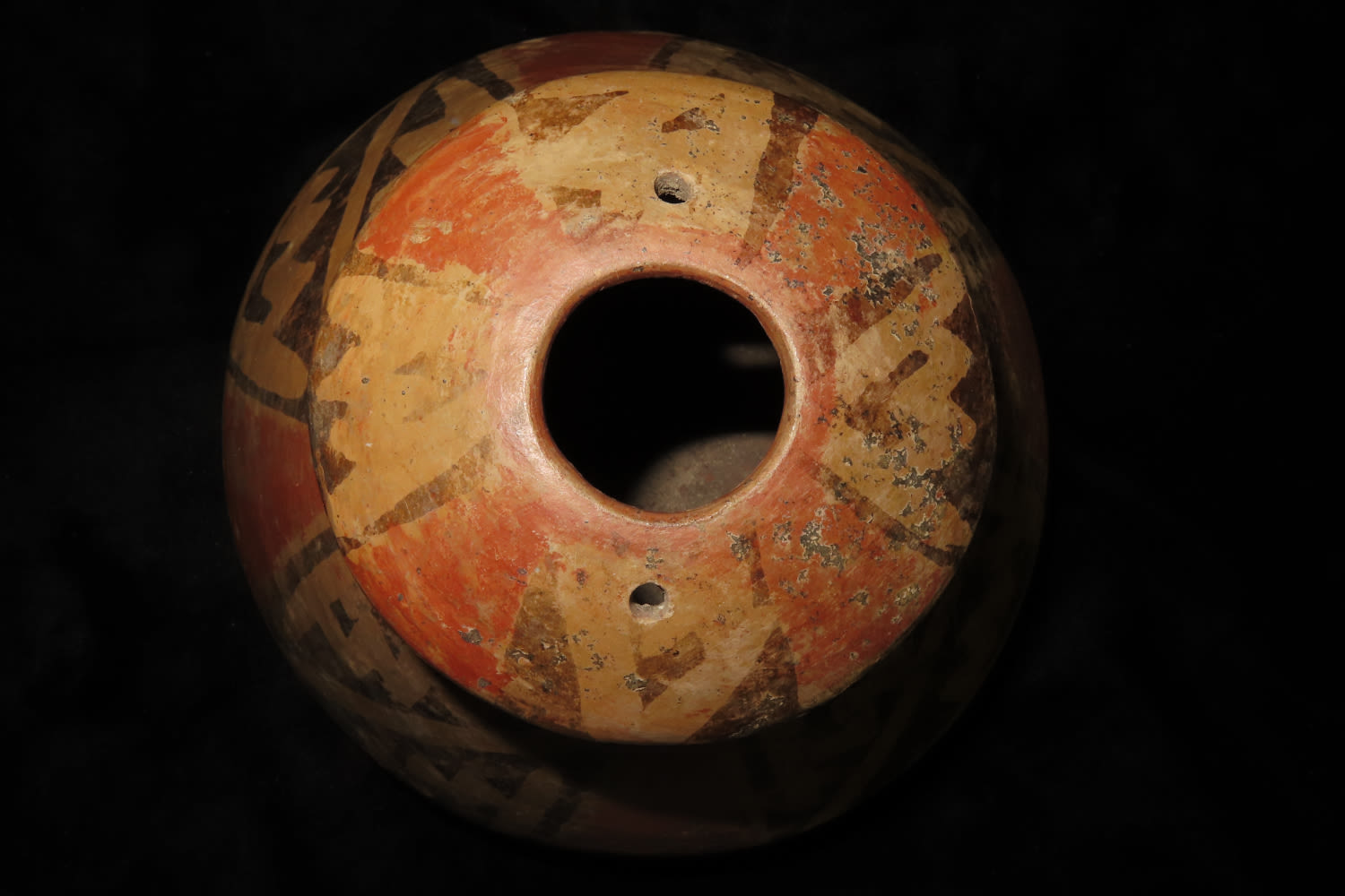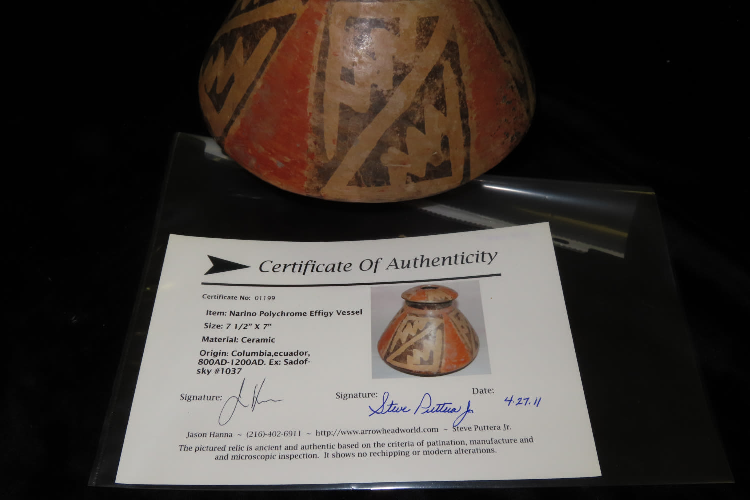 Narino Polychrome Vessel, 7 1/2″ Dia X 6 3/4″ Tall, Columbia/ Equador Area, Nice Form & Finish, Solid with no restoration, two suspension holes on top. Puttera COA