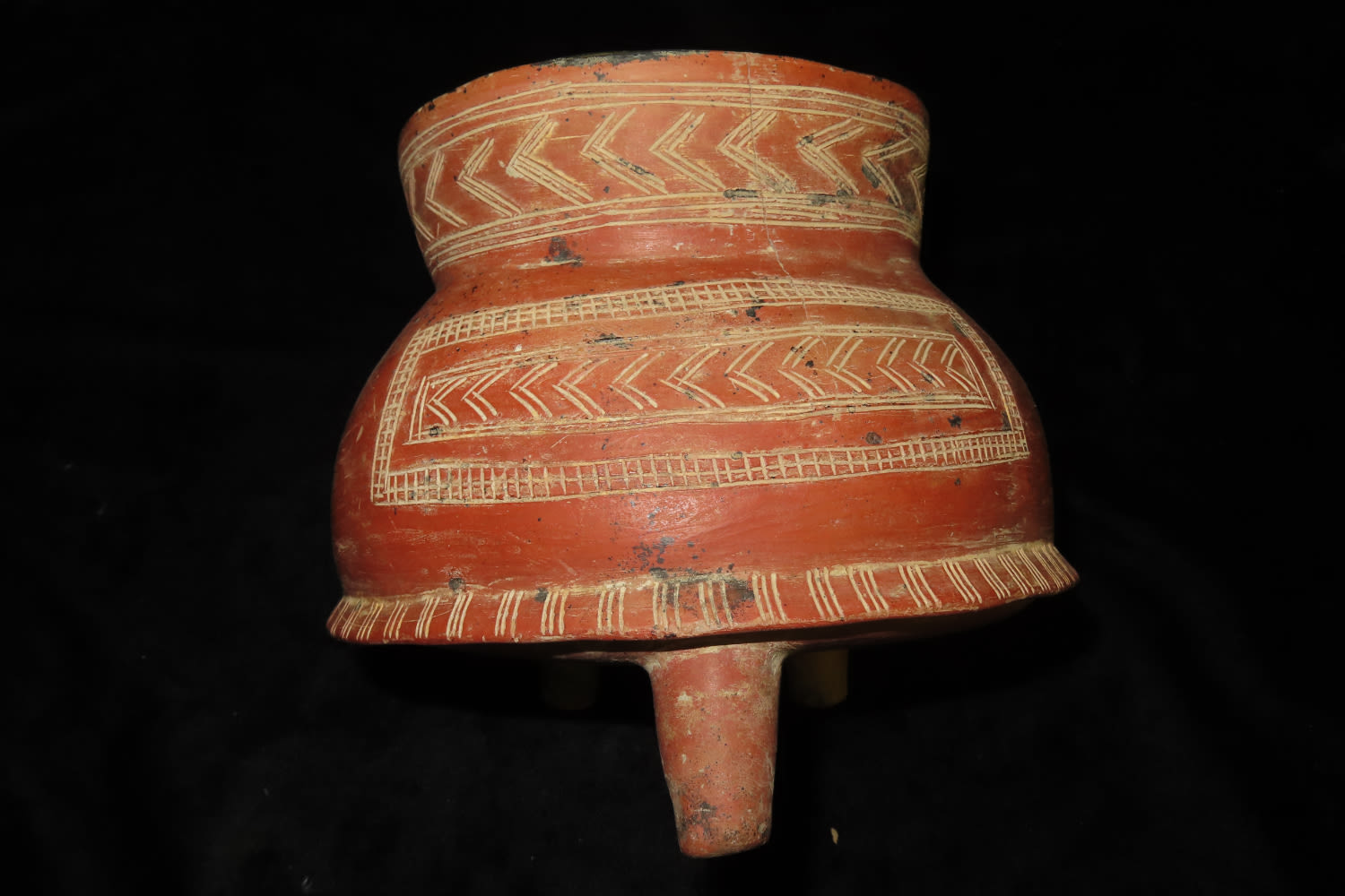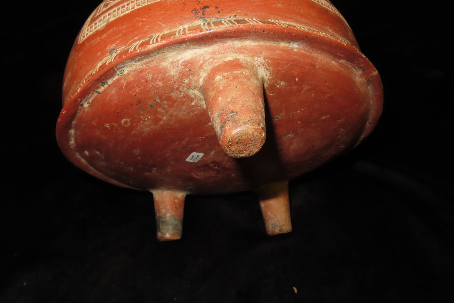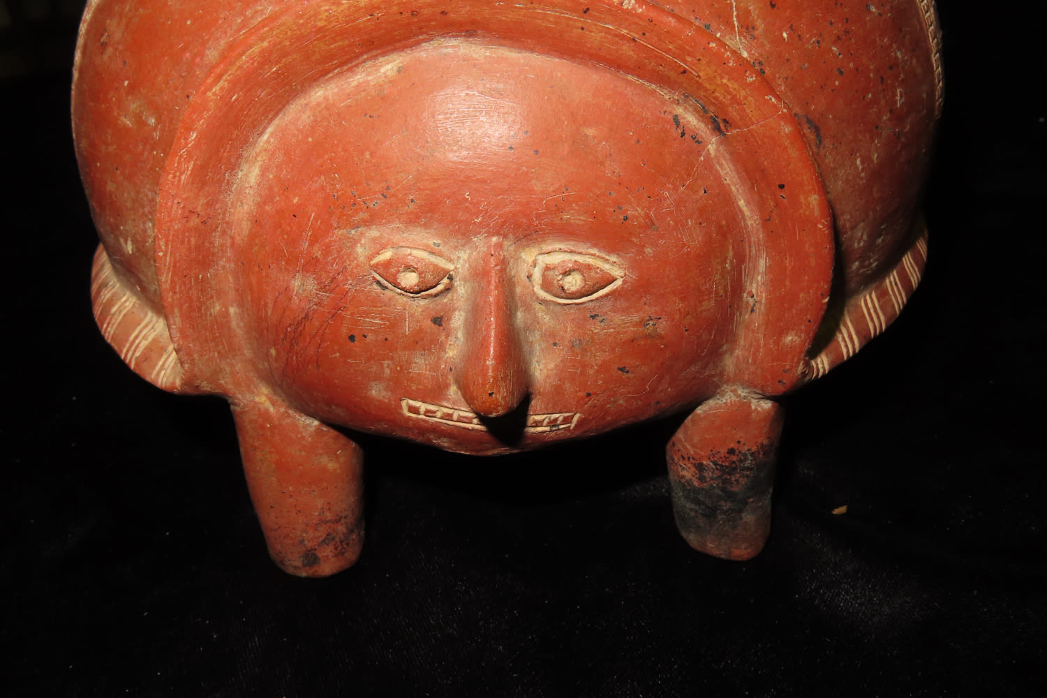 7″ Tall X 7 5/8″ Dia Human Figural Tripod from Ancient Colima, Culture, Mexico. Nice Emsising to body, No Restoration, Thin fine Finish