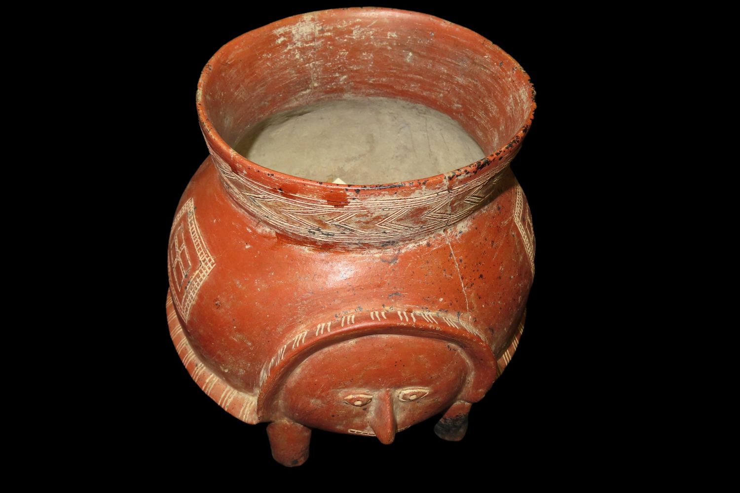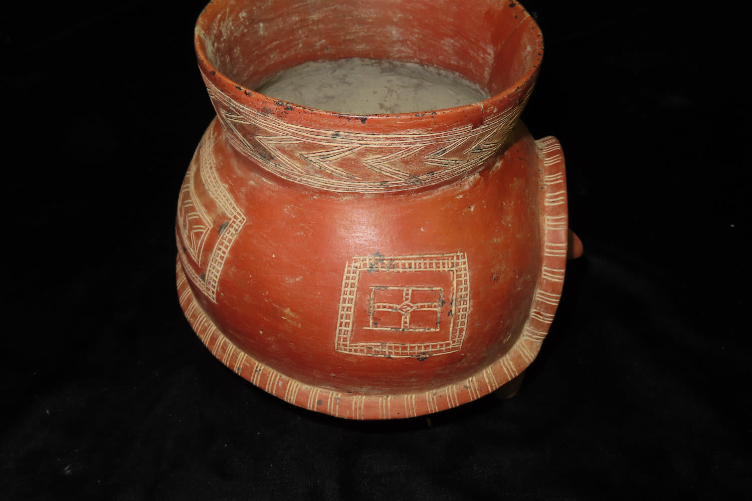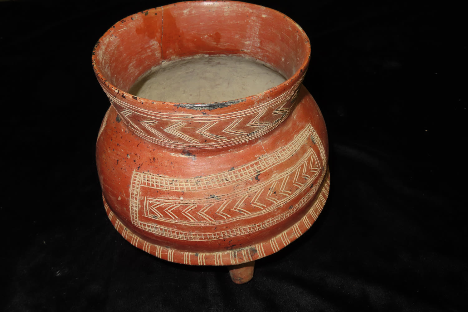 7″ Tall X 7 5/8″ Dia Human Figural Tripod from Ancient Colima, Culture, Mexico. Nice Emsising to body, No Restoration, Thin fine Finish