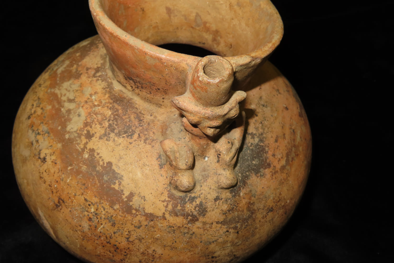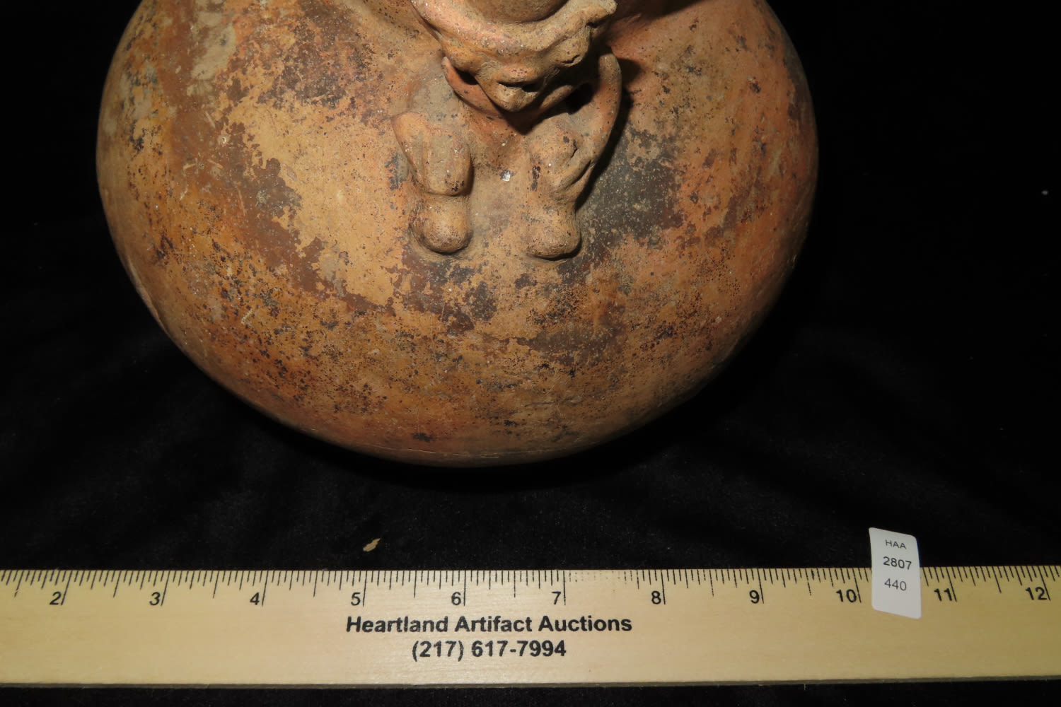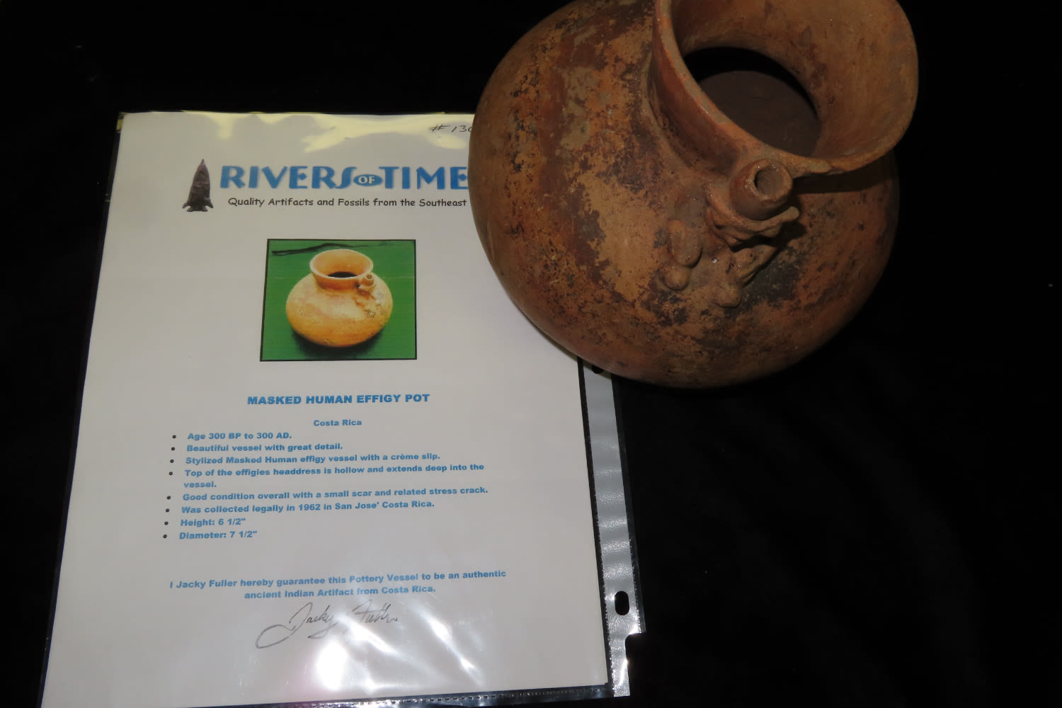 Effigy Bottle 6 3/8″ Tall x 7 1/4″ Dia Masked Human Effigy Bottle, Found Nicoya Costa Rica, Prior to 1963. 200-600 AD Has probe scar and stress cracks, otherwise solid with No restoration Caddo COA & Rivertine COA