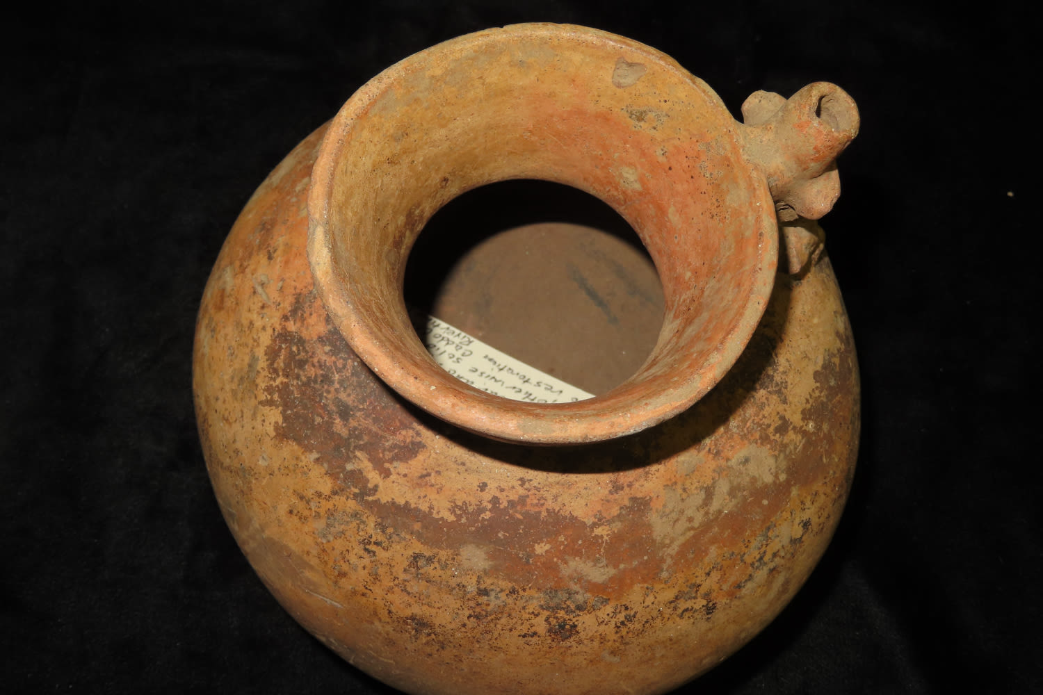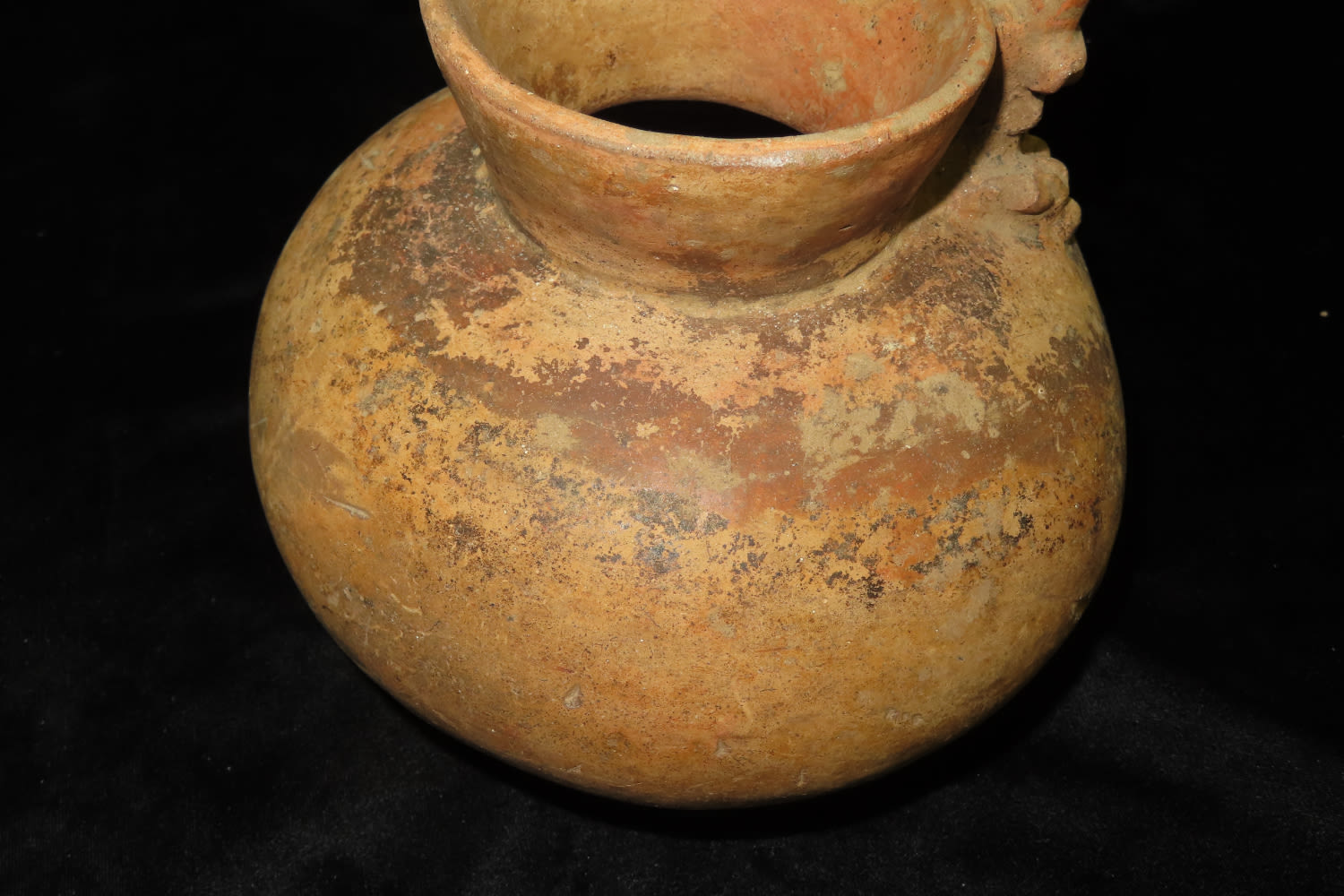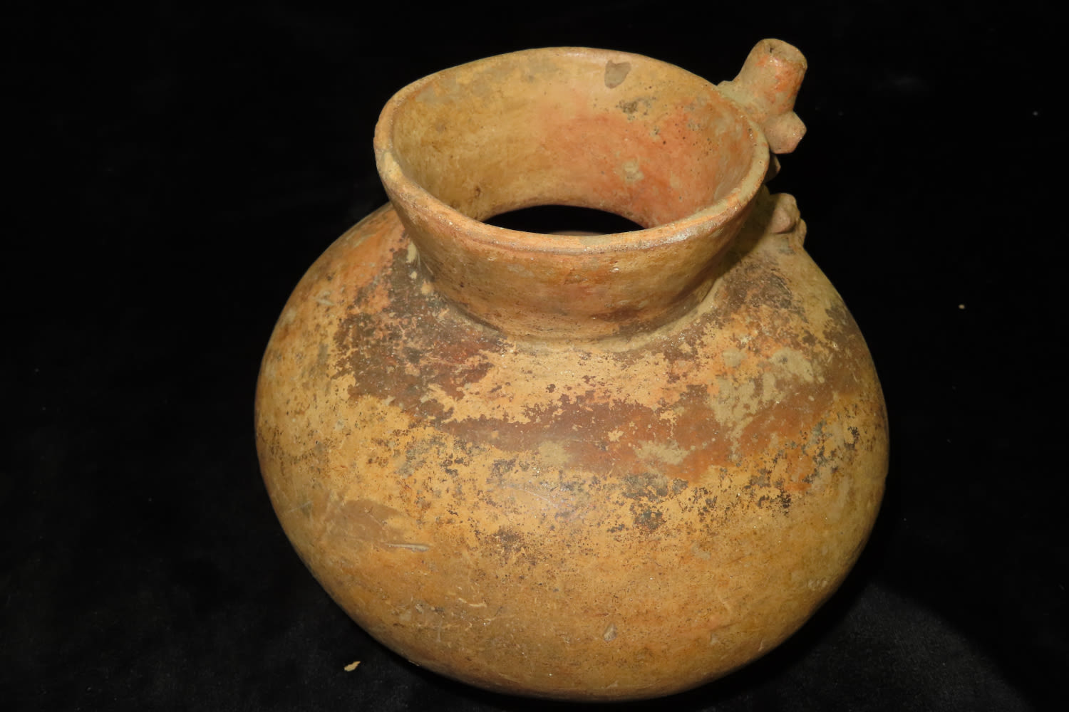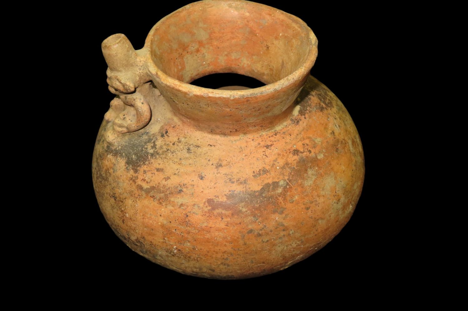 Effigy Bottle 6 3/8″ Tall x 7 1/4″ Dia Masked Human Effigy Bottle, Found Nicoya Costa Rica, Prior to 1963. 200-600 AD Has probe scar and stress cracks, otherwise solid with No restoration Caddo COA & Rivertine COA
