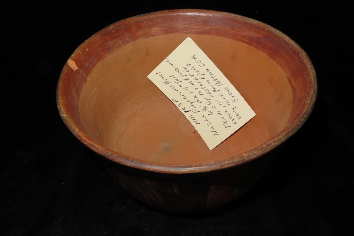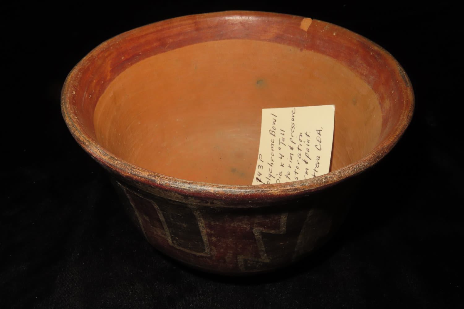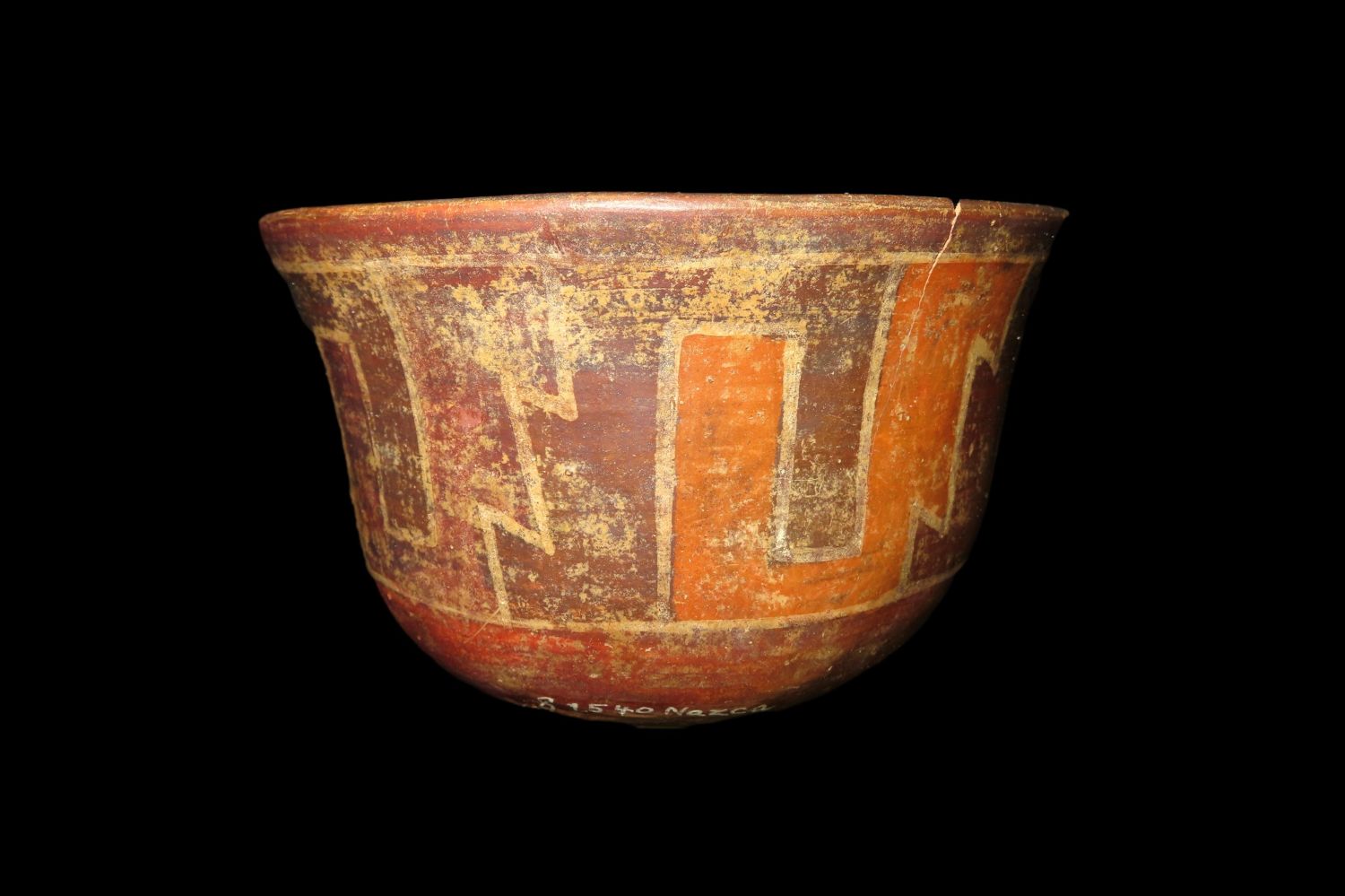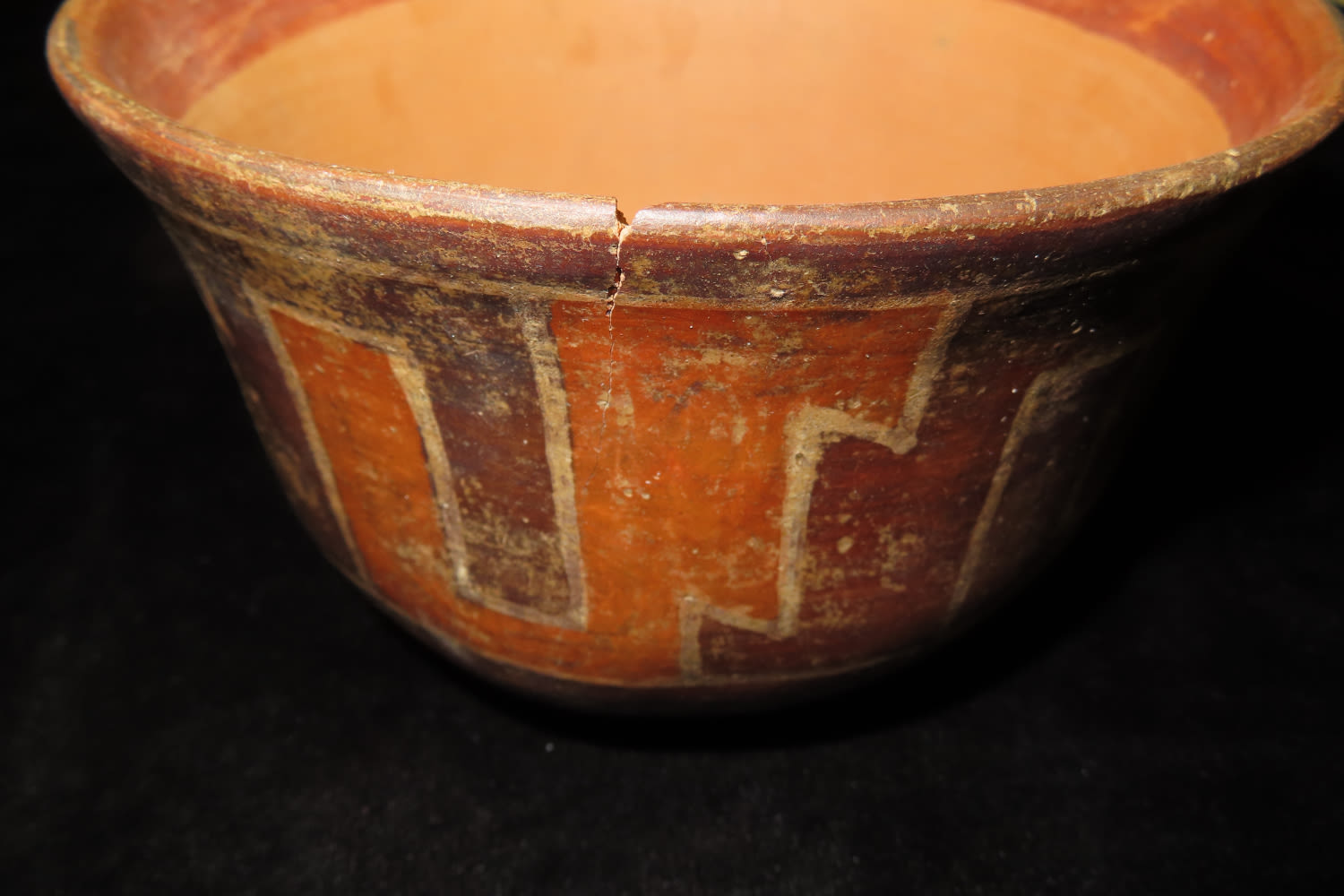 Nazca Polychrom Bowl, 6 1/8″ dia X 4″ Tall, Peru, Chip to rim & pressure crack, no restoration, very nice form & paint, Steve Puttera COA