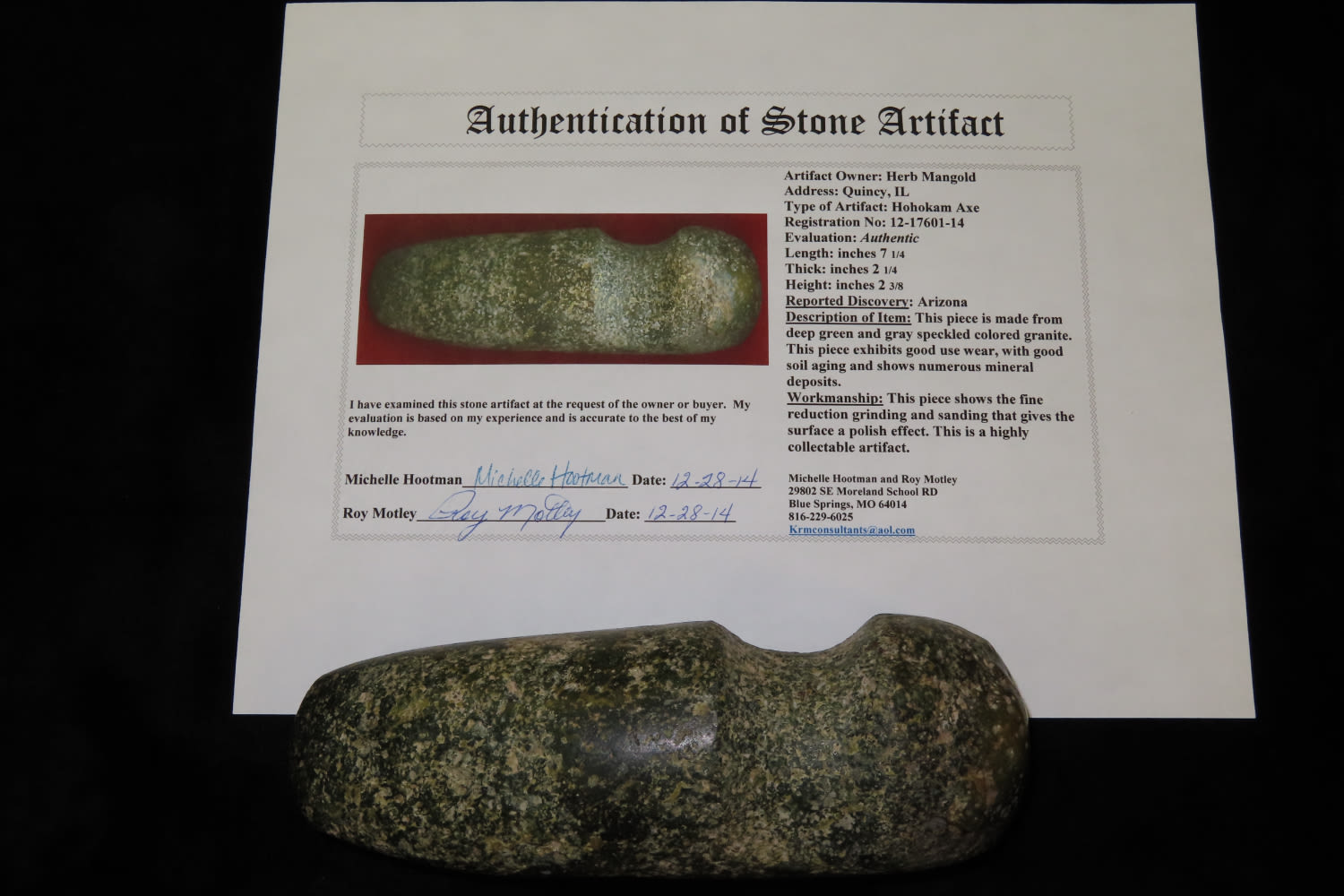 7 1/4″ Hohokam Axe Arizona Motley COA Ex Herb Mangold Collection