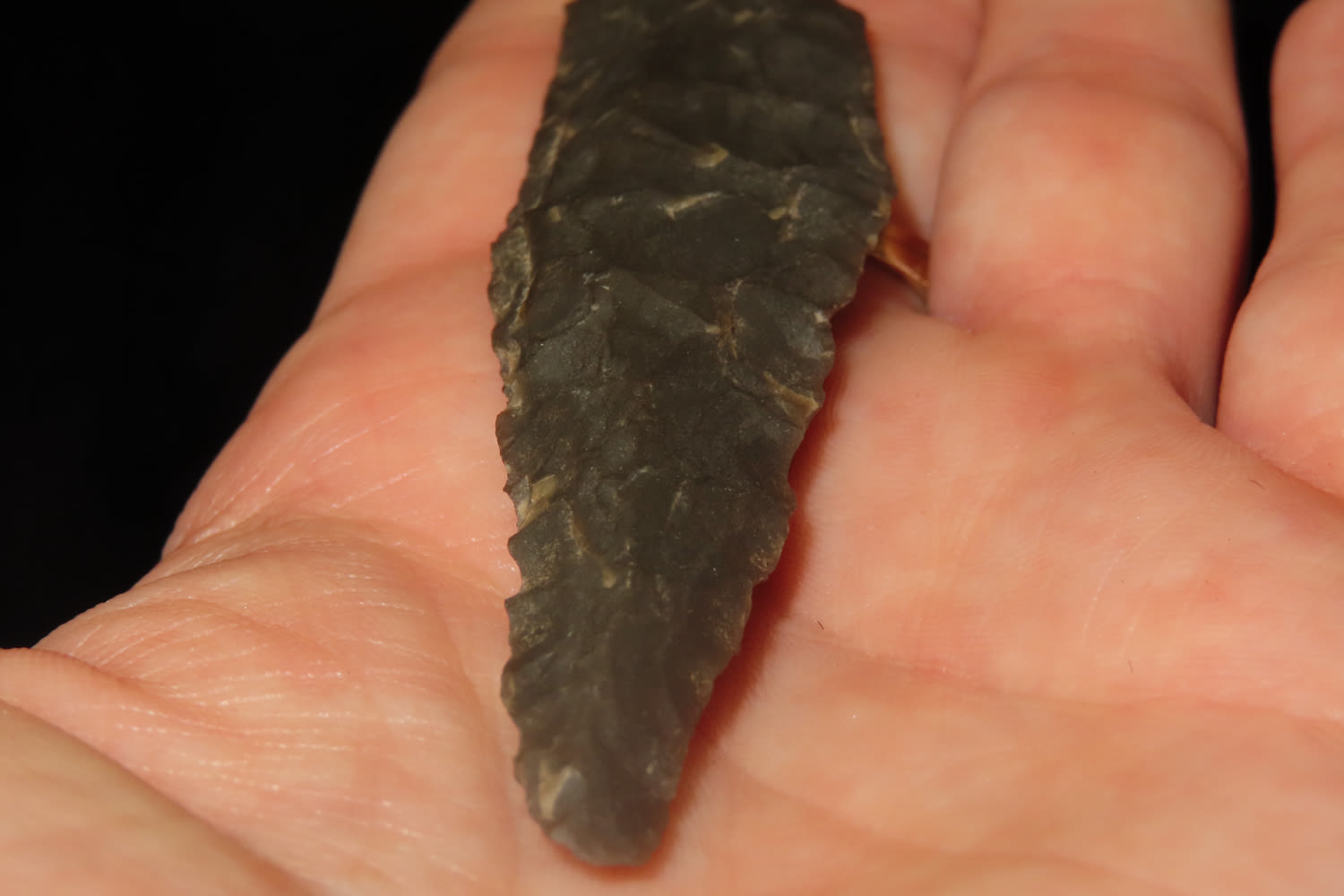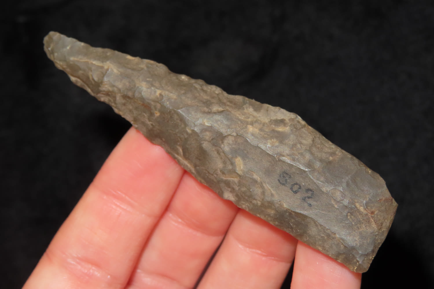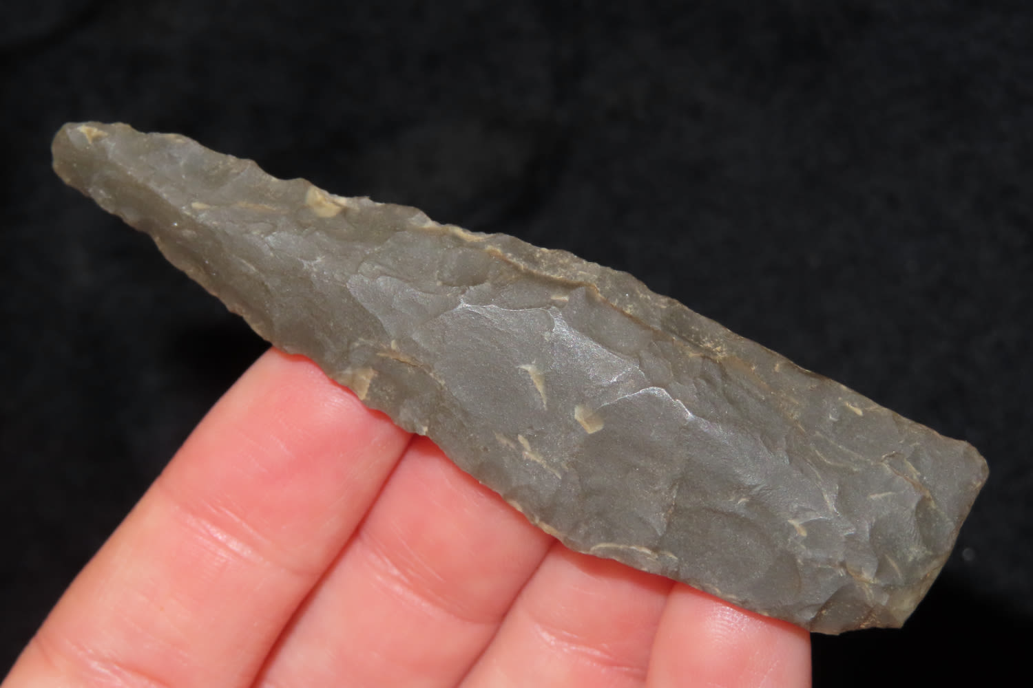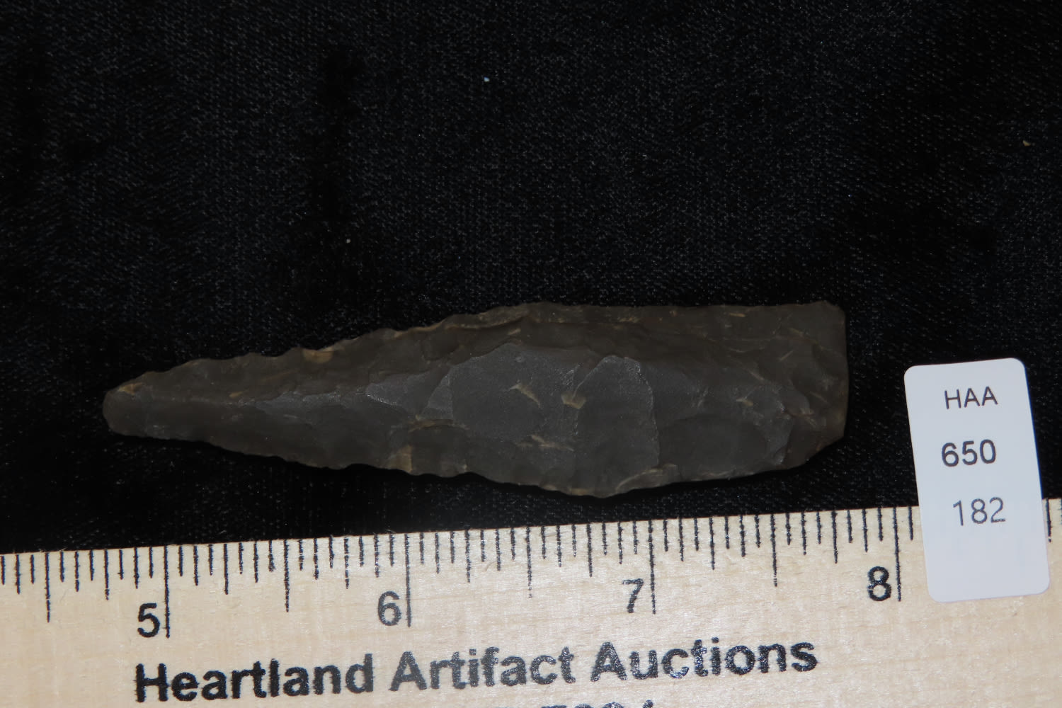 3″ Agate Basin Drilll with heavily ground base made out of gray Novaculite found in southern Illinois EX. Sam Wasion collection Authentic Native American Artifact