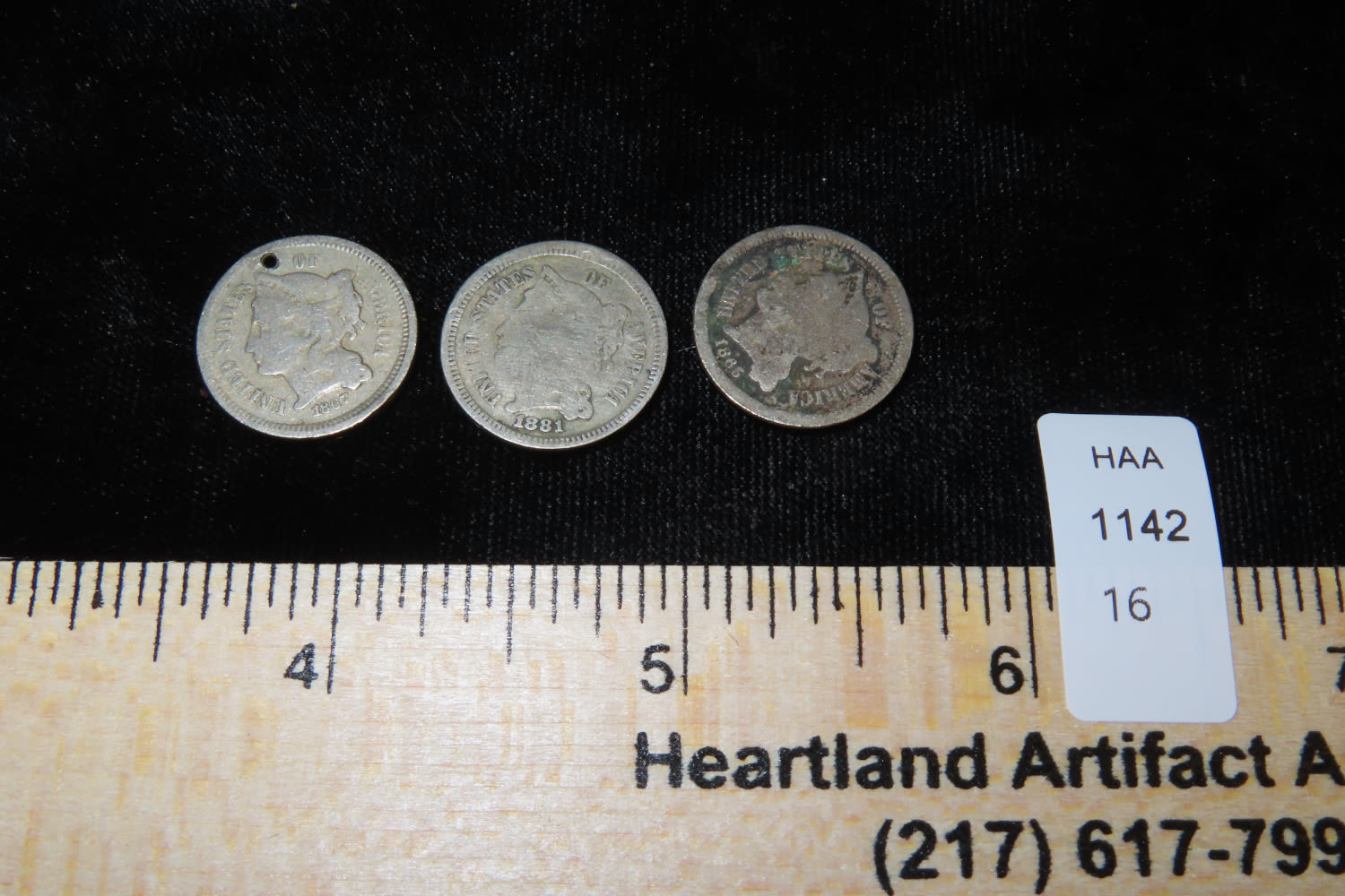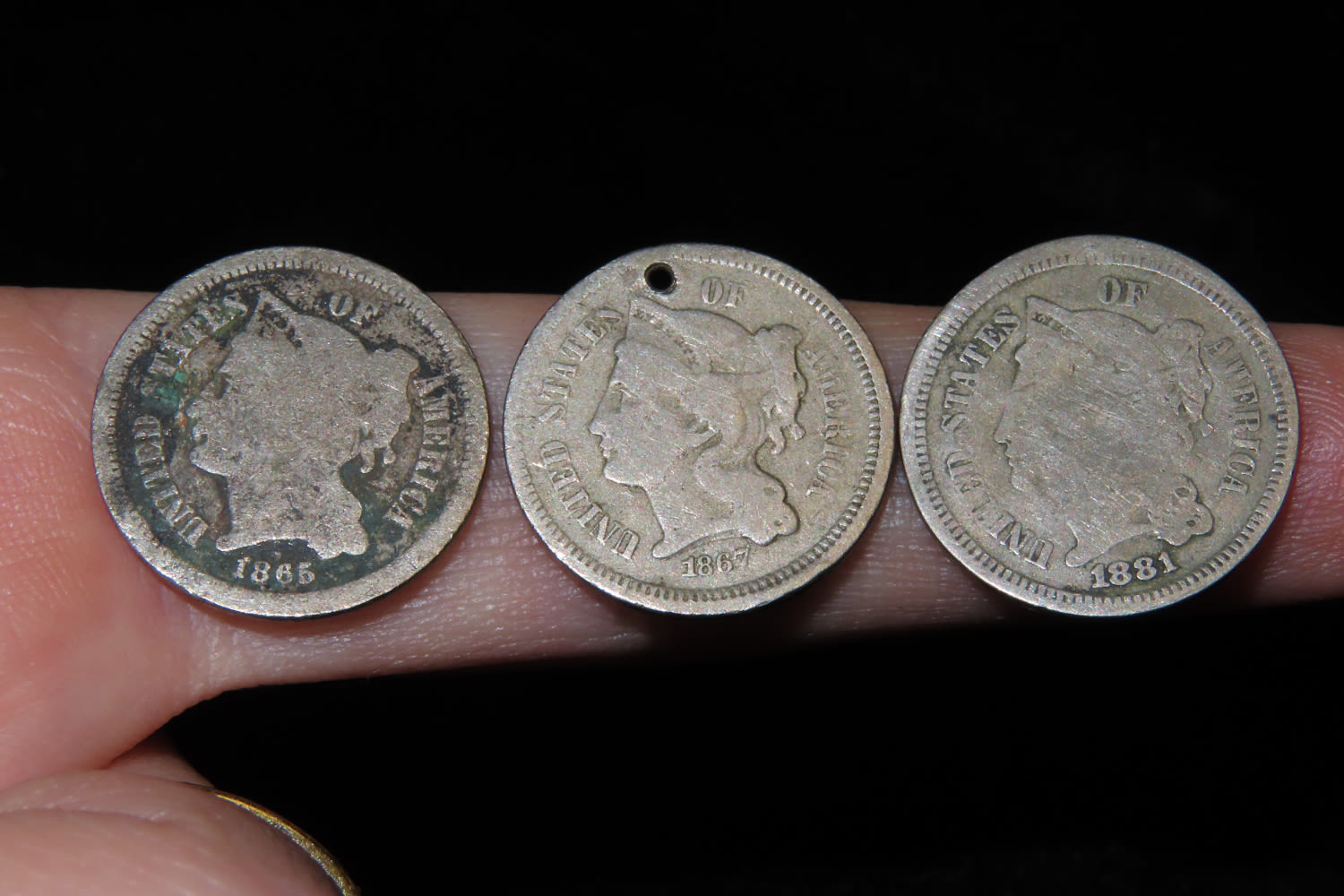Lot of 3 United States 3 cent coins, one with hole Drillled in it