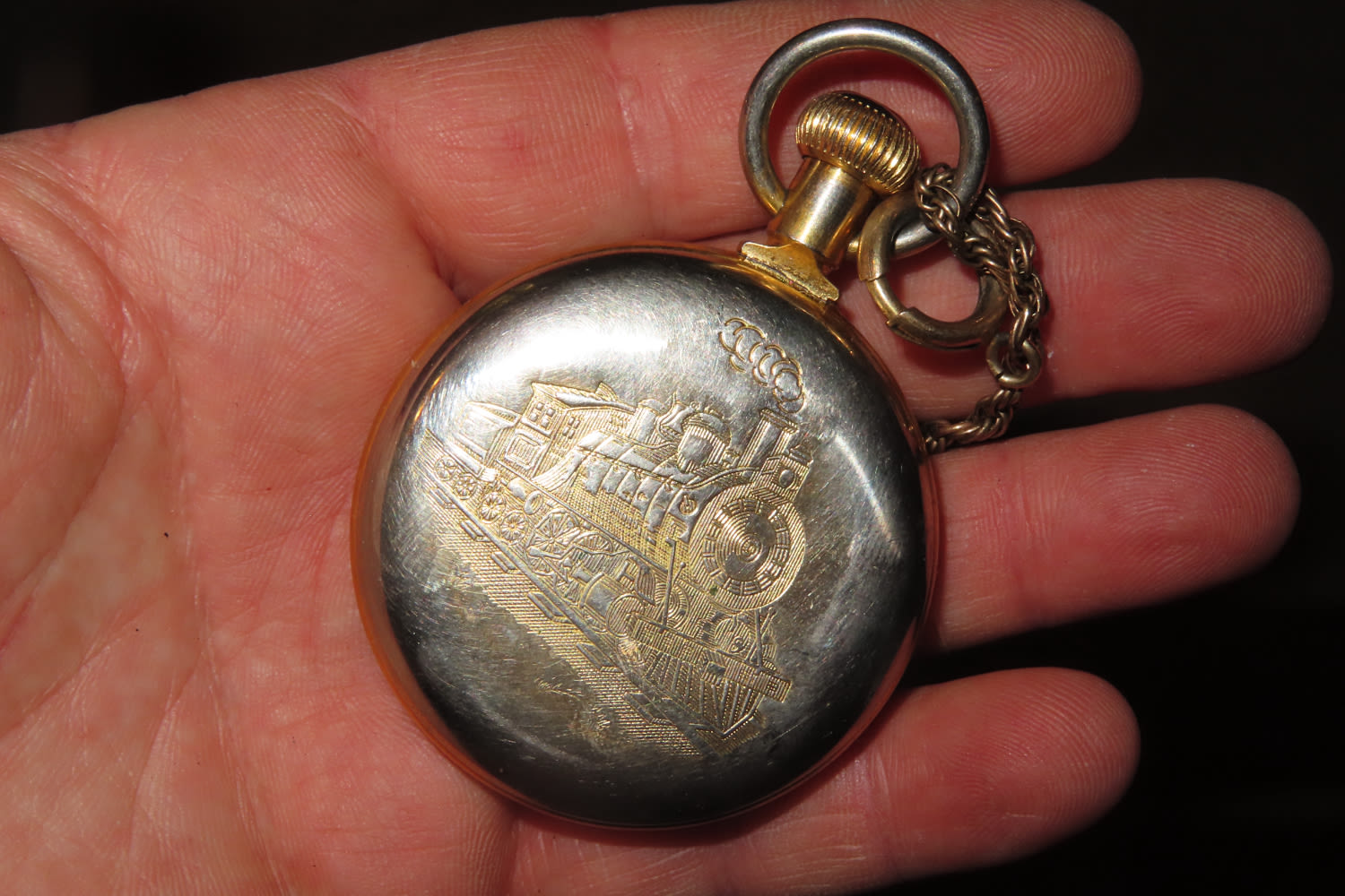 VINTAGE WESTCLOX POCKET WATCH WITH A TRAIN ENSCRIBED ON THE BACK