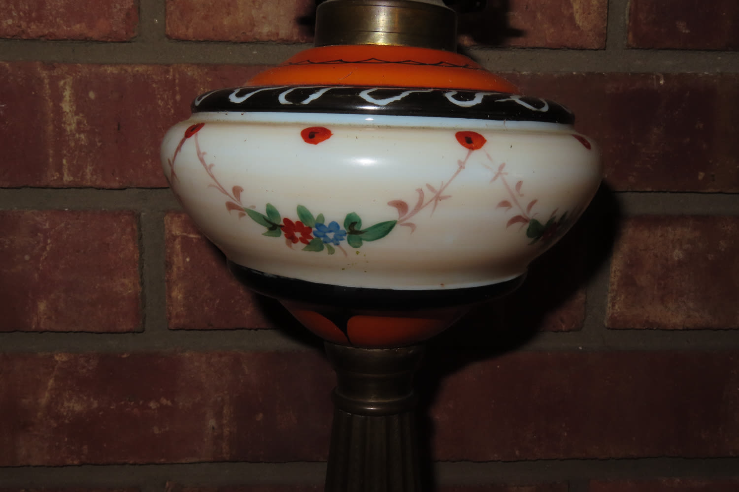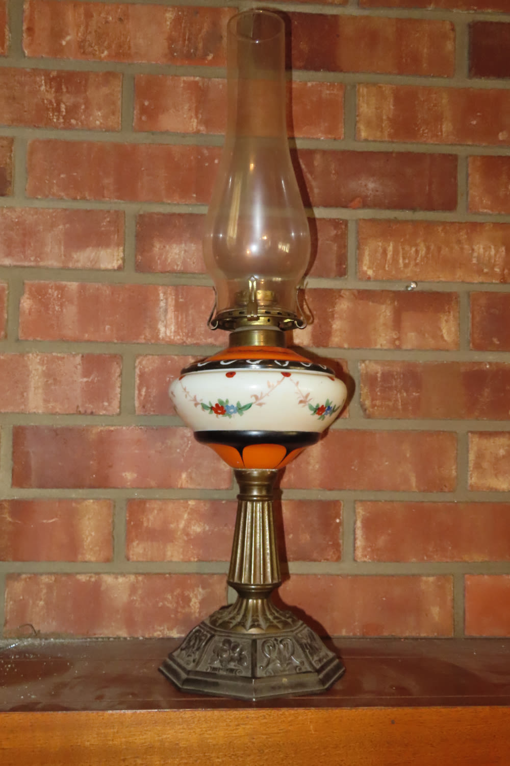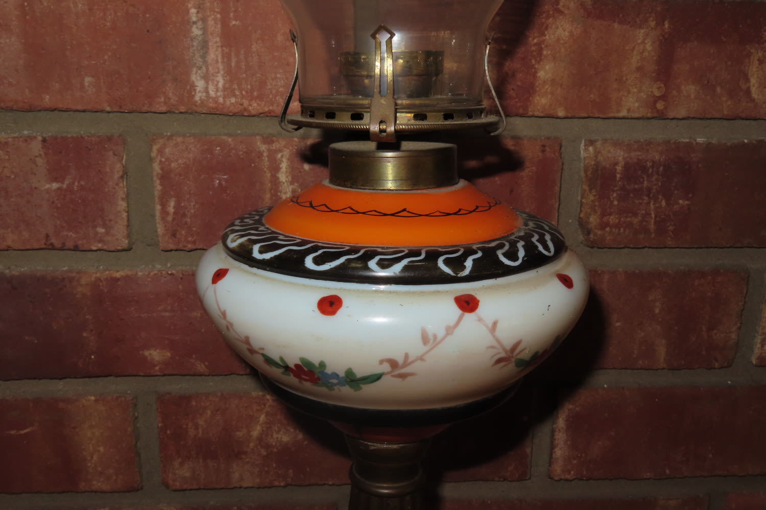 VERY NICELY PAINTED GLASS WITH METAL BASE ANTIQUE OIL LAMP