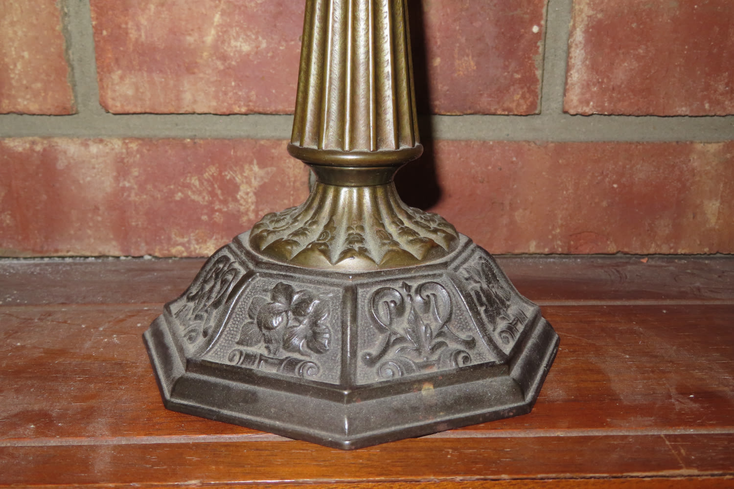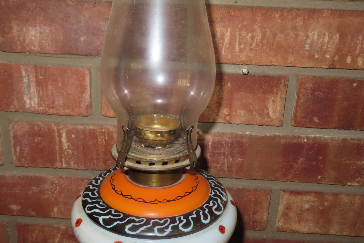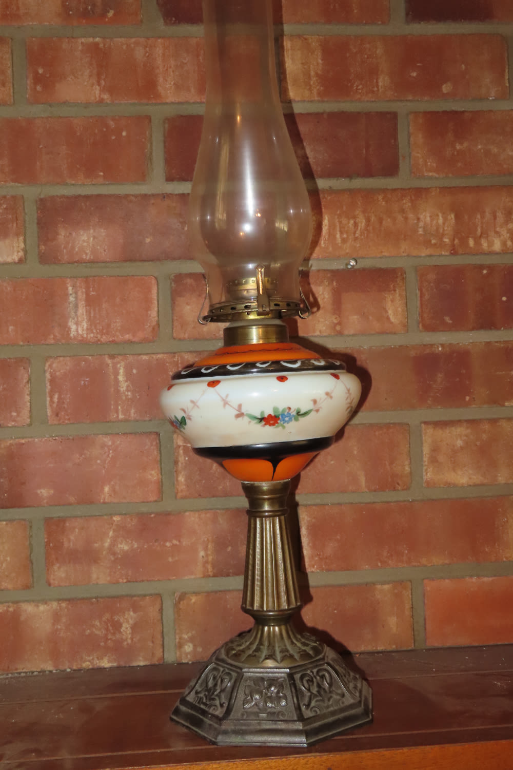 VERY NICELY PAINTED GLASS WITH METAL BASE ANTIQUE OIL LAMP