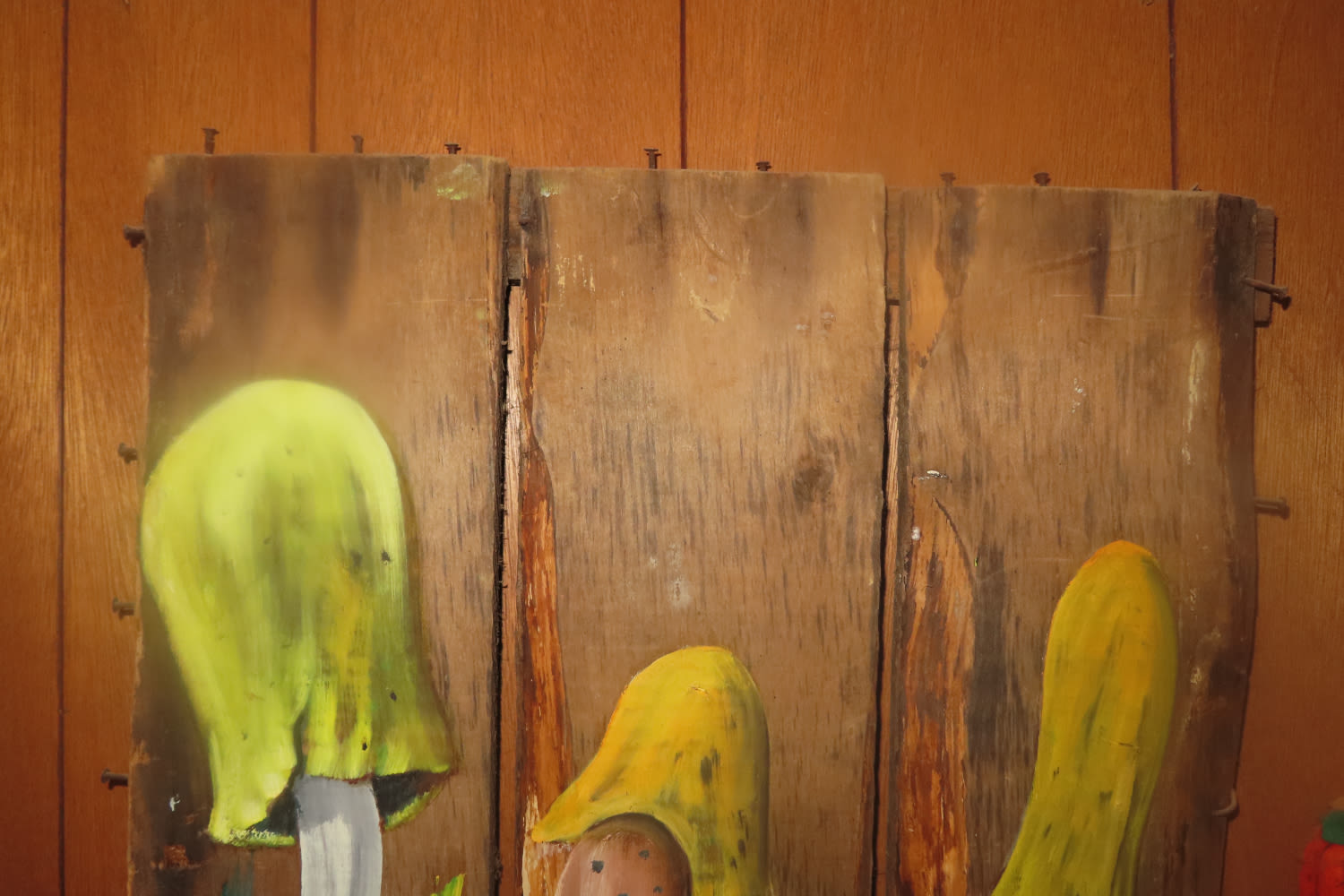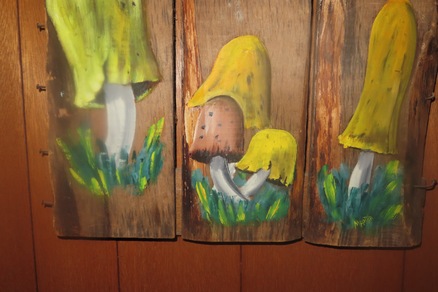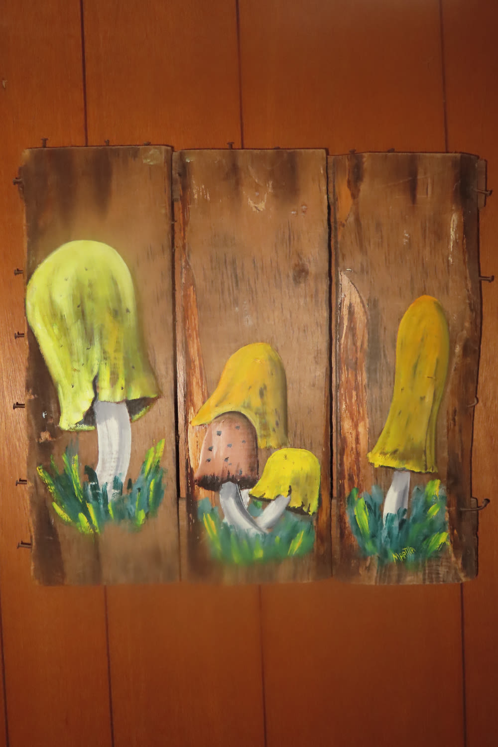 VINTAGE PAINTING OF MUSHROOMS ON BARNWOOD ARTWORK MEASURES 16" X 16 1/2"