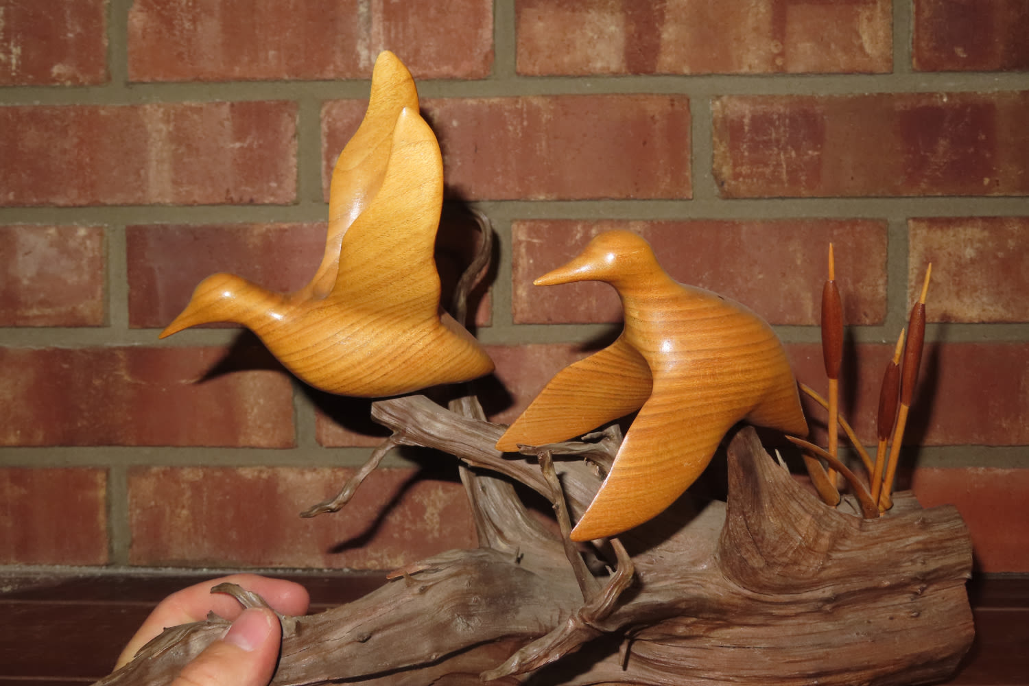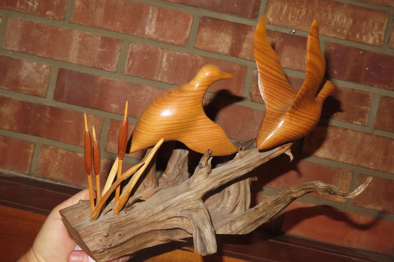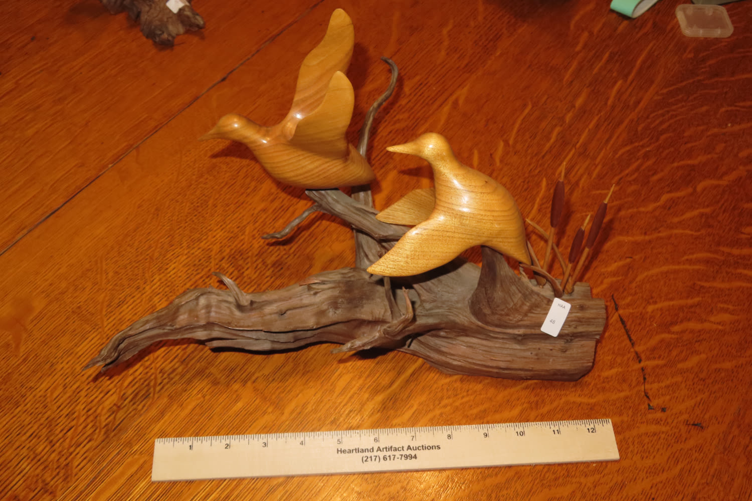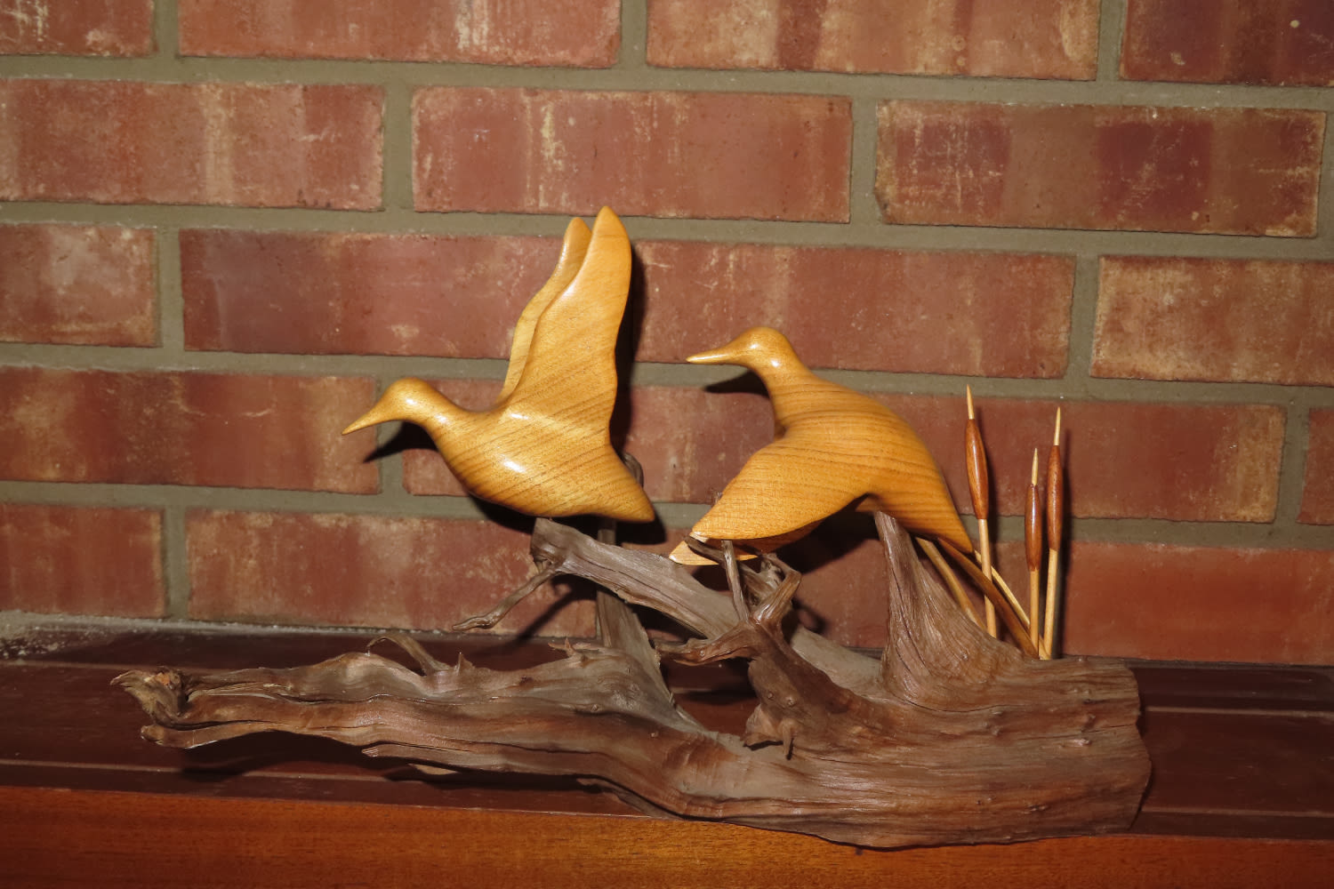 DRIFTWOOD PIECE WITH CARVED DUCKS DISPLAY APPROX 13 1/2″ LONG