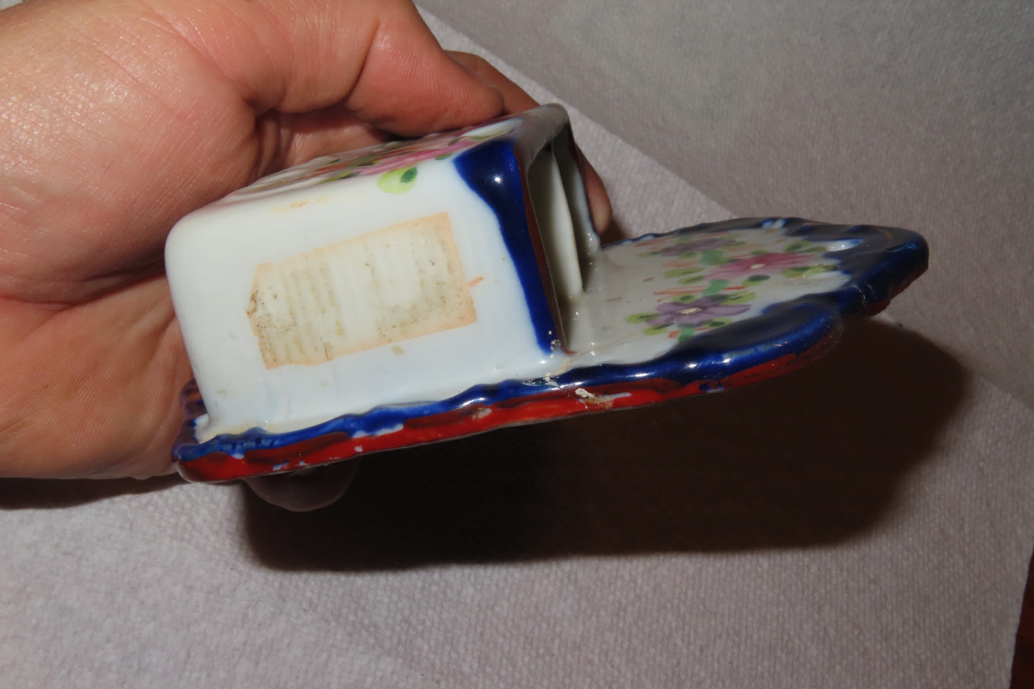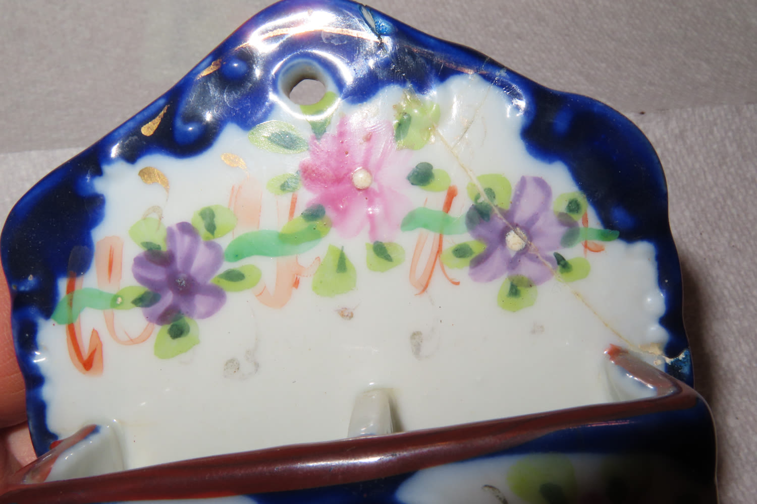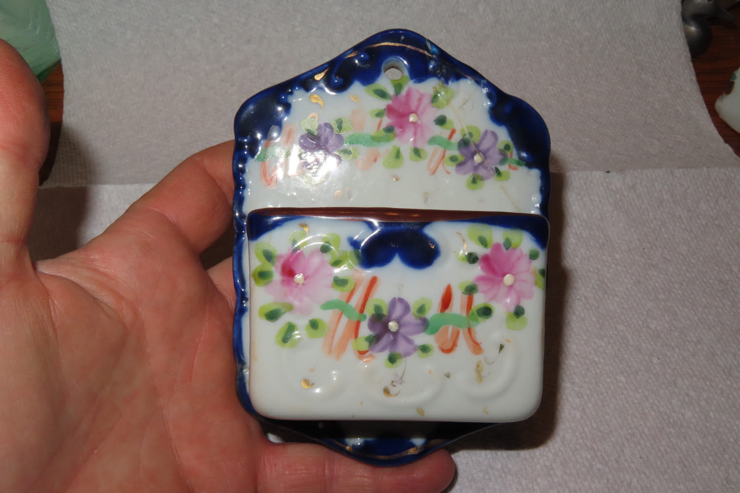 ANTIQUE HAND PAINTED VICTORIAN PORCELAIN/BISQUE DOUBLE STRIKER WALL MOUNT MATCH HOLDER BOX POCKET- BROKEN AND GLUED