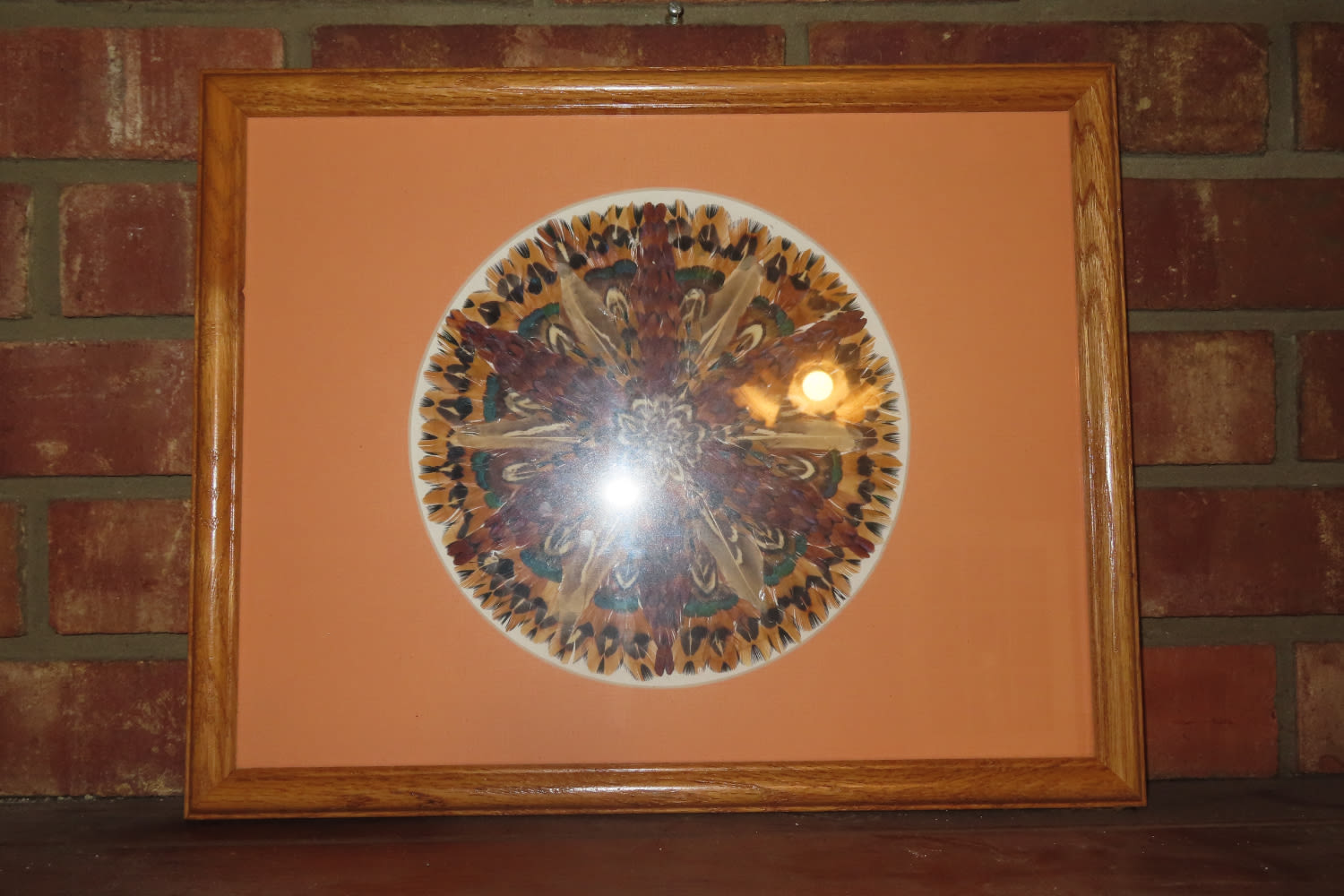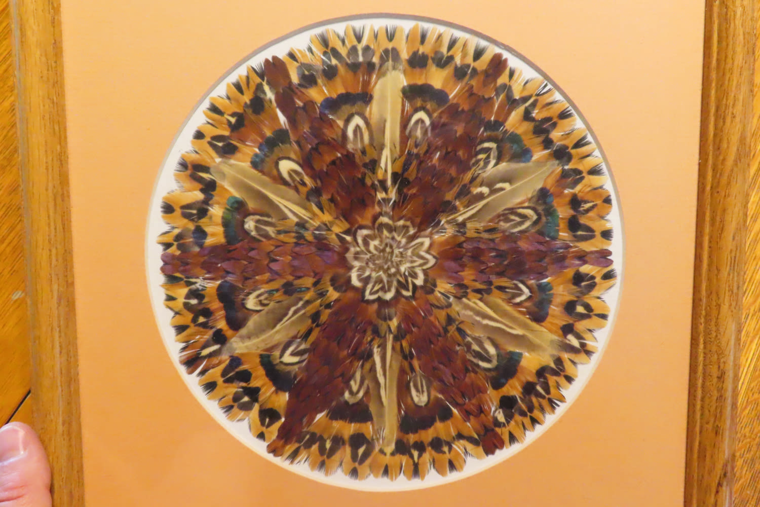 ARTWORK MADE OF PHEASANT FEATHERS DONE BY DORIS VAHLE FRAME MEASURES 15″ BY 12″