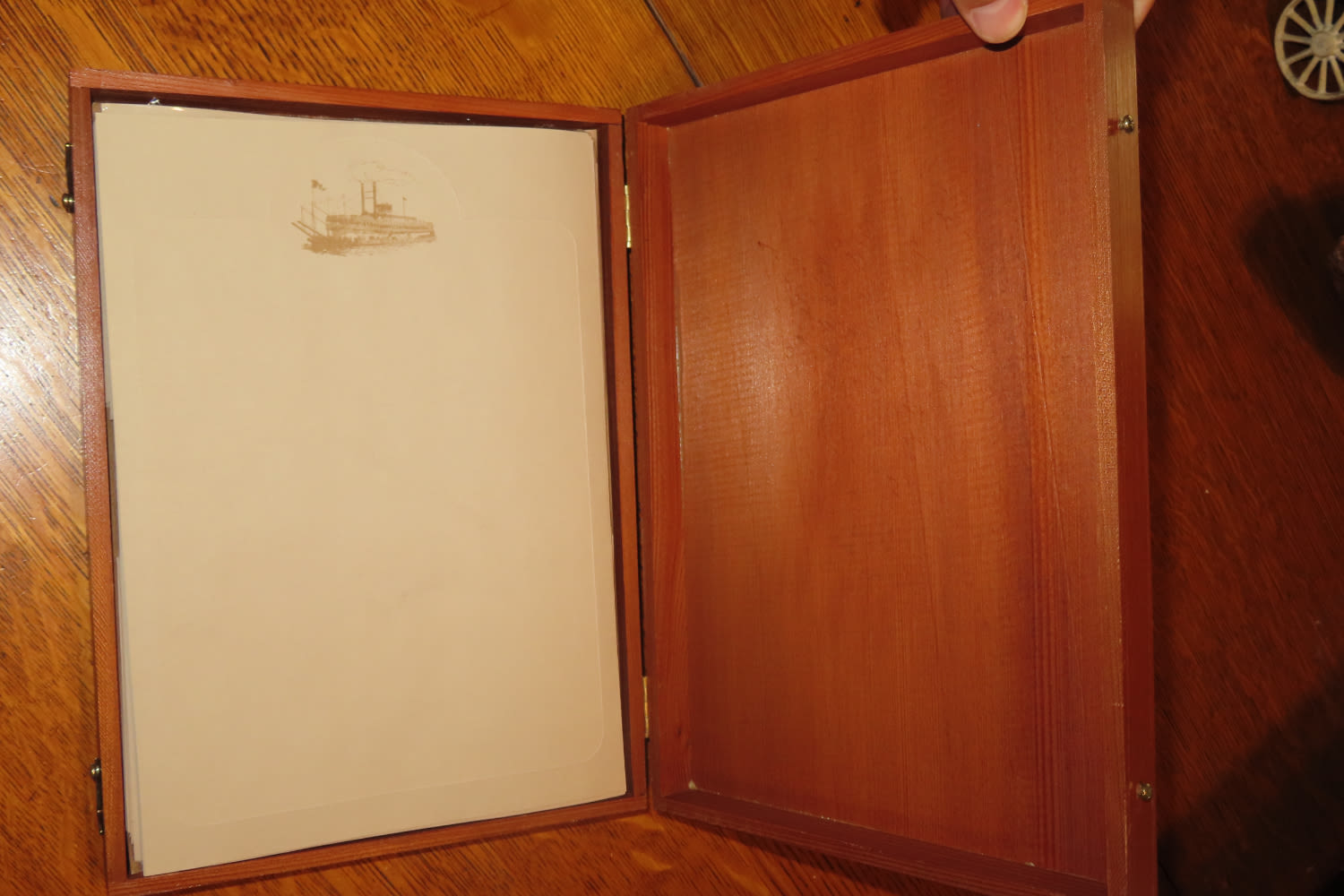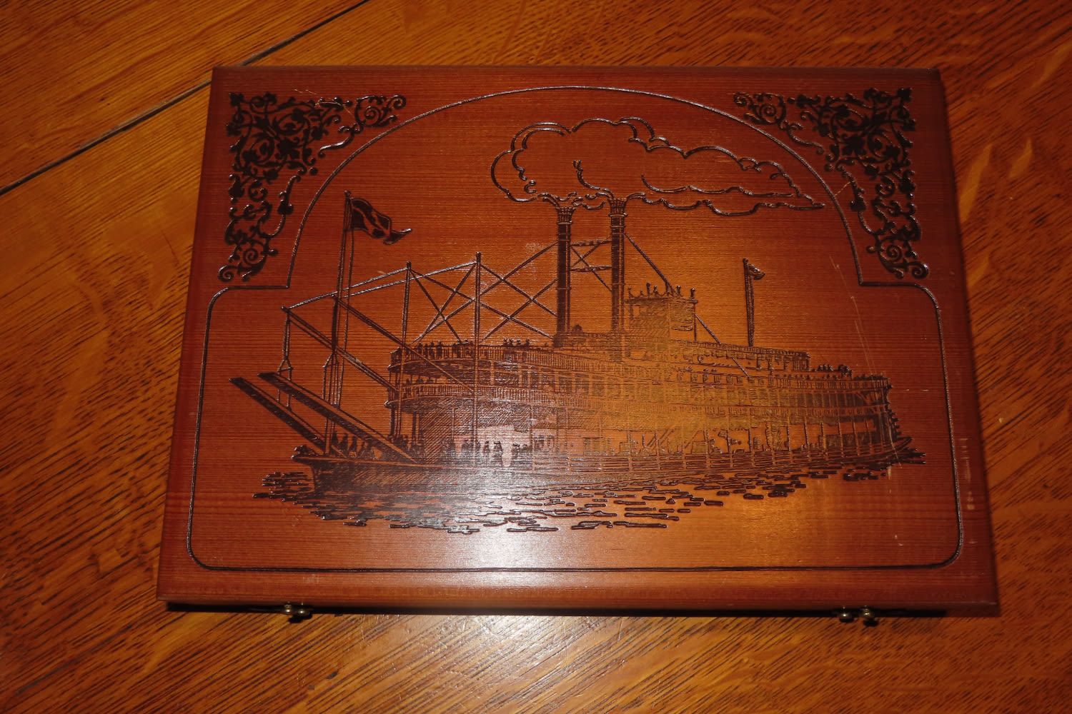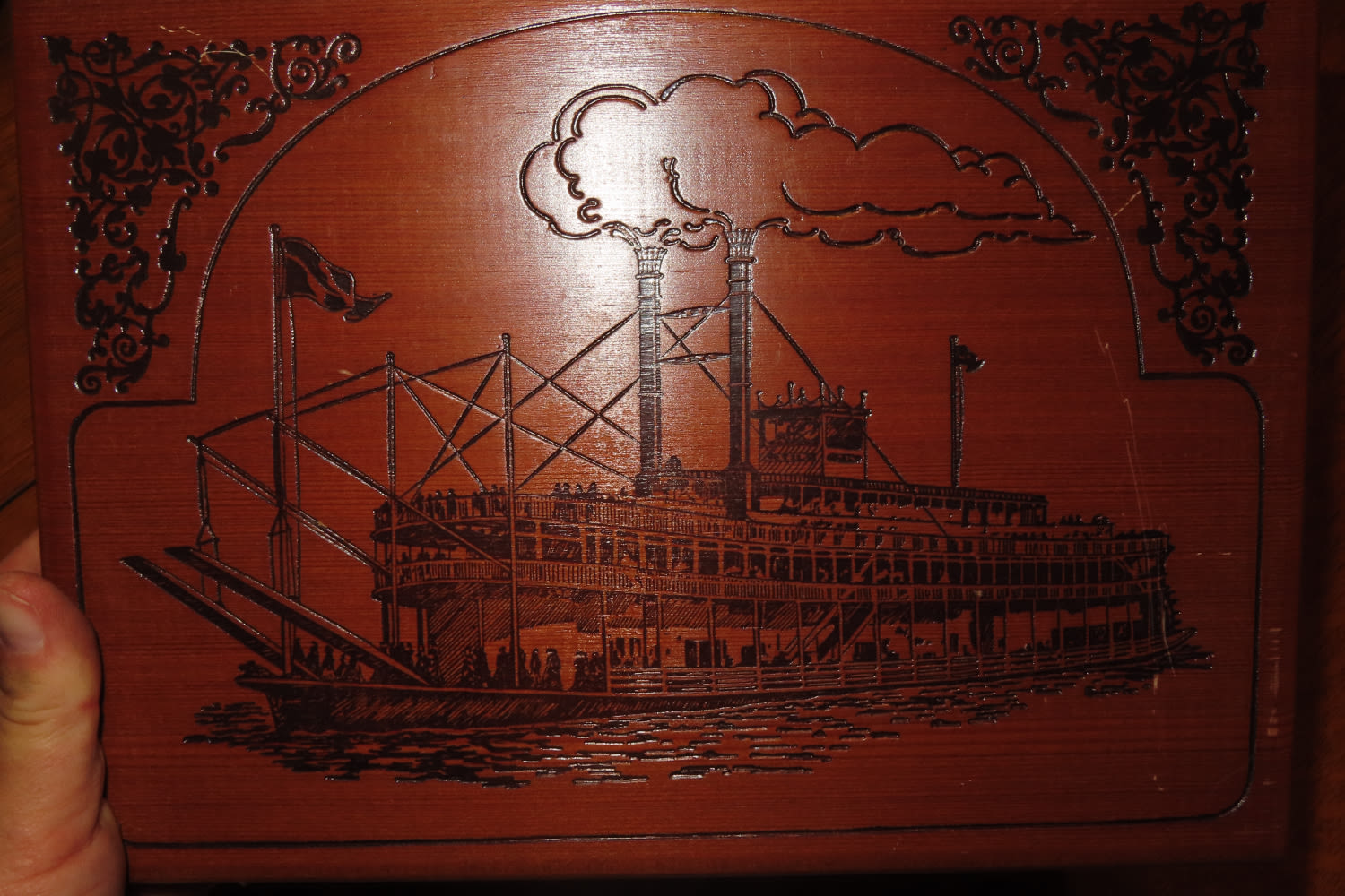 VINTAGE WOODEN STEAMBOAT MISSISSIPPI QUEEN CARVED WOOD BOX WITH STATIONARY