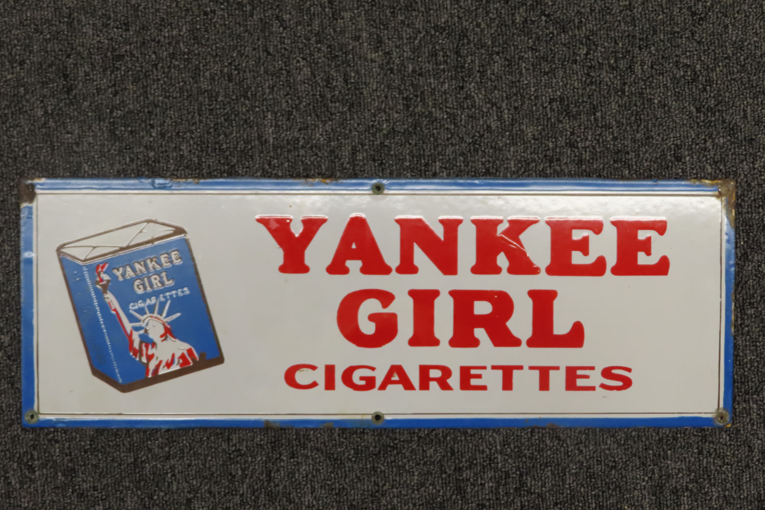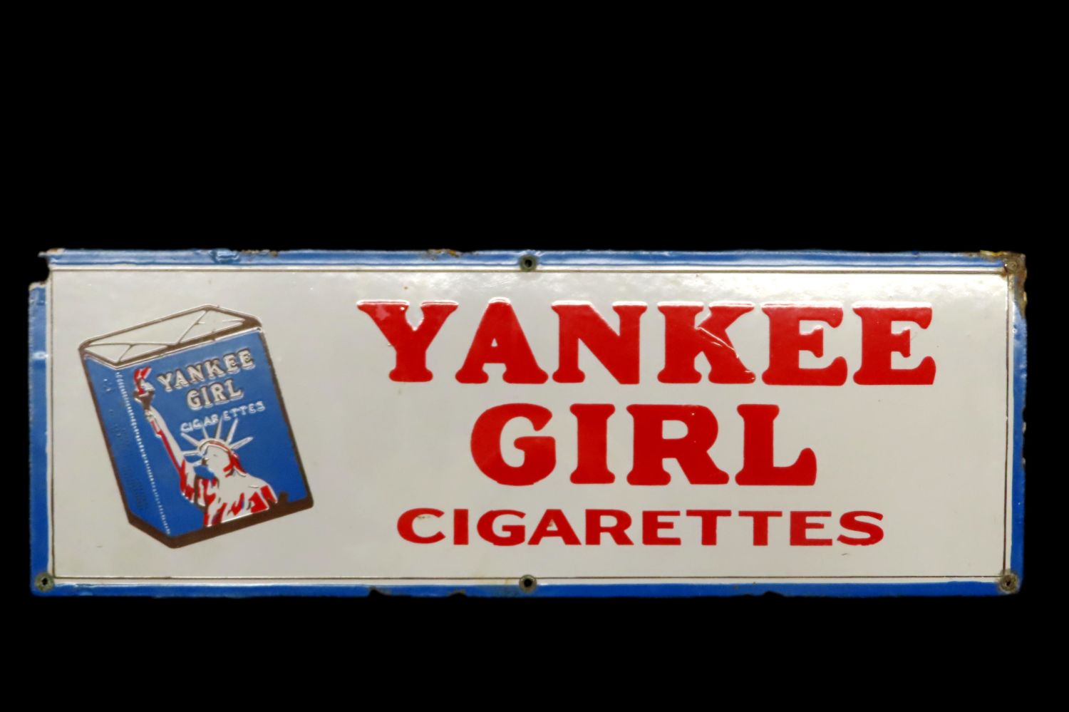 20″ x 7″ Antique Porcelain Sign YANKEE GIRL CIGARETTES out of the Jim Millard Collection, South East Iowa / North East Missouri