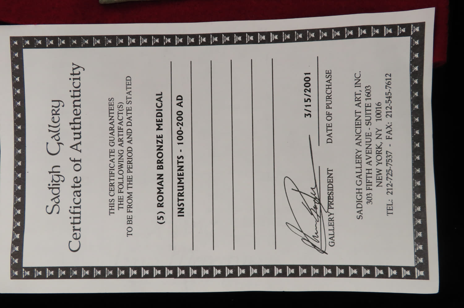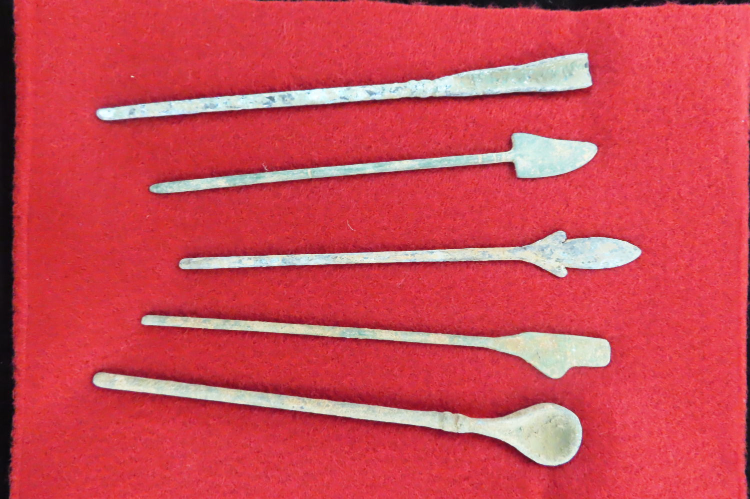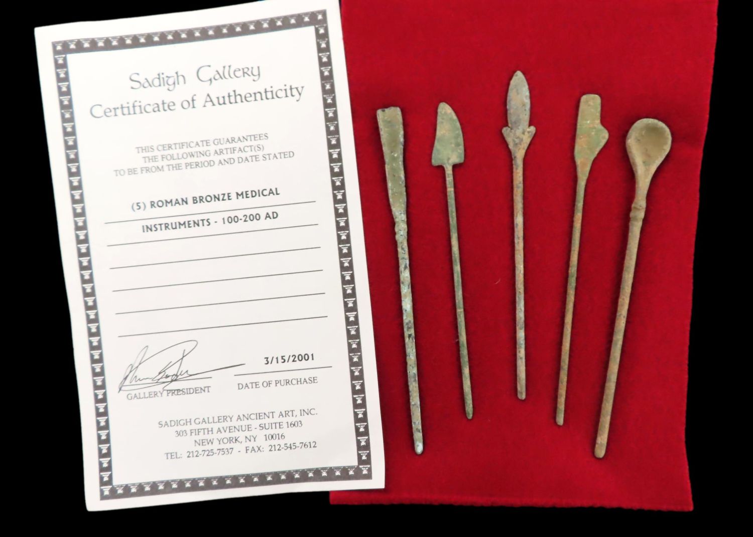 5 Roman Bonze Medical Instruments. 100-200 AD. COA from Sadigh Gallery in NY. Please see photos for size, condition & length
