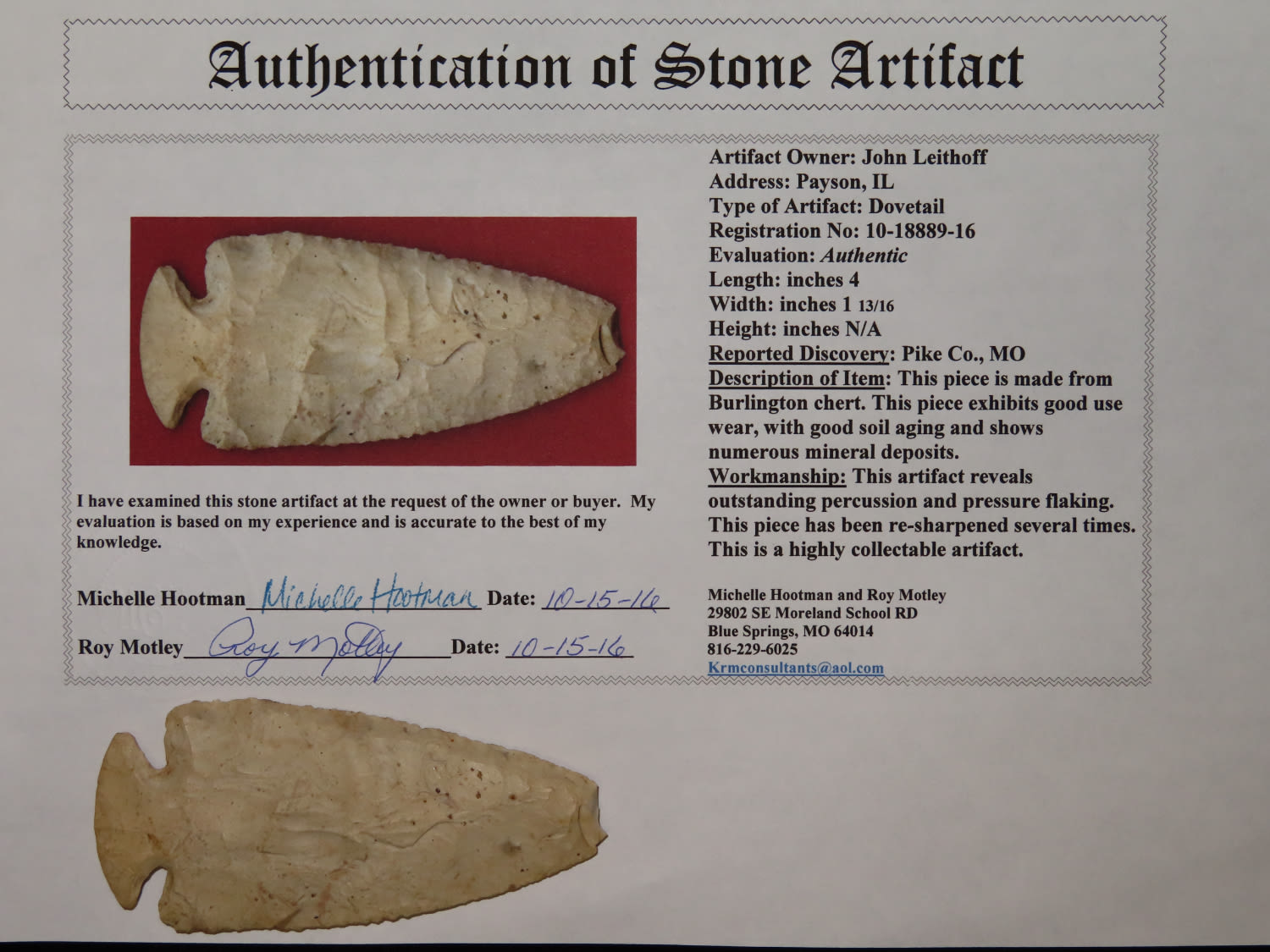 4″ Dovetail. Pike CO., Missouri. Burlington Chert. COA: Roy Motley. Collection of John Leithoff from Payson, Illinois